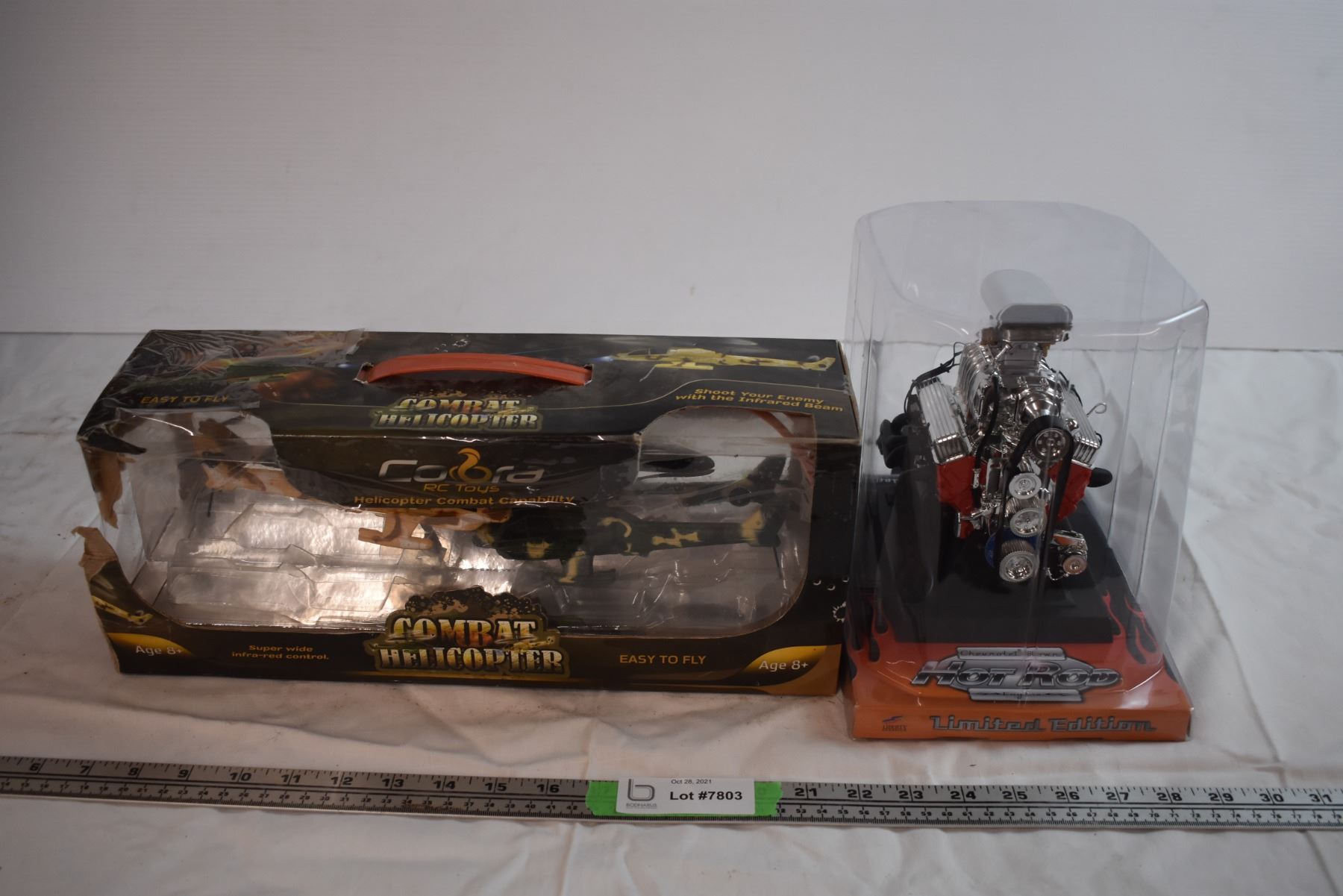 Used Helicopter Toy and Chevrolet Die-Cast Hot Rod Engine