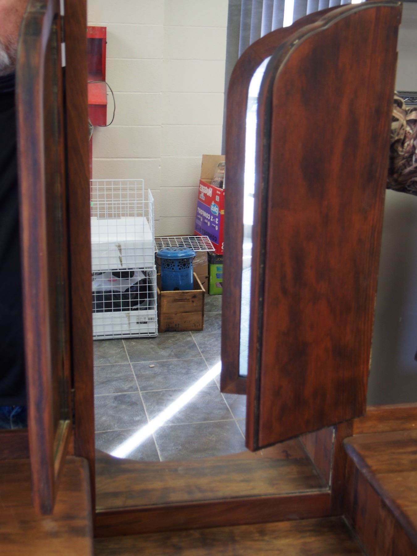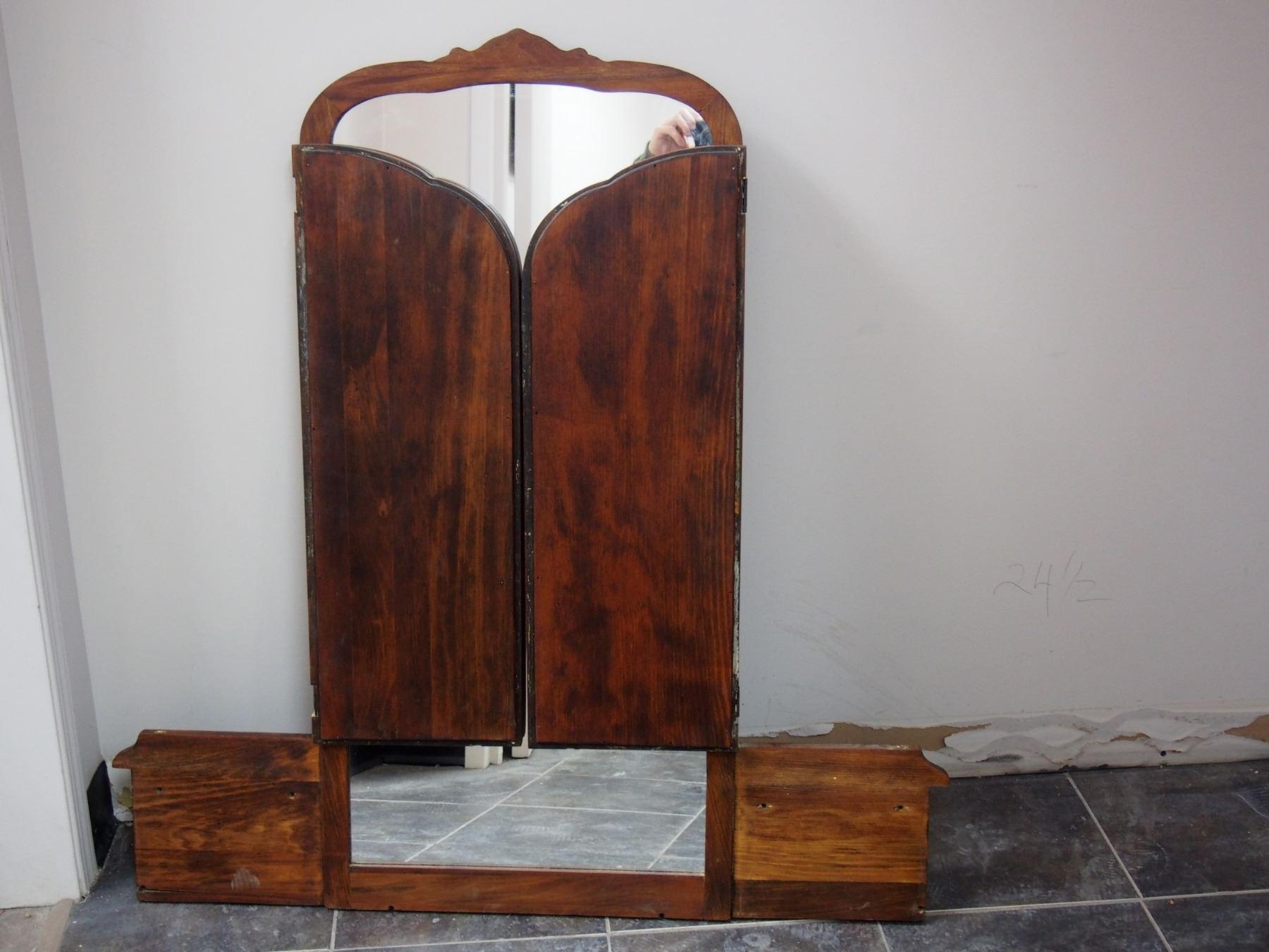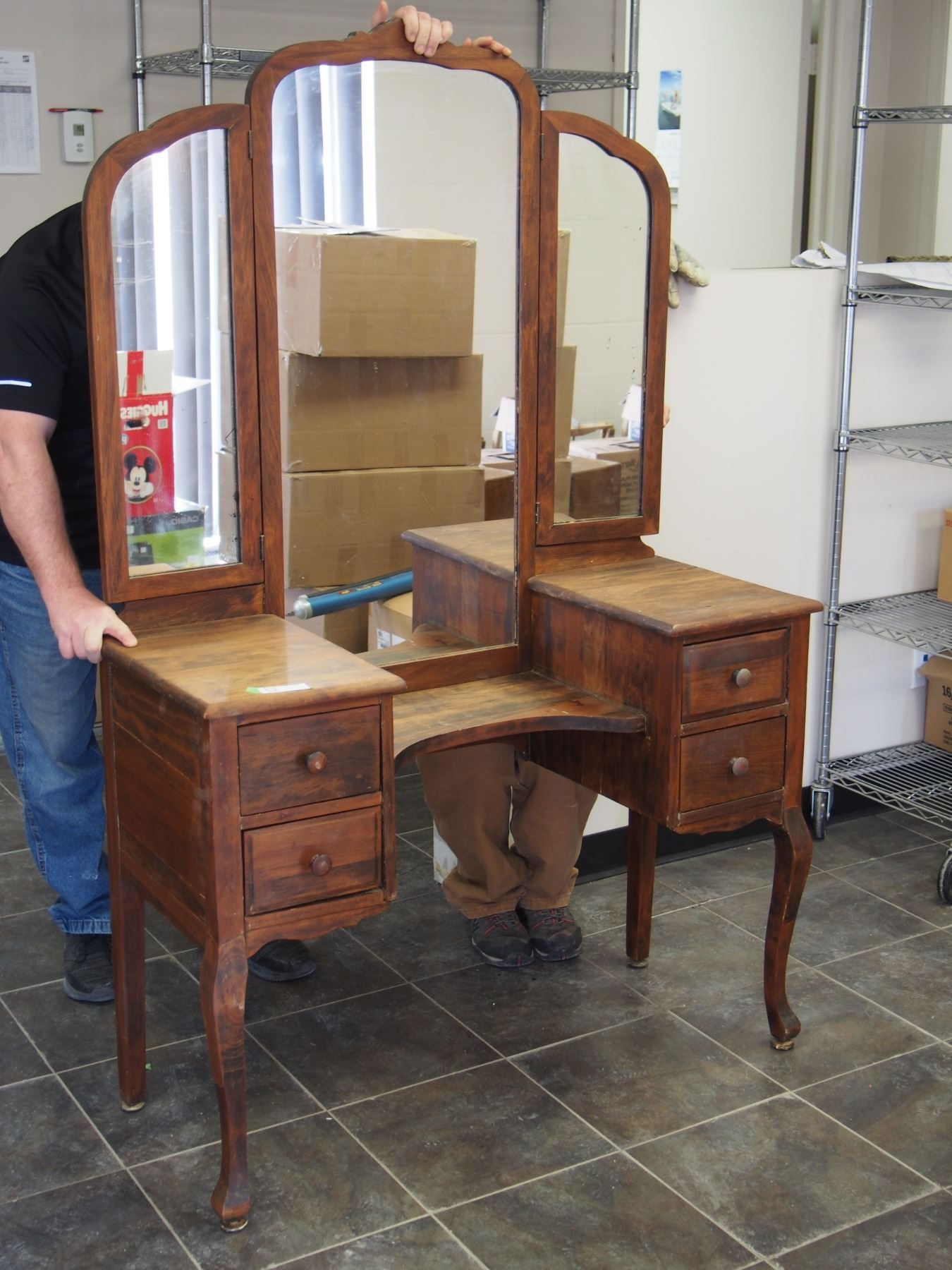 VINTAGE MAKEUP STAND WITH 3 WAY MIRROR 42 IN TALL X 17 IN WIDE STAND IS 31 IN TALL MIRROR 42 IN TALL TOTAL HEIGHT 66 IN