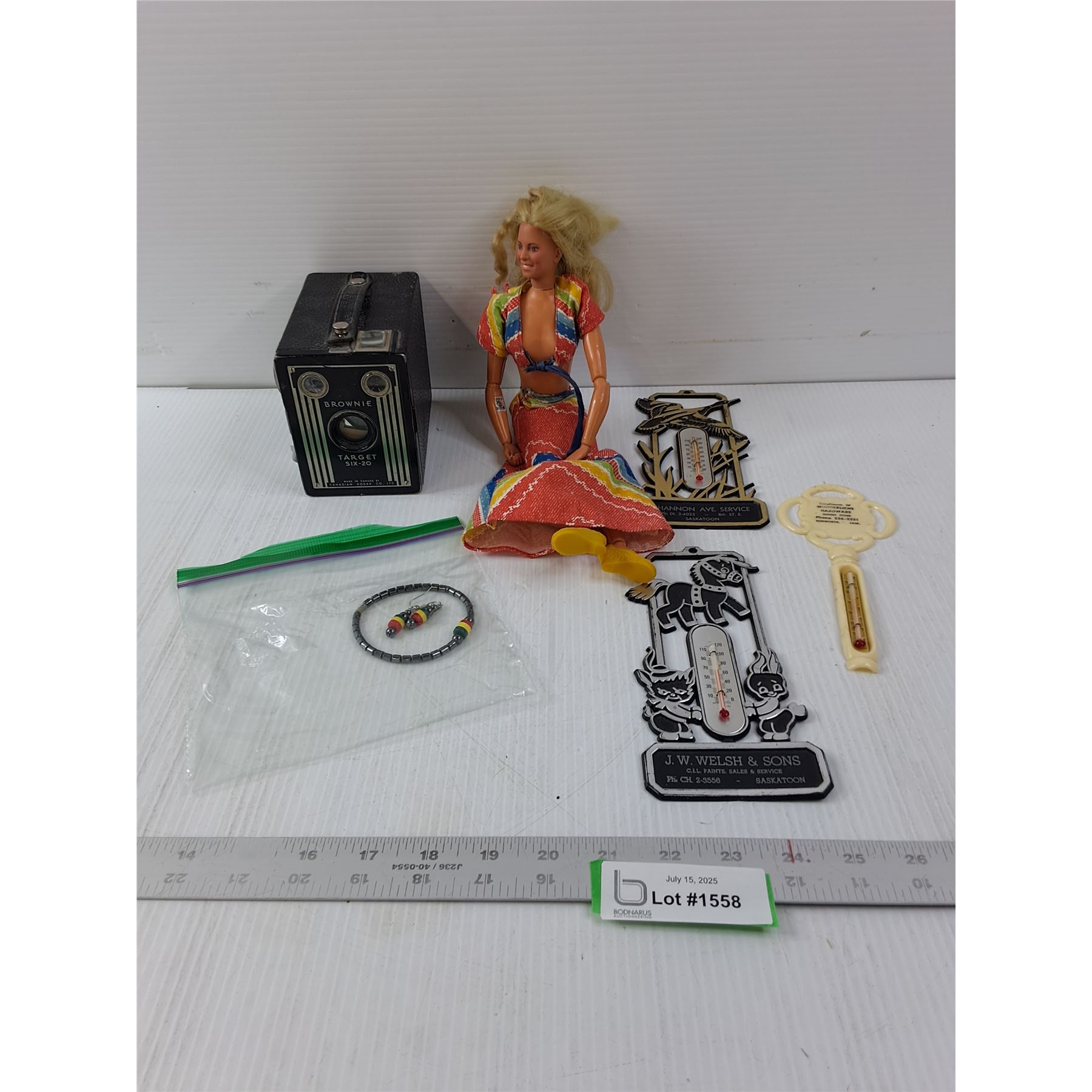 Variety Of Items- Thermometer, Barbie, Kodak Brownie Targets Six-20 Camera, Bracelet & Earrings