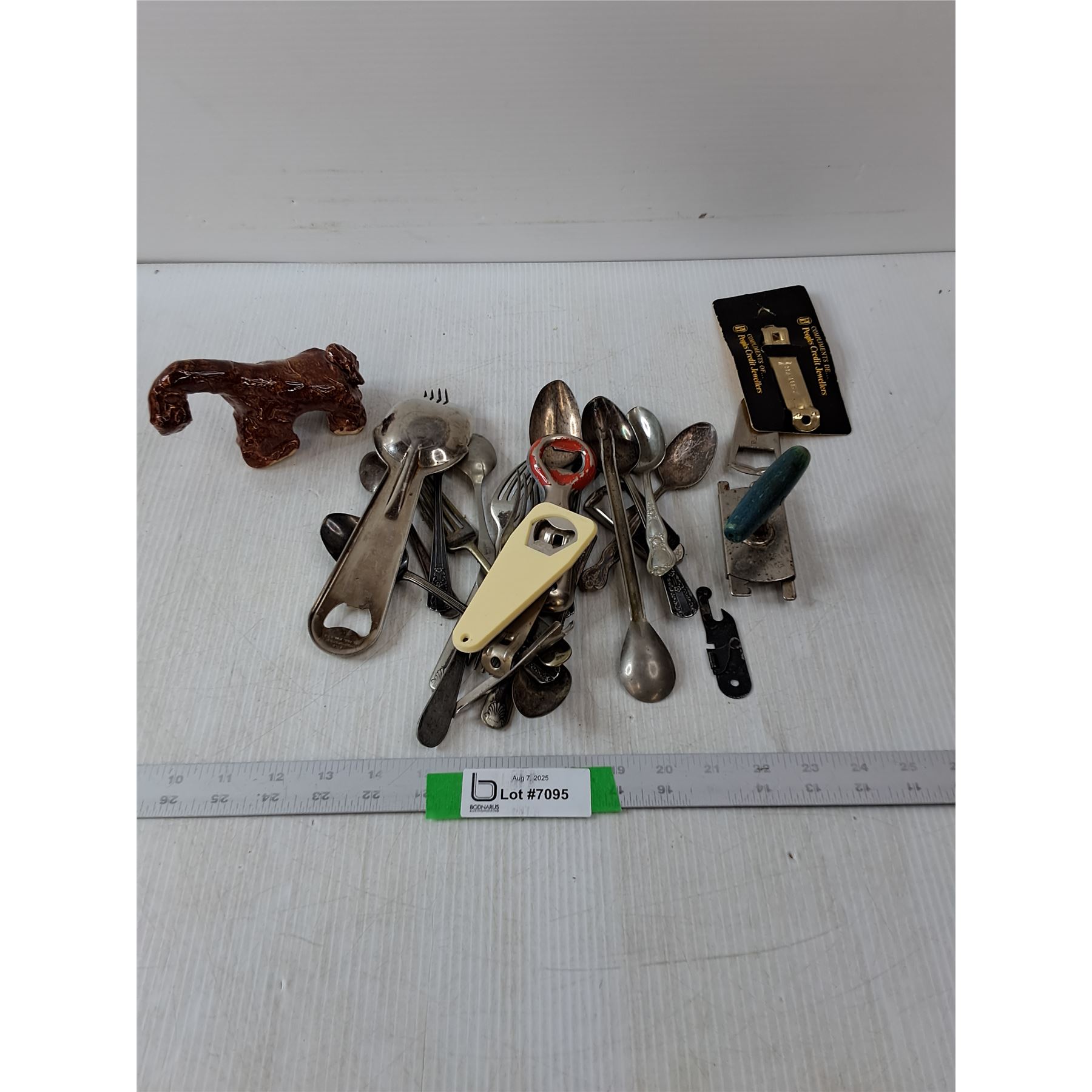 Variety Of Utensils, Spoons Forks, Can Opener & Jar And Bottle Opener & Glass Animal Shaped Figurine
