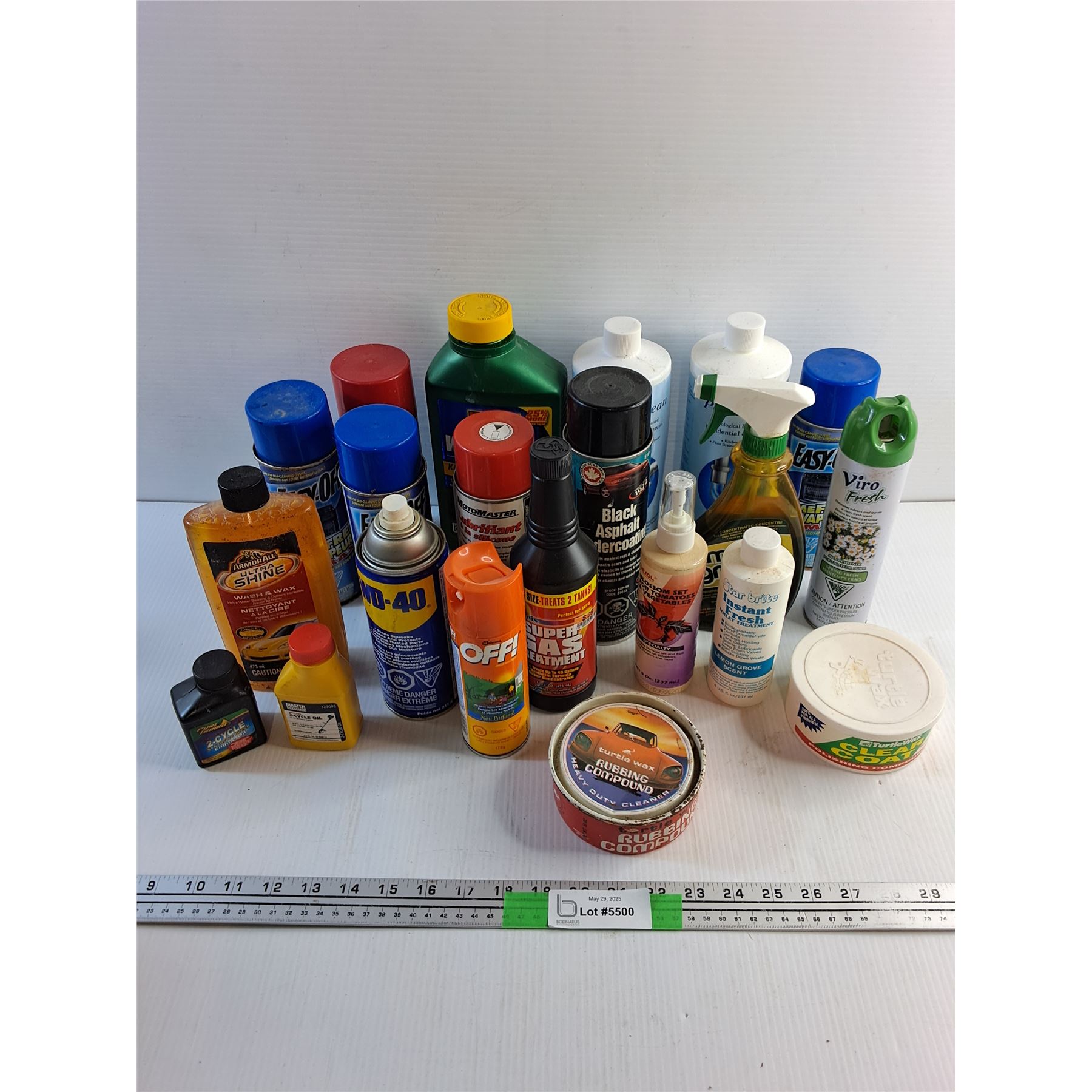 Various Chemicals - WD40, Black Asphalt Undercoating, Wash & Wax, Air Freshener, 2 Cycle Oil, Misc