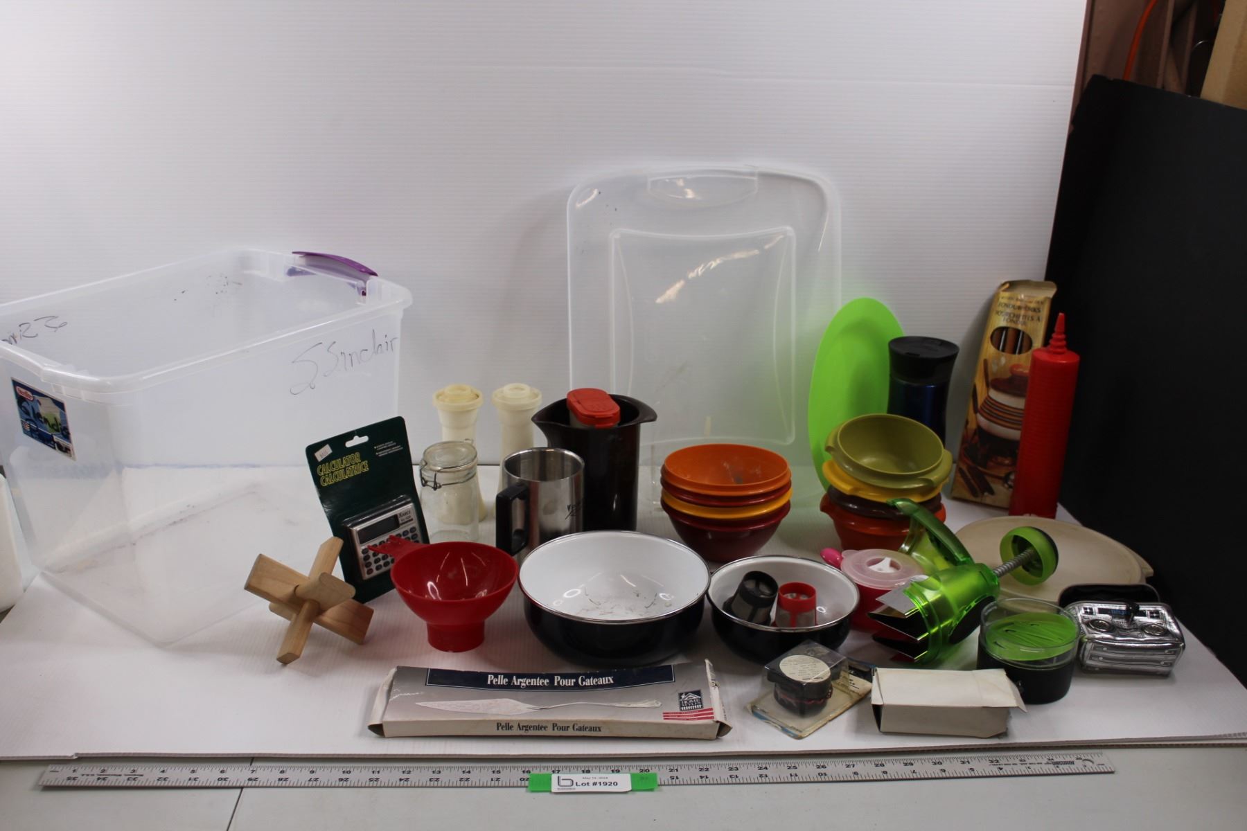 Various Household/Kitchen Items w/Small Tote and Lid - Vintage Tupperware, Enameled Bowls, Travel Mugs, Calculator