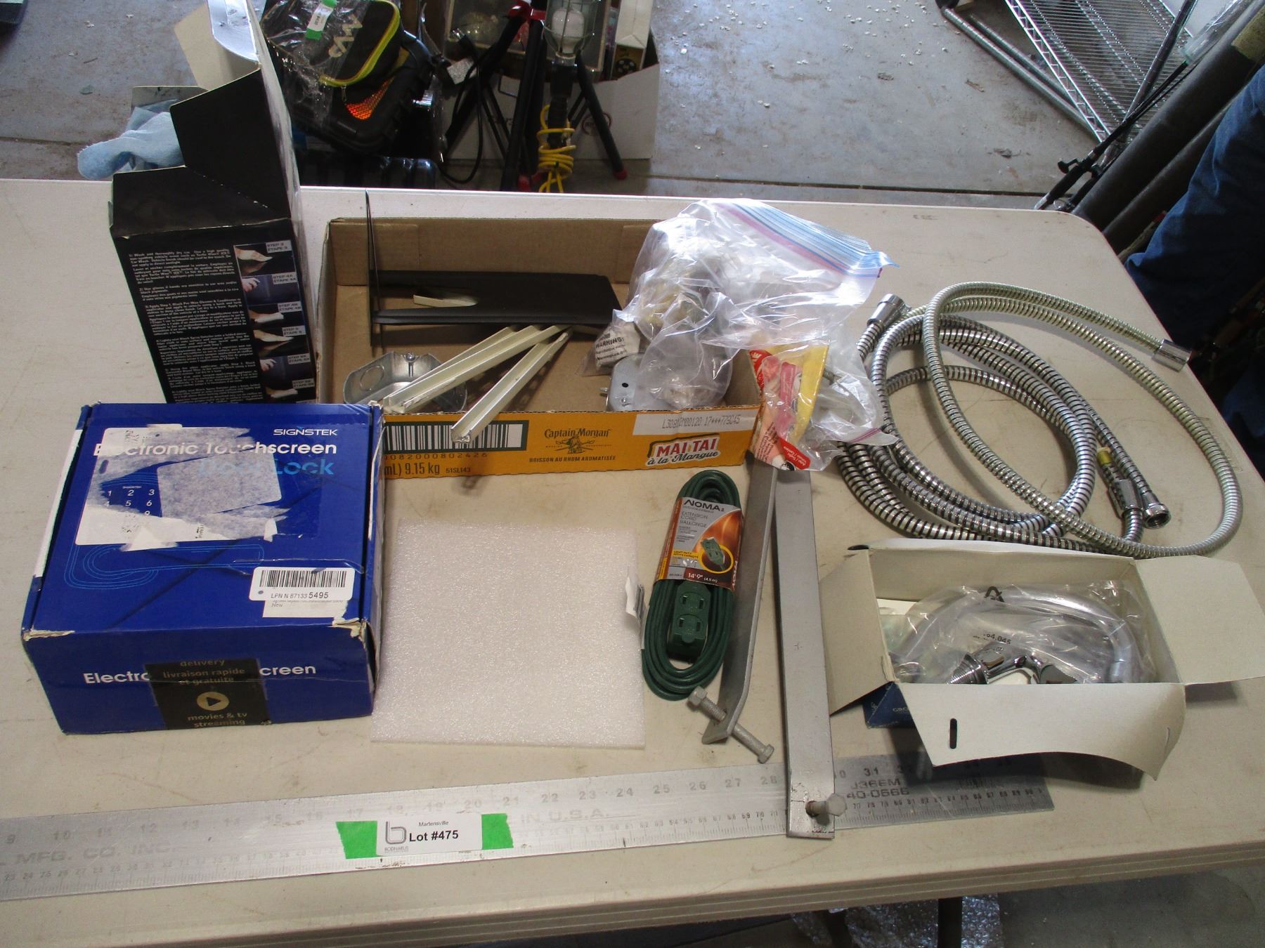 Various Items - Extension Cord, Flex Hose for Shower Head, Brackets, Turtle Black Box Polish, Door Handle etc.