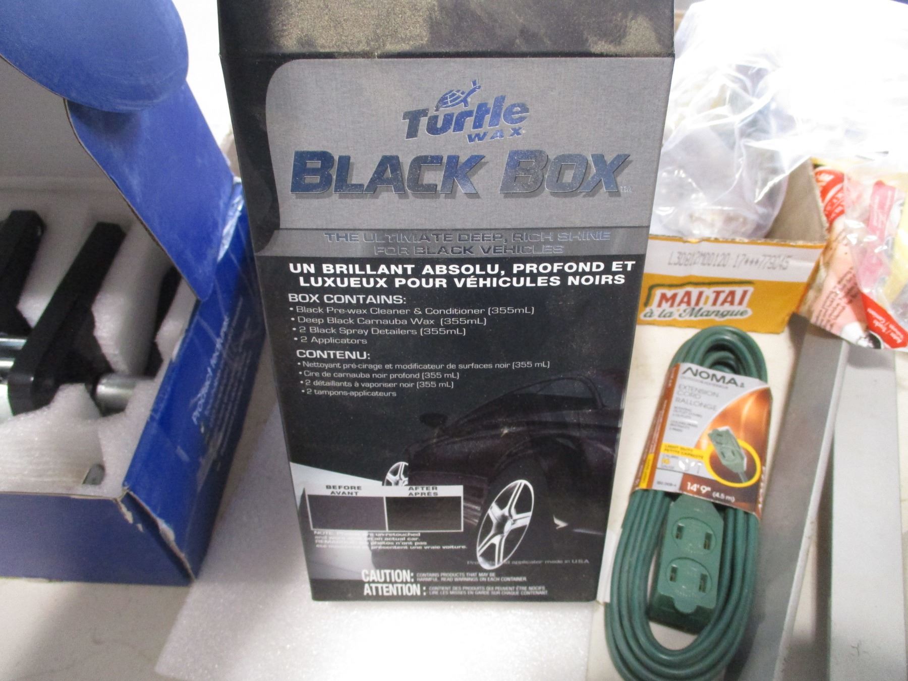 Various Items - Extension Cord, Flex Hose for Shower Head, Brackets, Turtle Black Box Polish, Door H