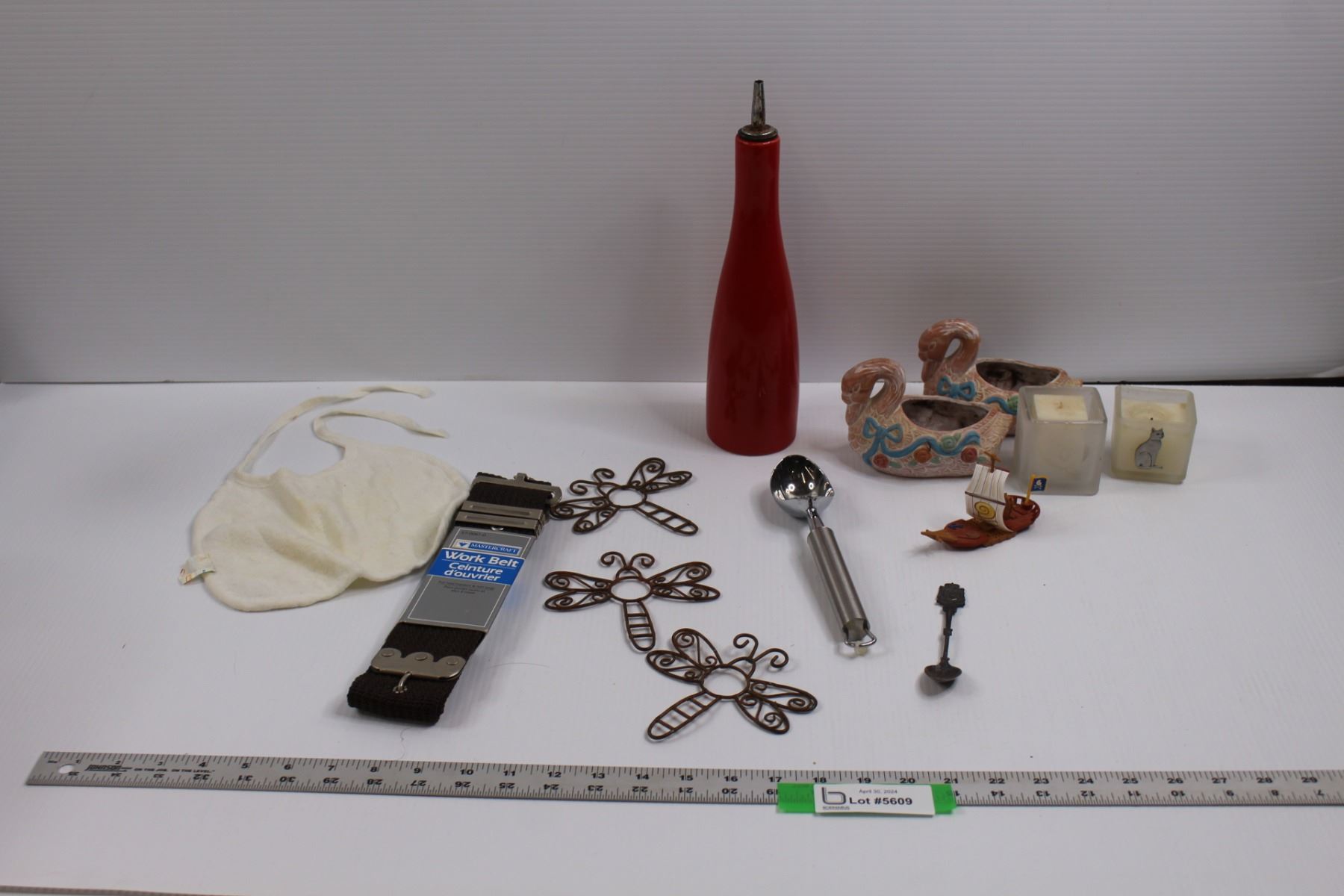 Various Items - Oil Decanter, Bib, Mastercraft Work Belt, Candles w/Holders, Swan Flower Pots, Butterfly Decor., Ice Cream Scoop