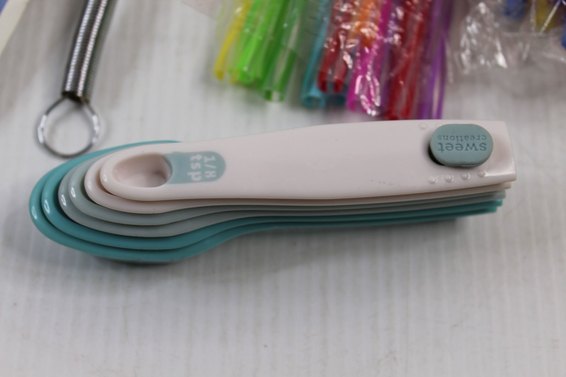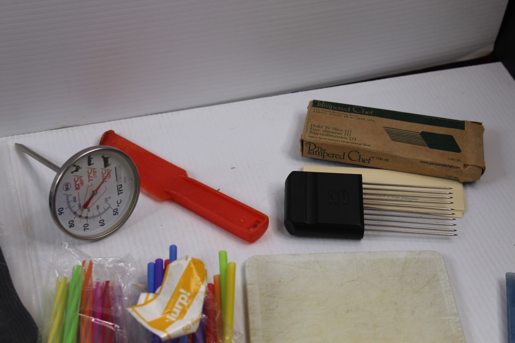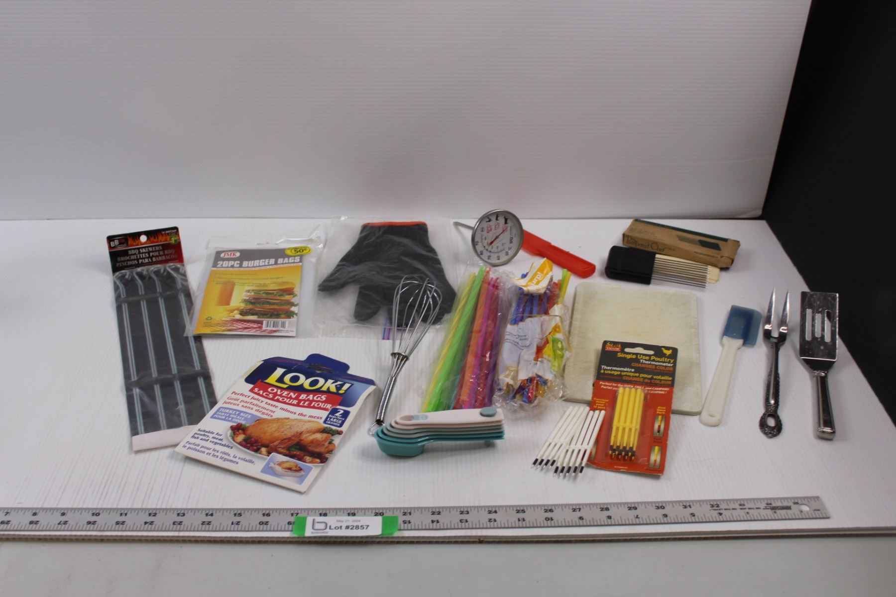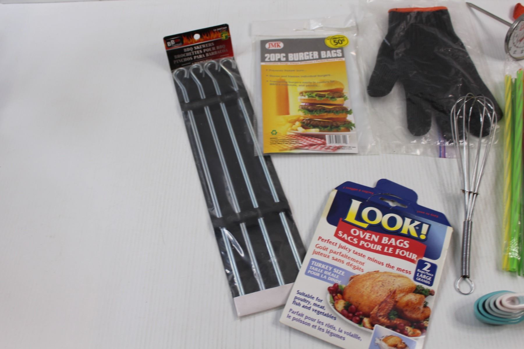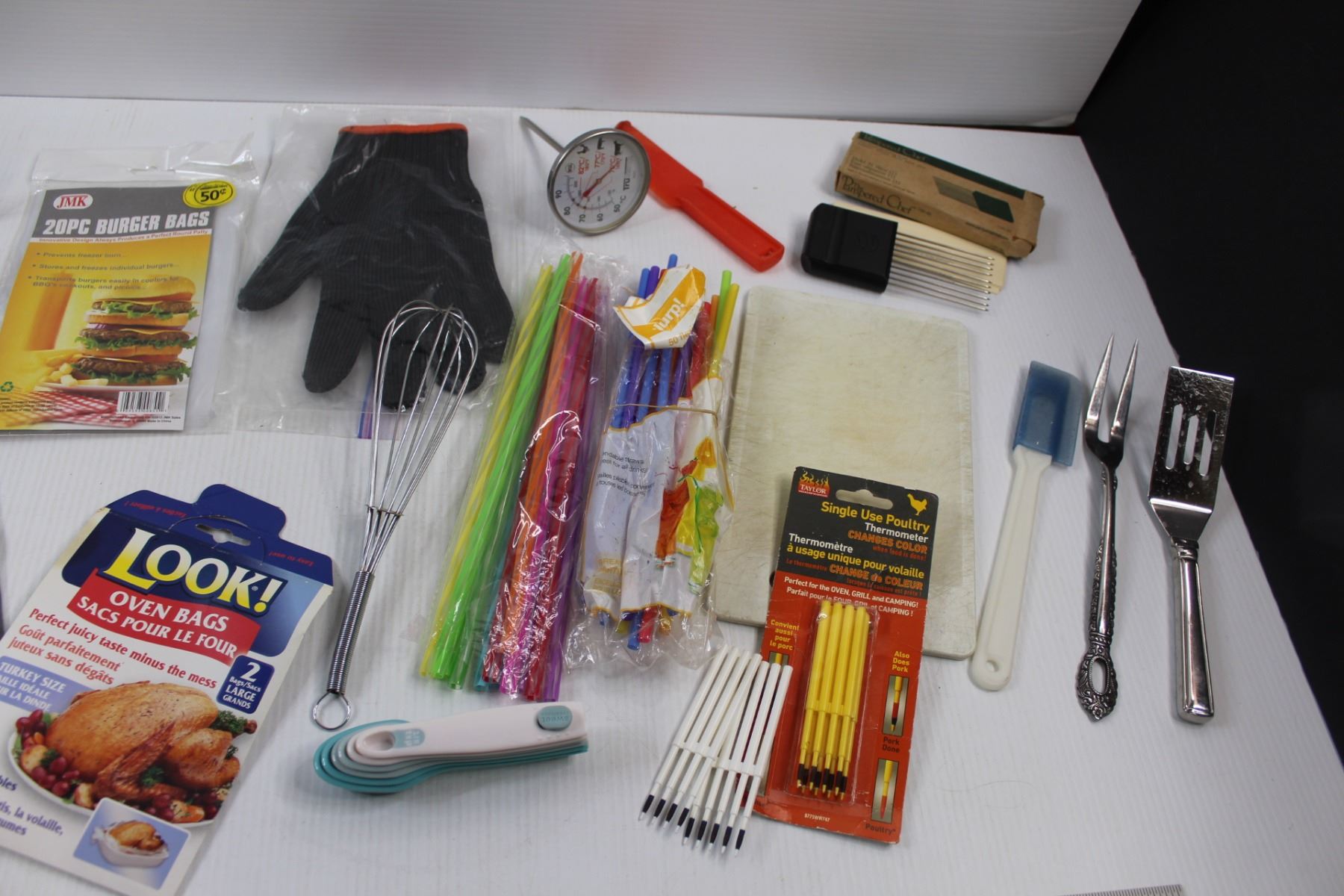 Various Kitchen/Grilling Items - BBQ Skewers, Burger Bags, Thermo Glove, The Papered Chef Hold n Slice, Meat Fork, Straws, Whisk, Measuring Spoons, Single Use Poultry Thermometers, Thermometer Cutting Board etc.