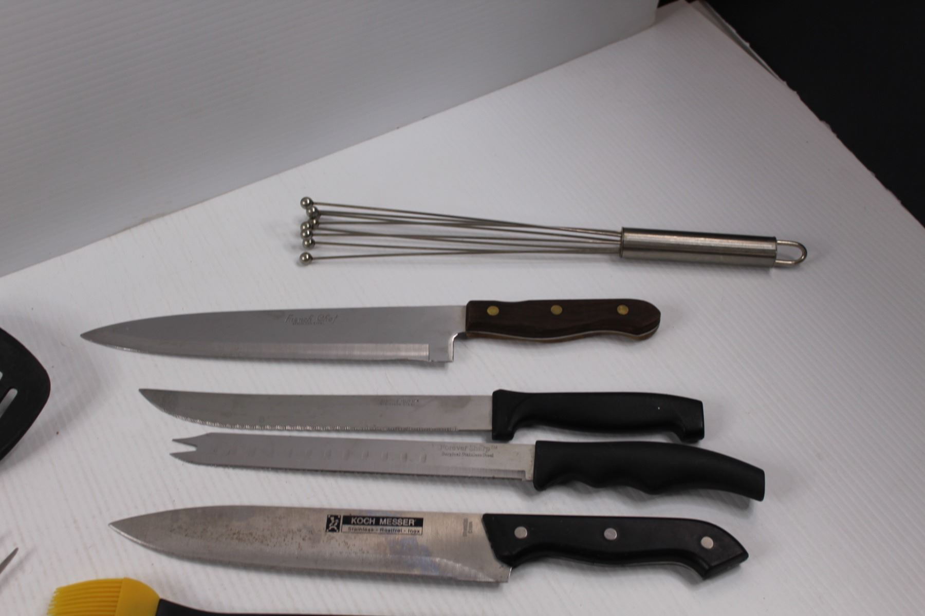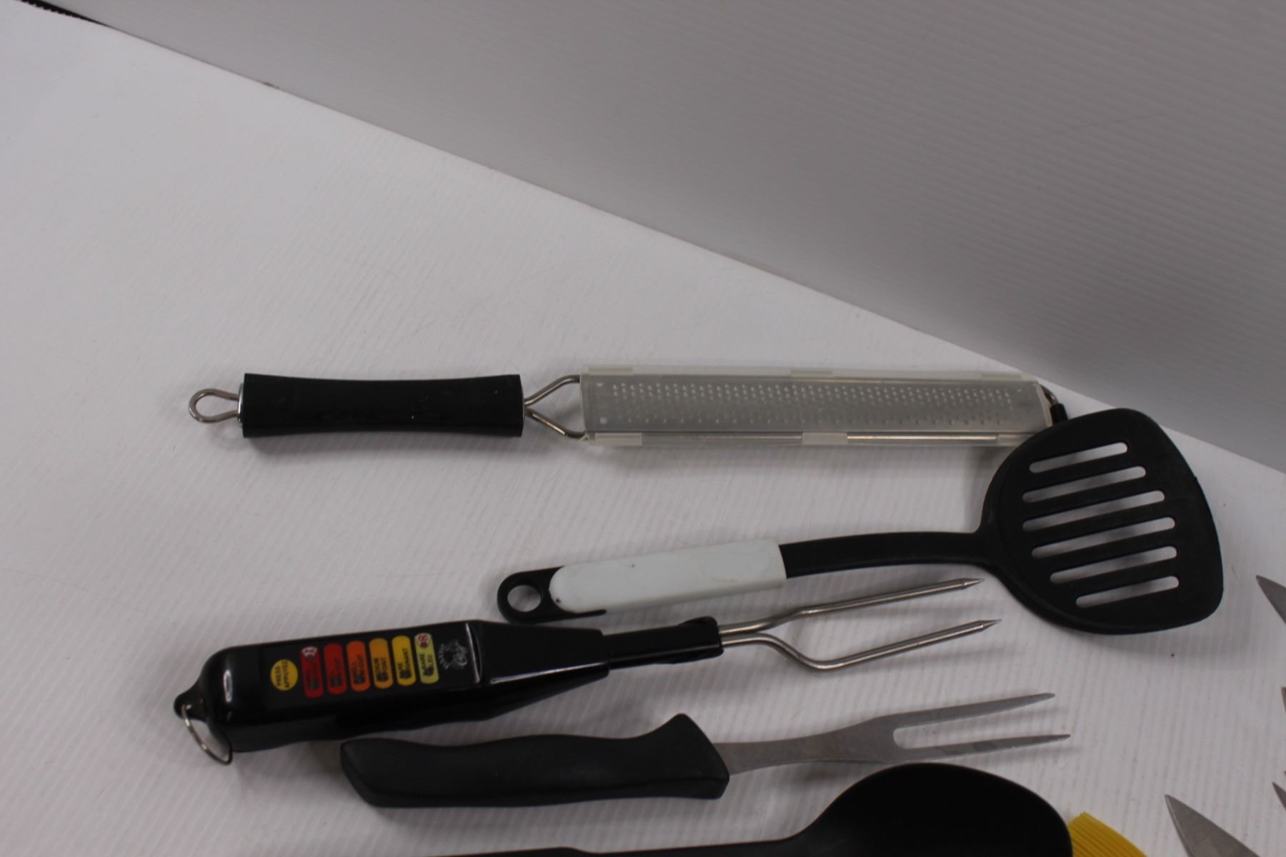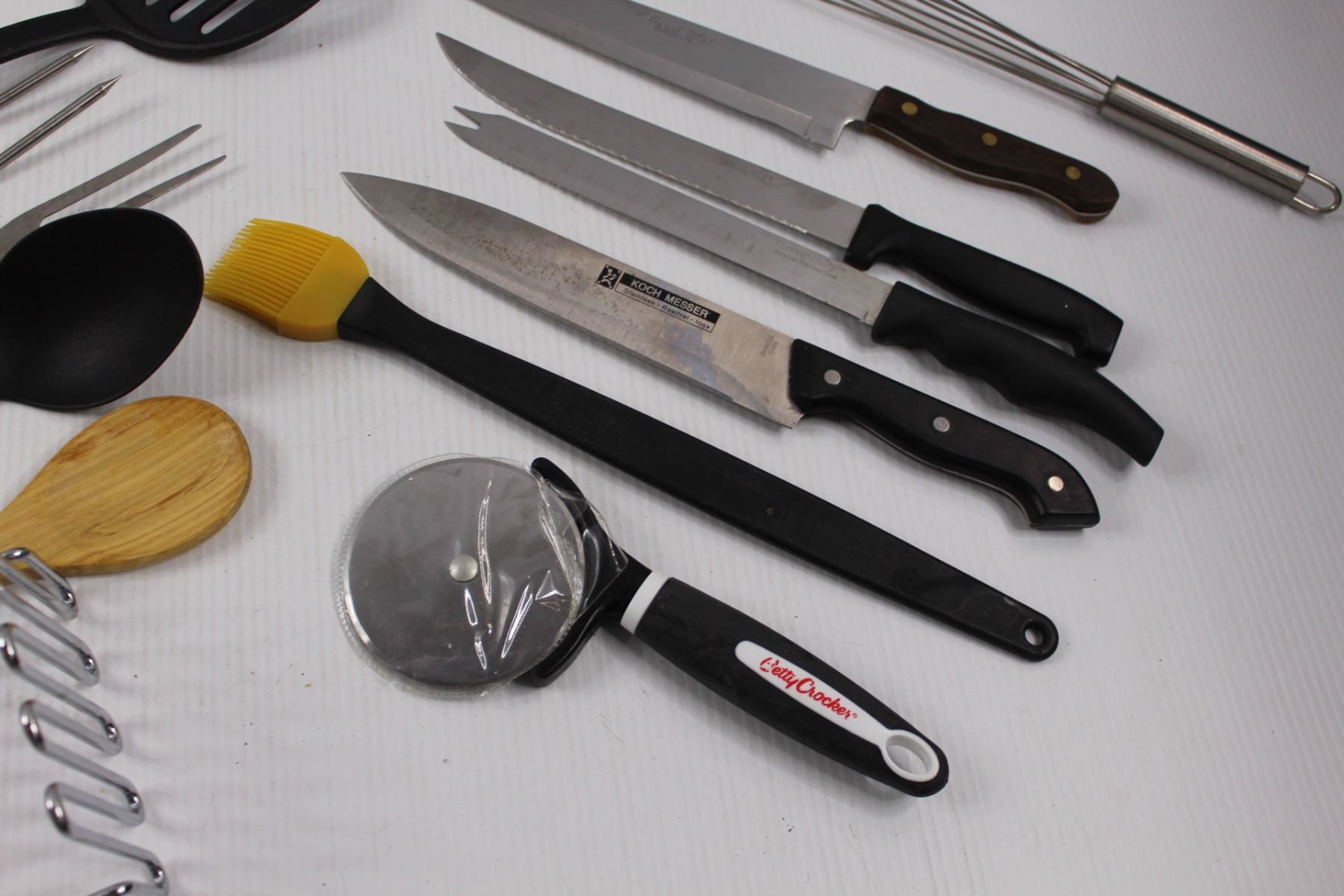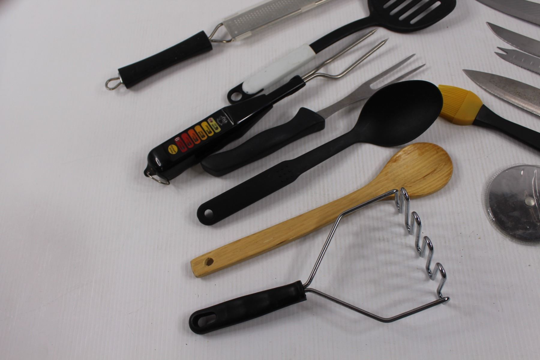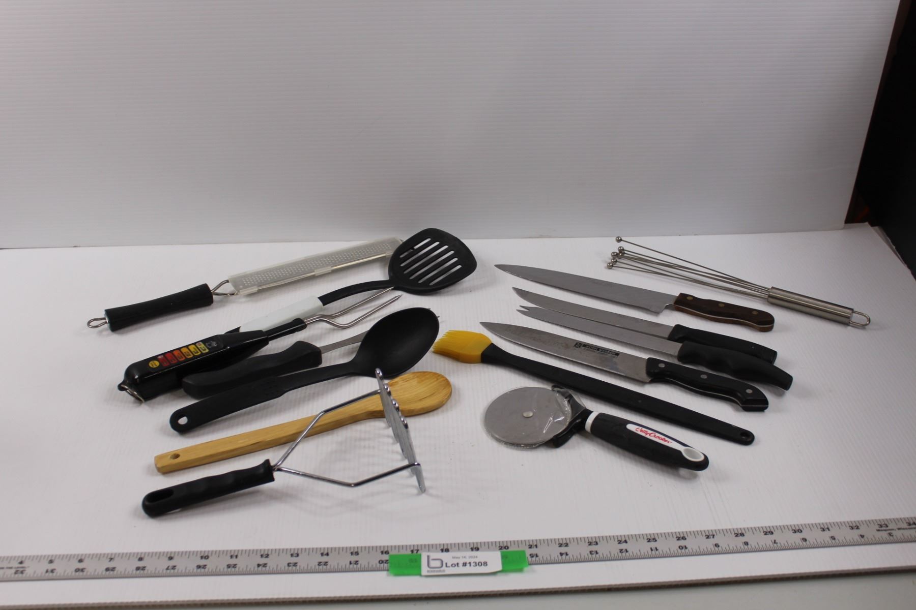 Various Kitchen Utensils - Meat Forks, Spoons, Flipper, Grader/Zester, Knives, Pizza Cutter, Masher, Whisk etc.