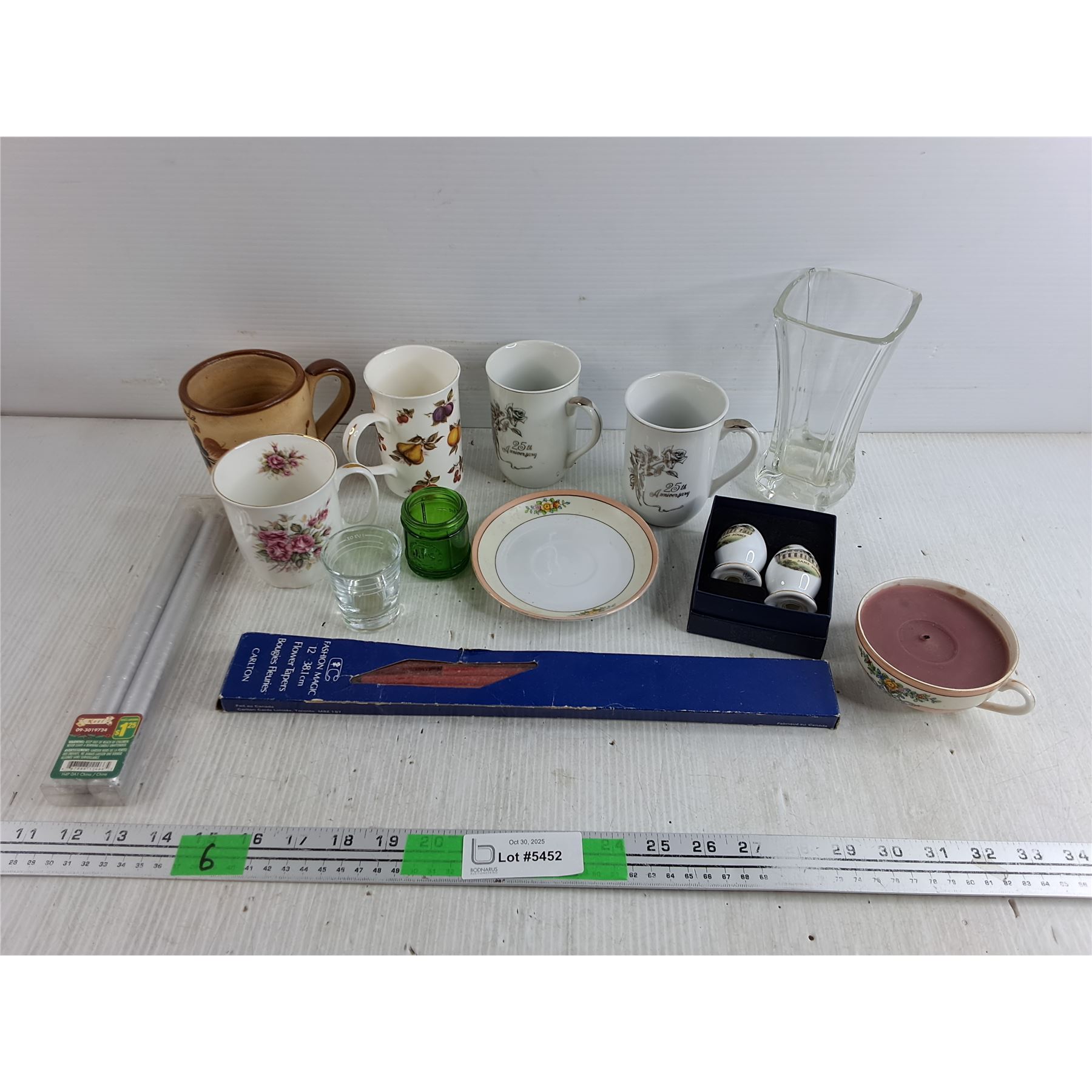 Various Mugs, Porcelain Salt & Pepper Shakers, Candles, Glass Vase, Flower Tapers, Misc