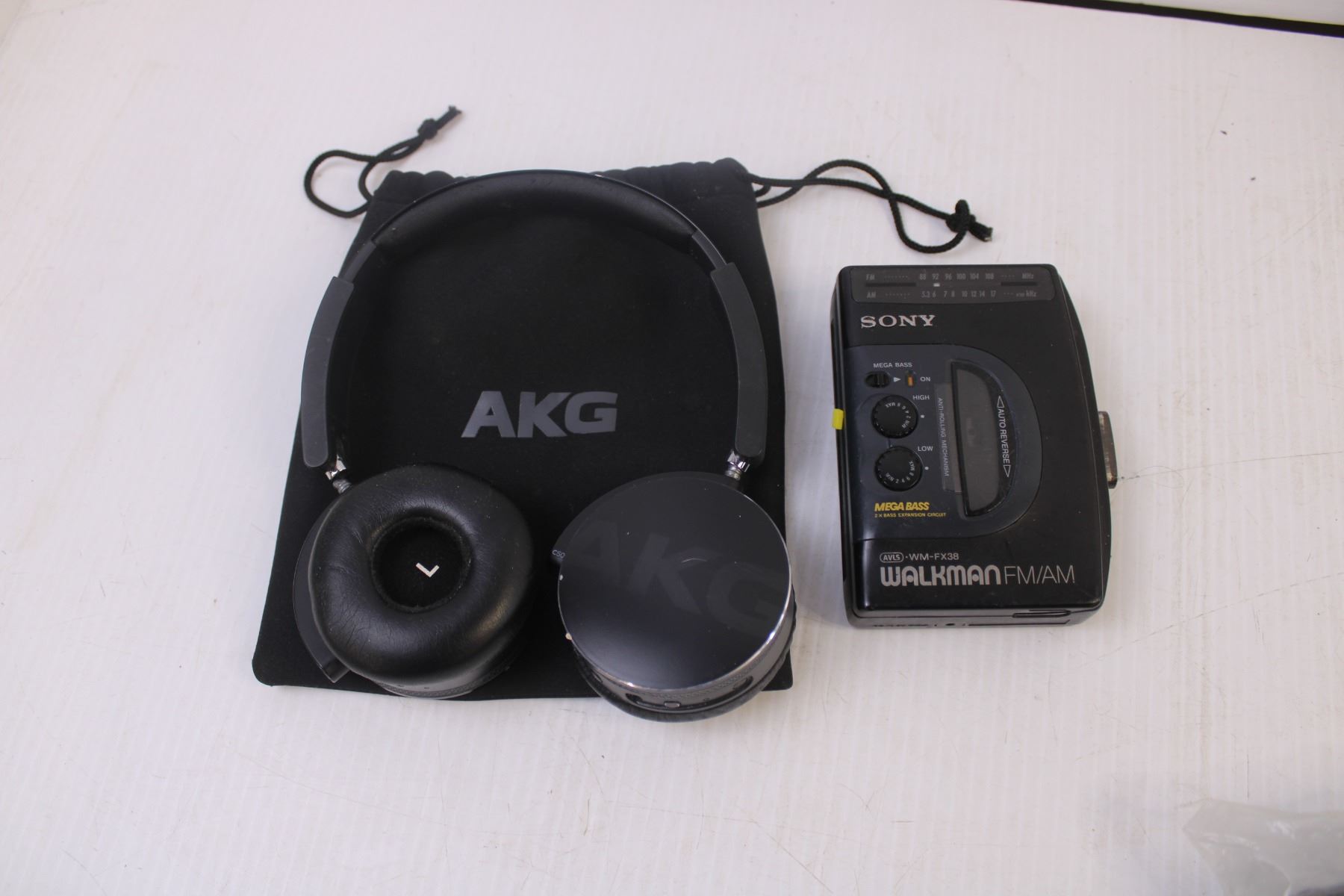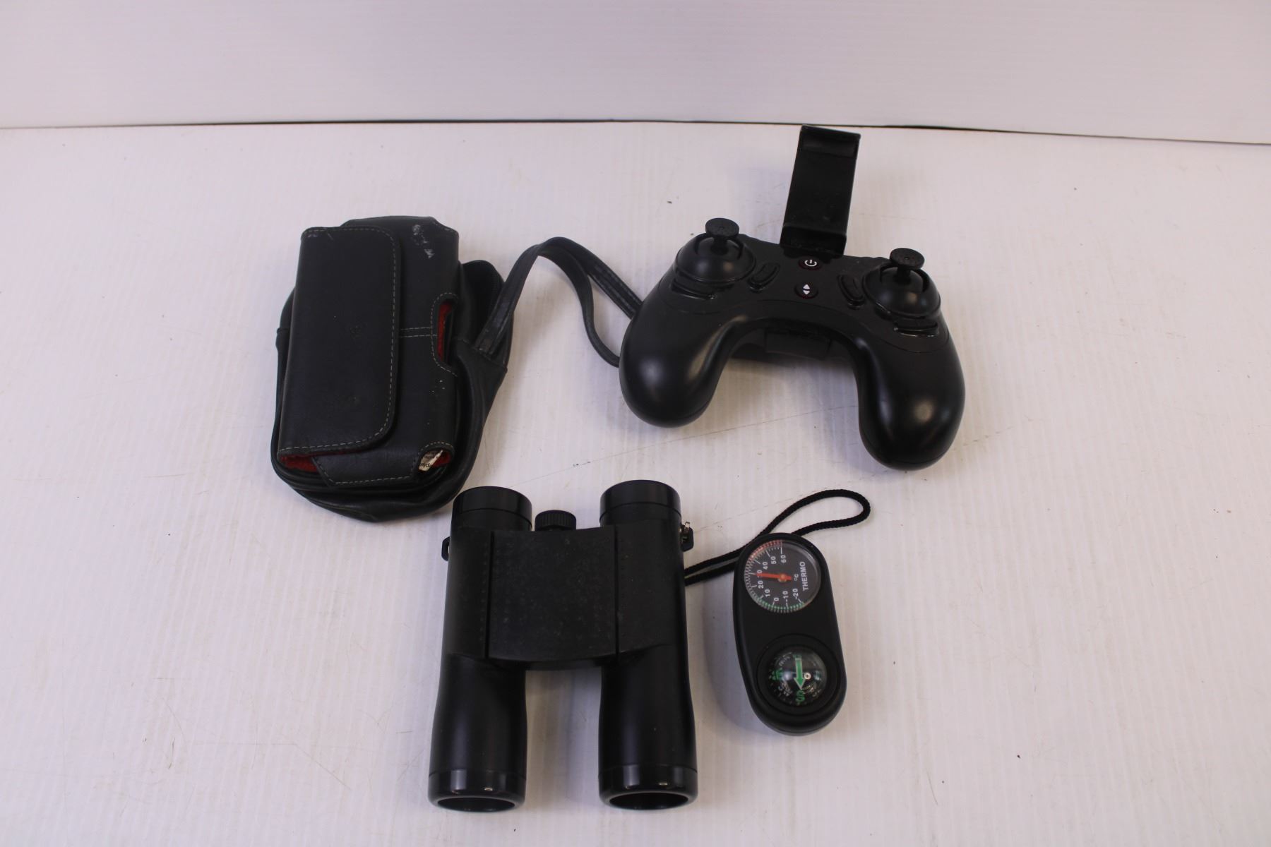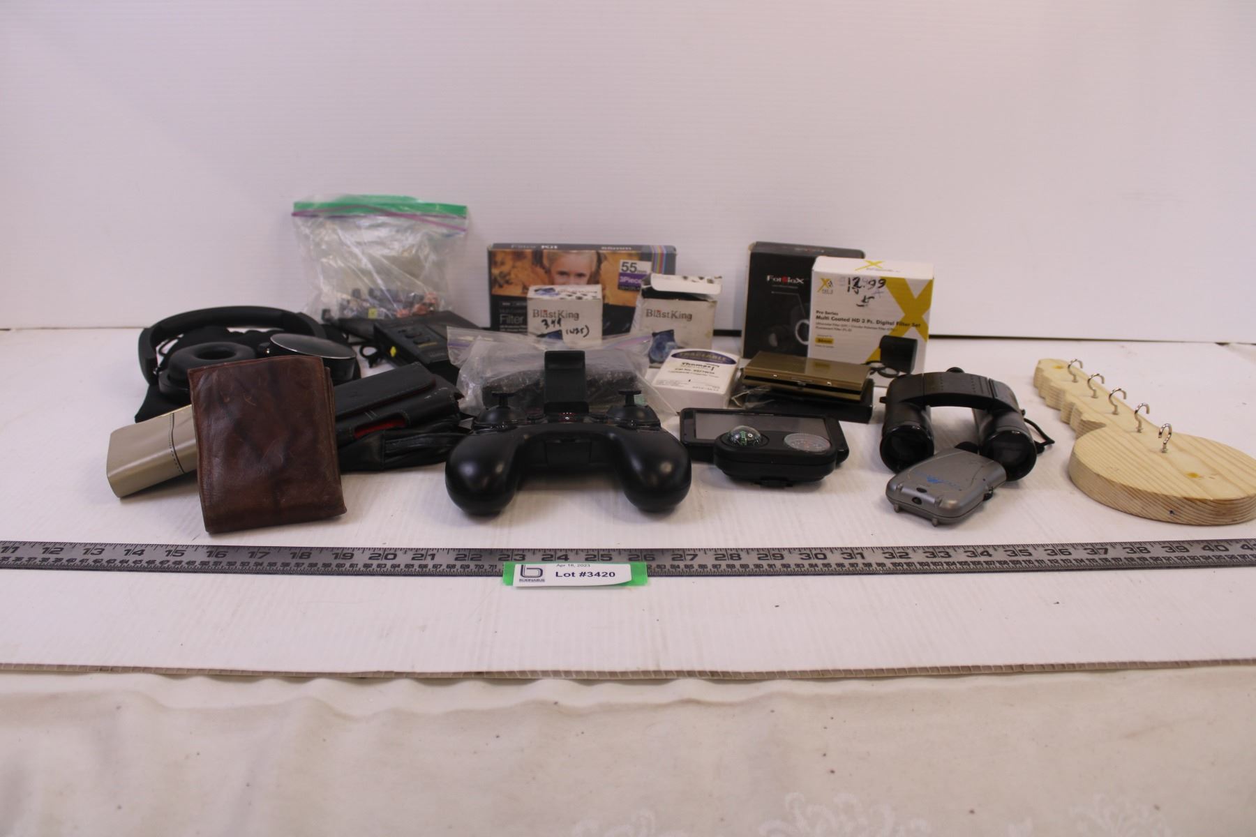 Various Photography items, wallets, headphones, sony walkkman, key wall hanger, compass, biinoculars