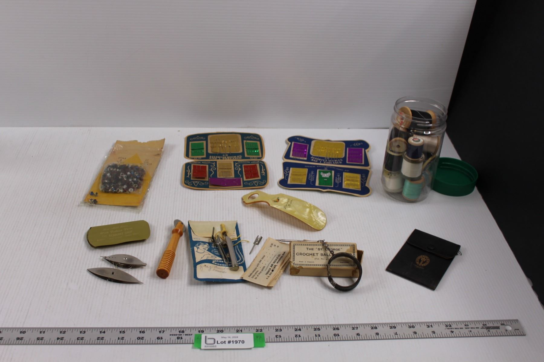 Various Sewing/Crocheted Supplies - Thread Bobbins, Needles, Shuttles, Rivets, etc. & Shoe Horn