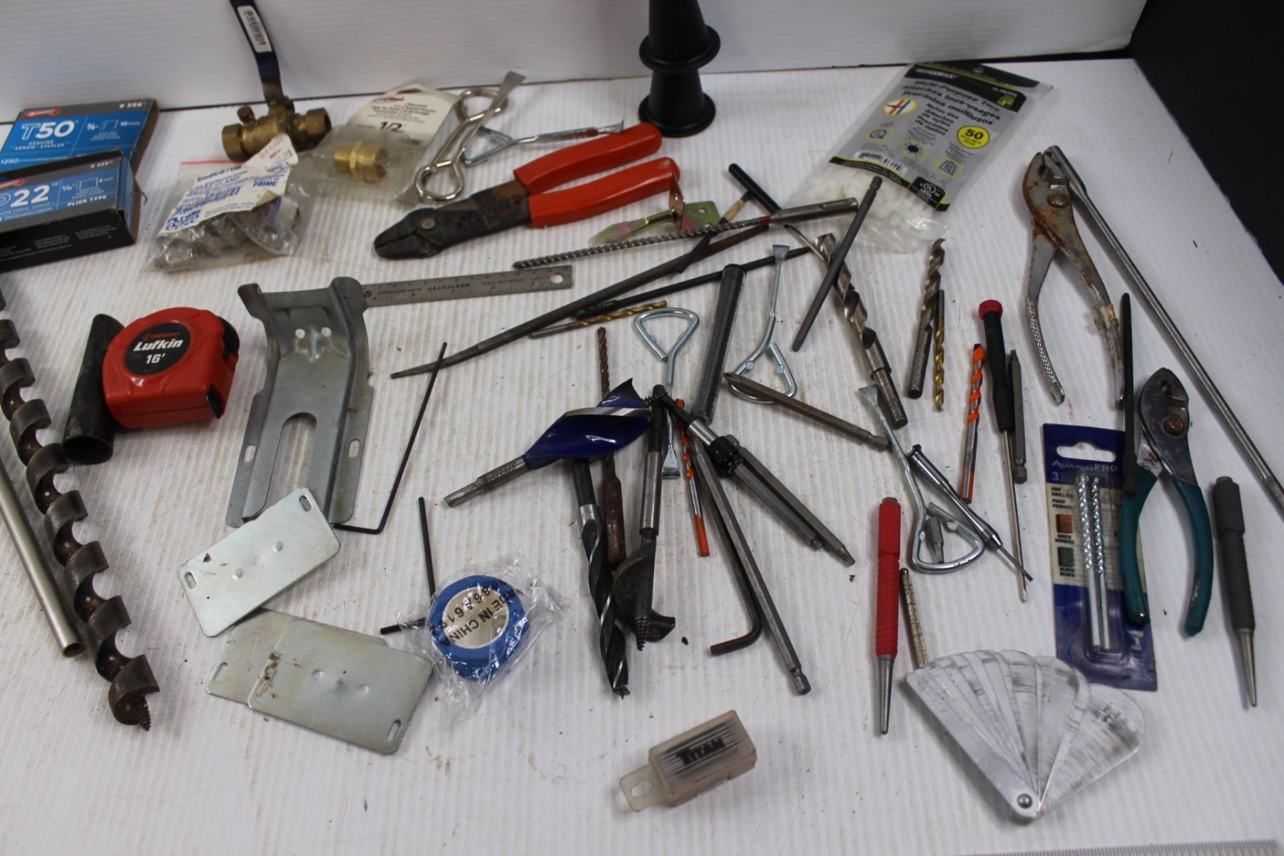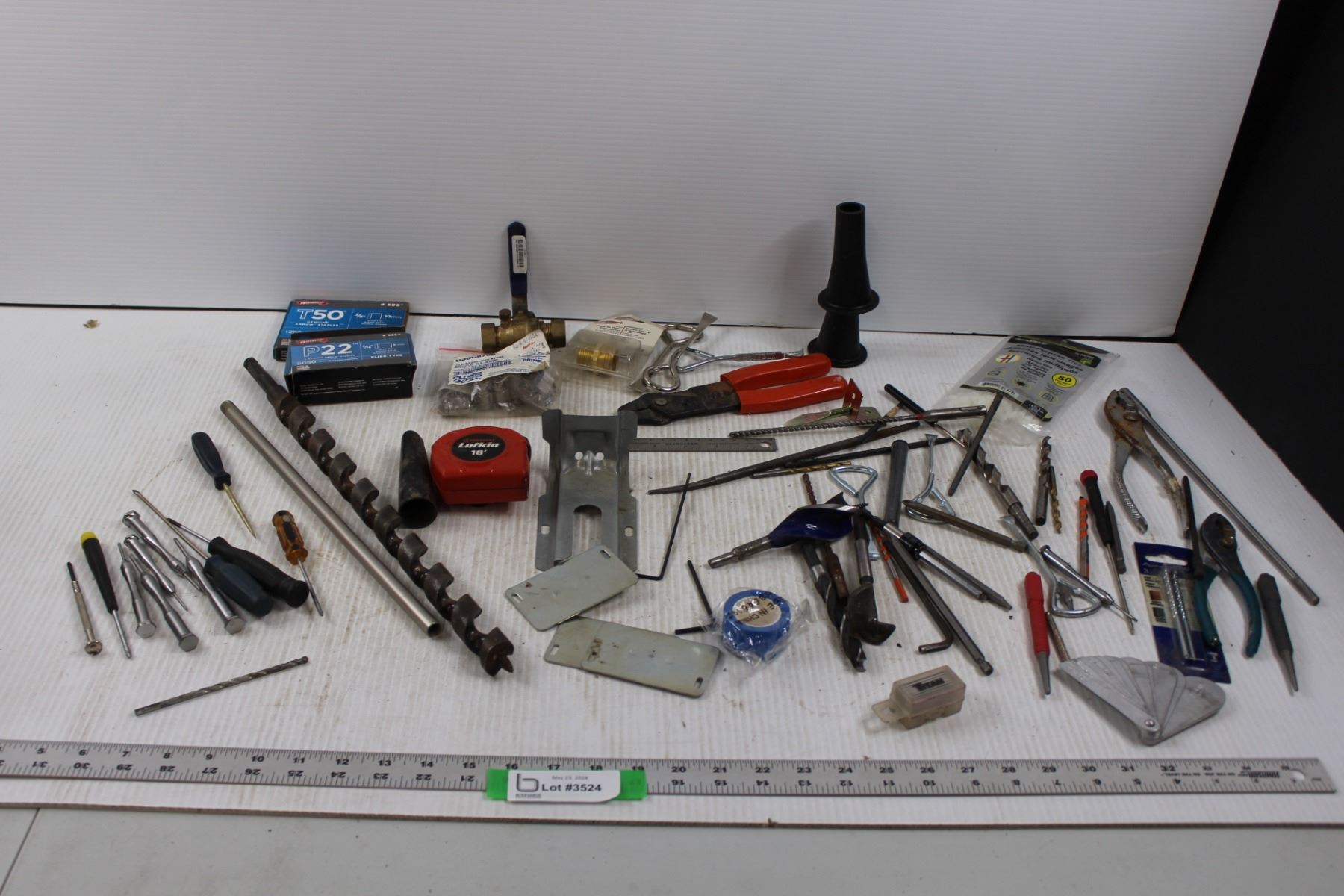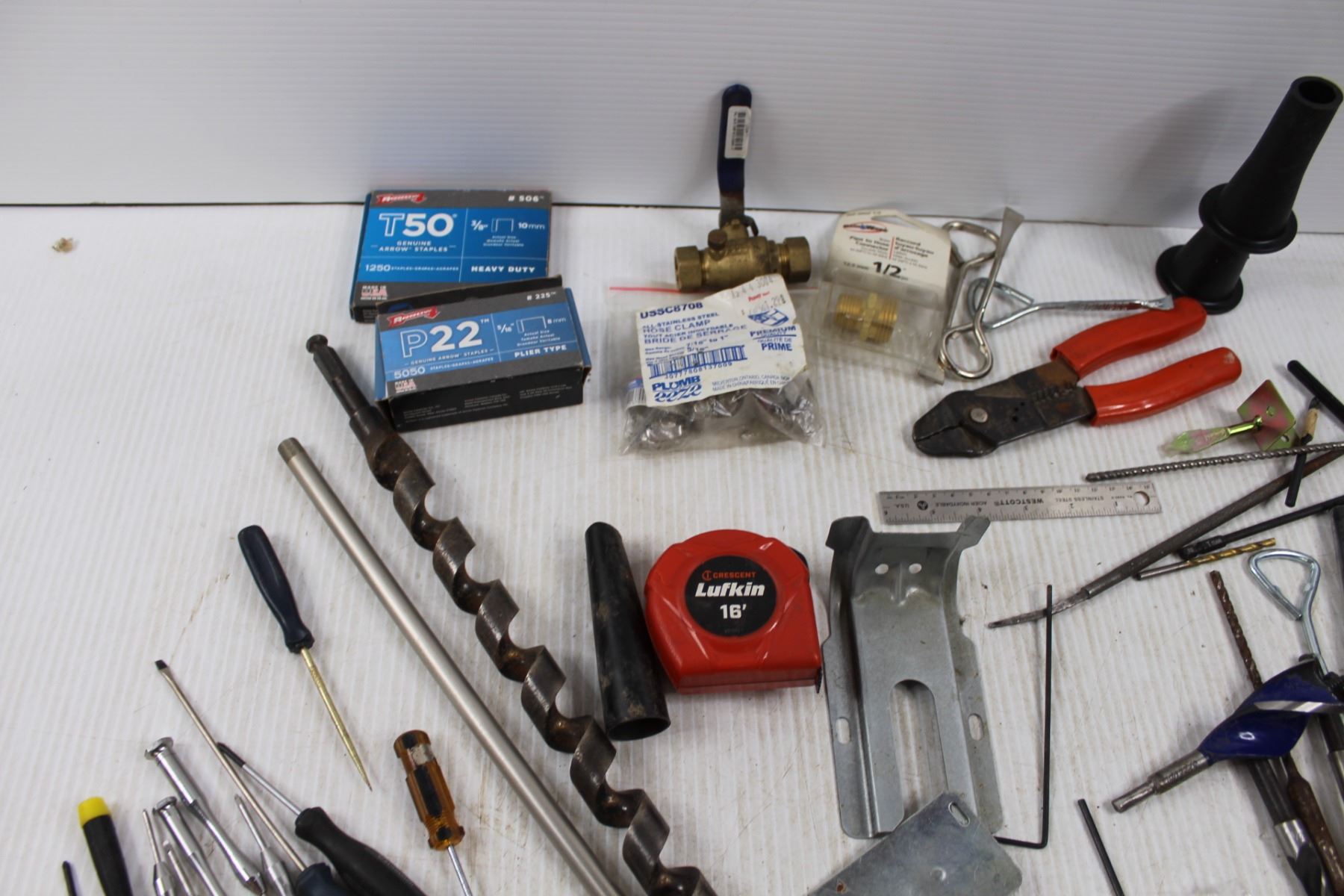 Various Shop Items - Precision Screwdriver, Drill Bits, Grove Gauge, Tape Measure, Cable Ties, Staples, Plumbing Parts, Pliers, Wire Strippers etc.