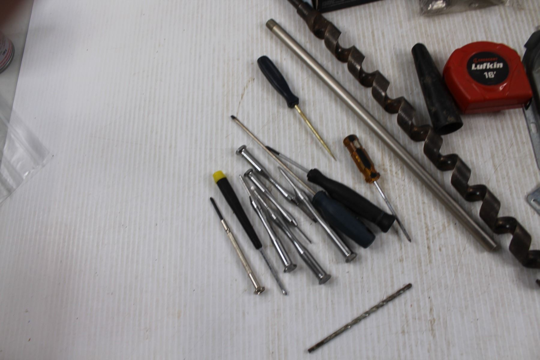 Various Shop Items - Precision Screwdriver, Drill Bits, Grove Gauge, Tape Measure, Cable Ties, Stapl