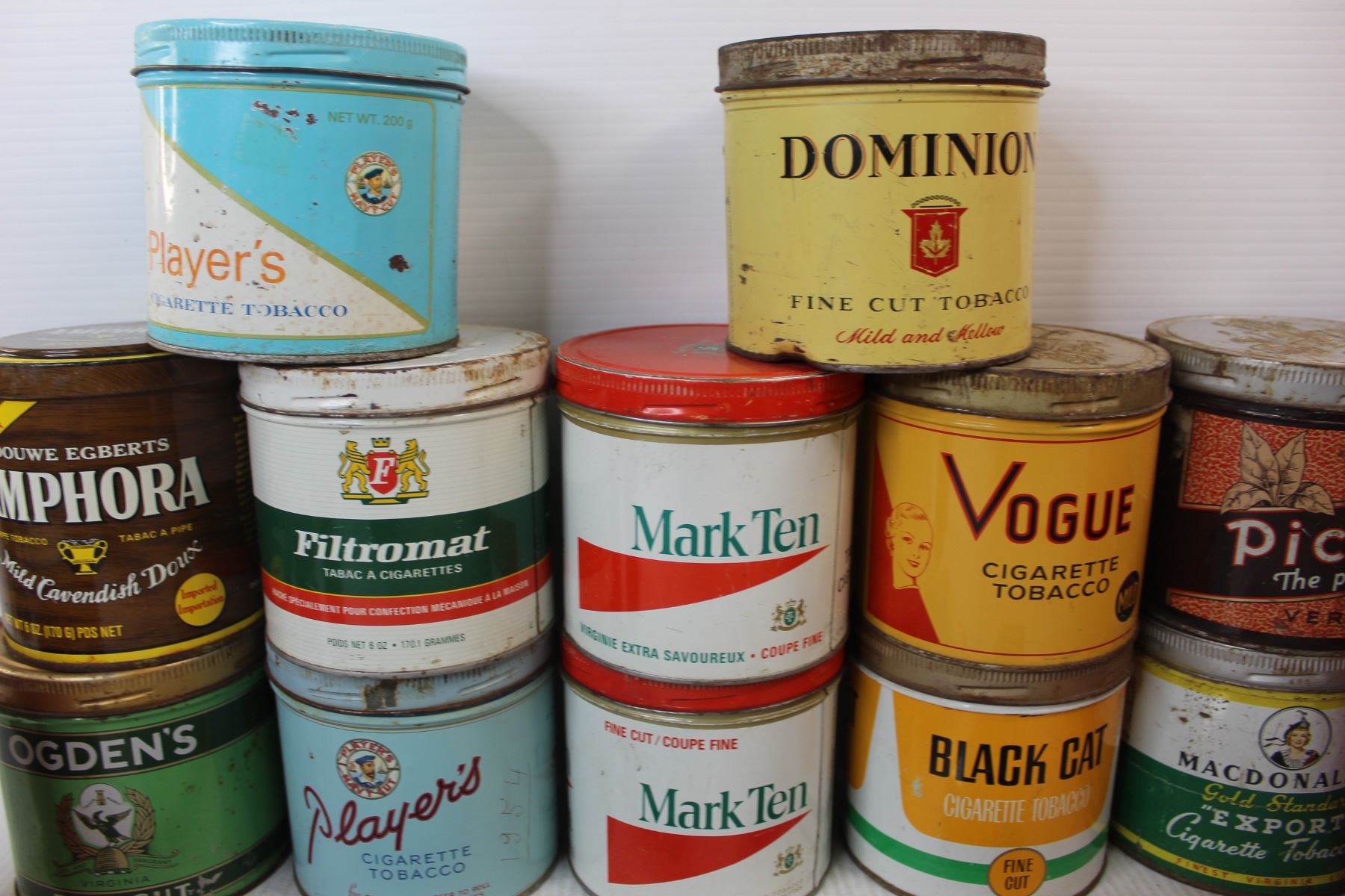 Various Vintage Tobacco/ Cigarette Tins, Blue Ribbon Tins, Bicycle Crib Board, Molson Canadian Coole