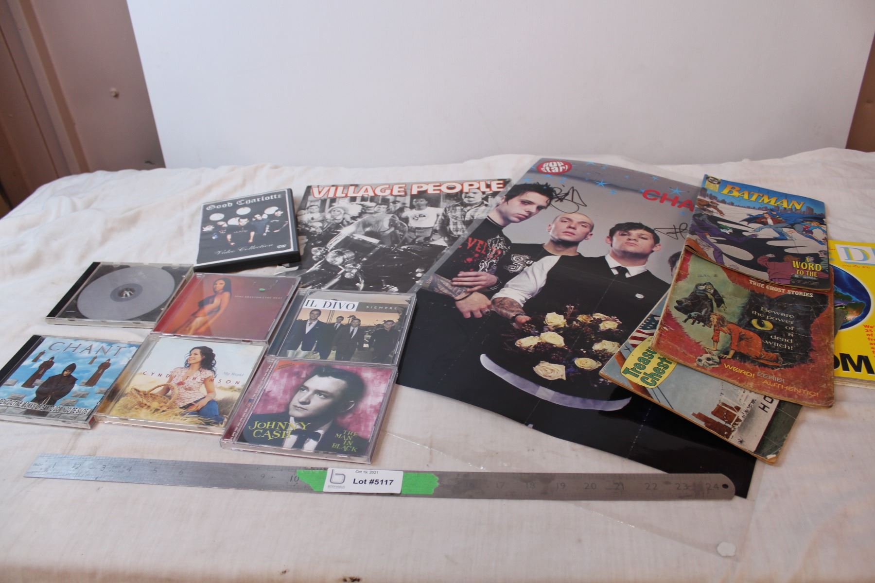 Various comics, music cd’s, Good Charlotte dvd and poster, Village people record