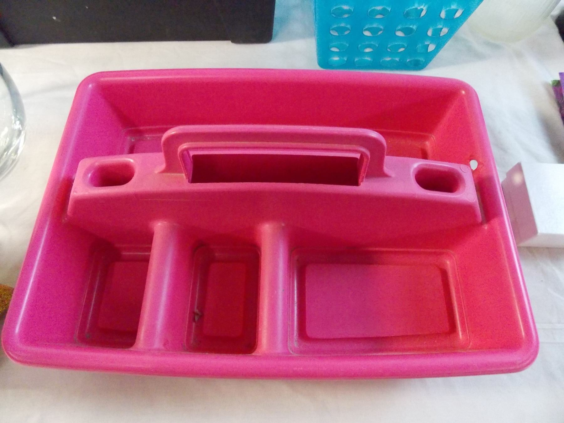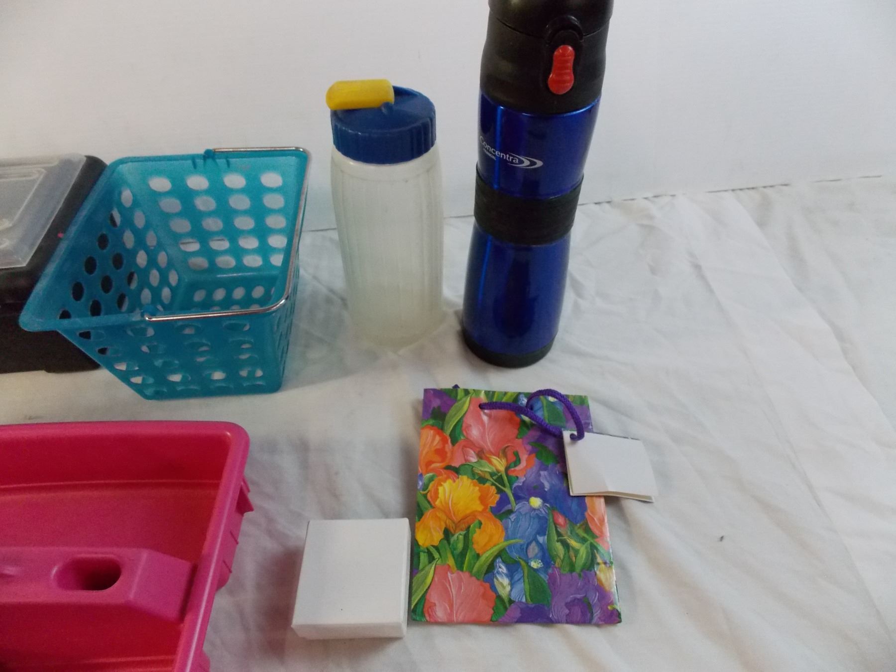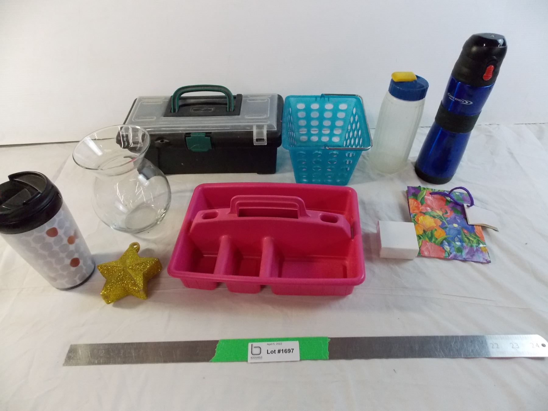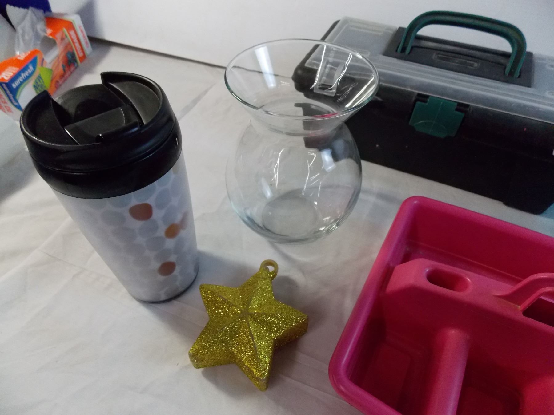 Various household containers, glass vase, misc