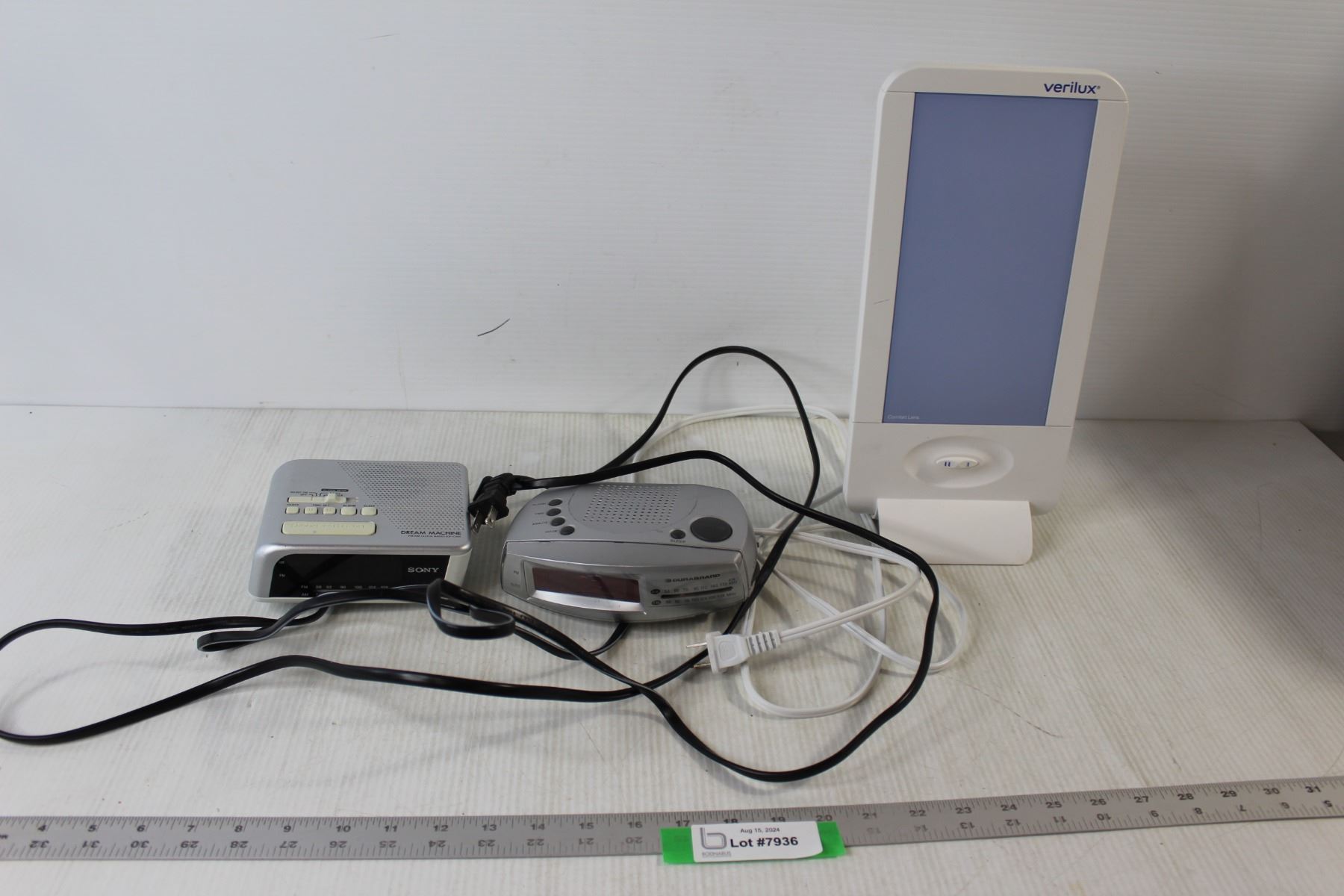 Verilux Happylight Comfort Lens, Durabrand Radio Alarm Clock, Sony Radio Alarm Clock - All Turn On