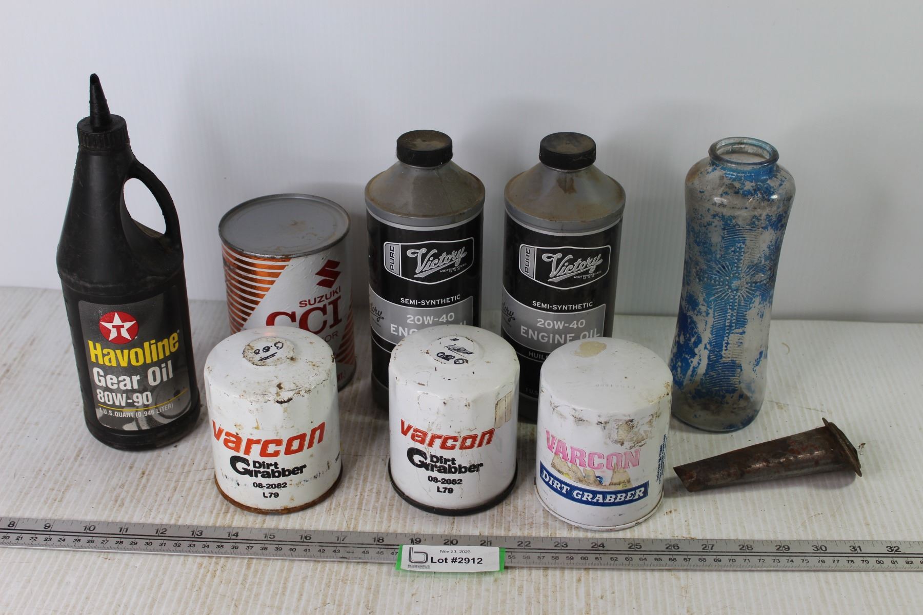 Victory 20w-40 Plastic Bottles - Vargon Oil Filters - Texaco Havilon Gear Oil - Suzuki CCI Motor Oil (full) - Glass Bottle - Oil Can Spout
