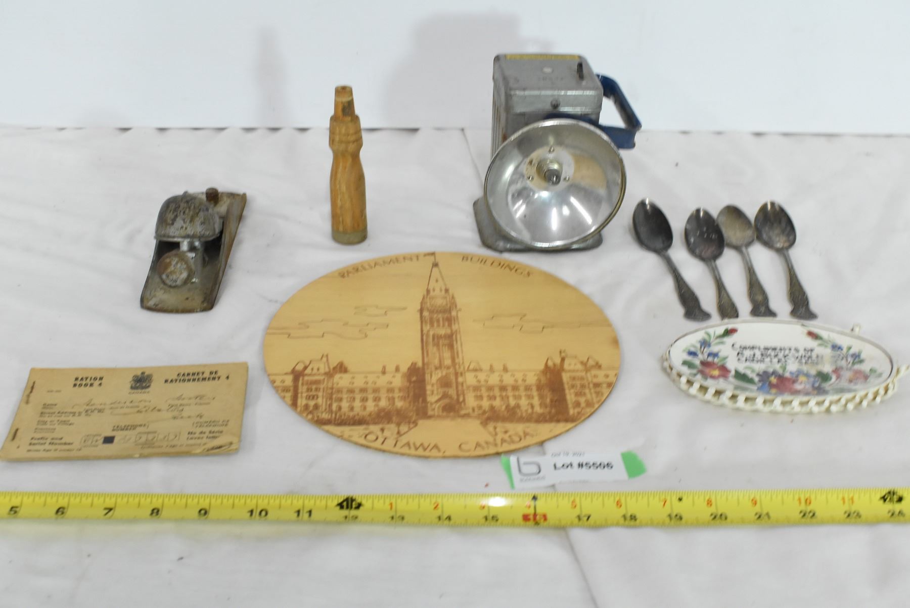 Vintage 6 Volt Flash, Block Planer, Antique Ration Card