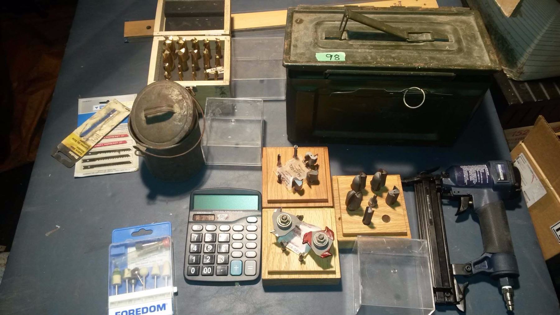 Vintage Ammo Box, Router Bits, Air Nailer, & Misc.