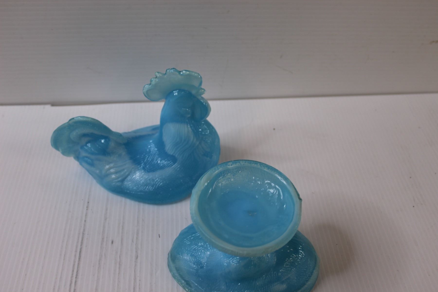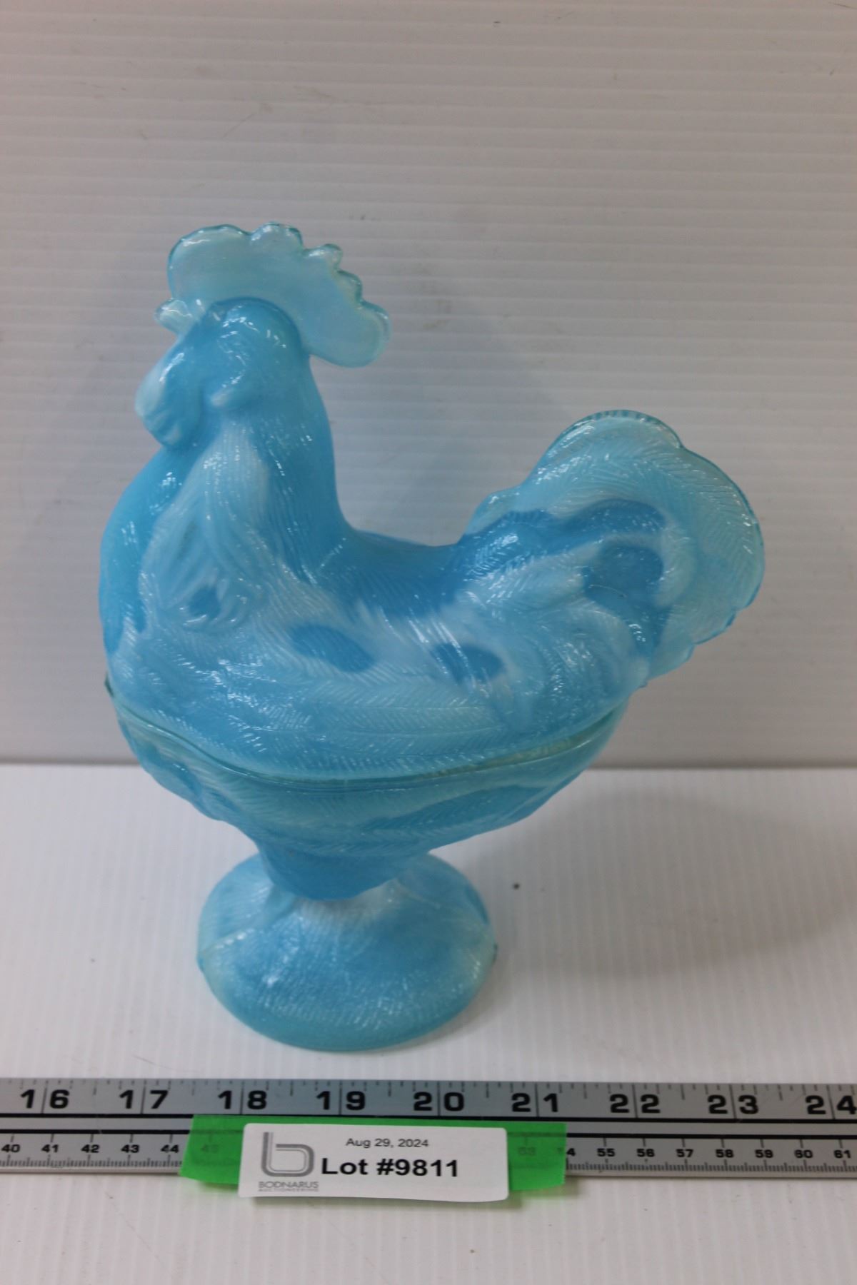 Vintage Blue Milk Glass Rooster Candy Jar - 8.5" x 7"