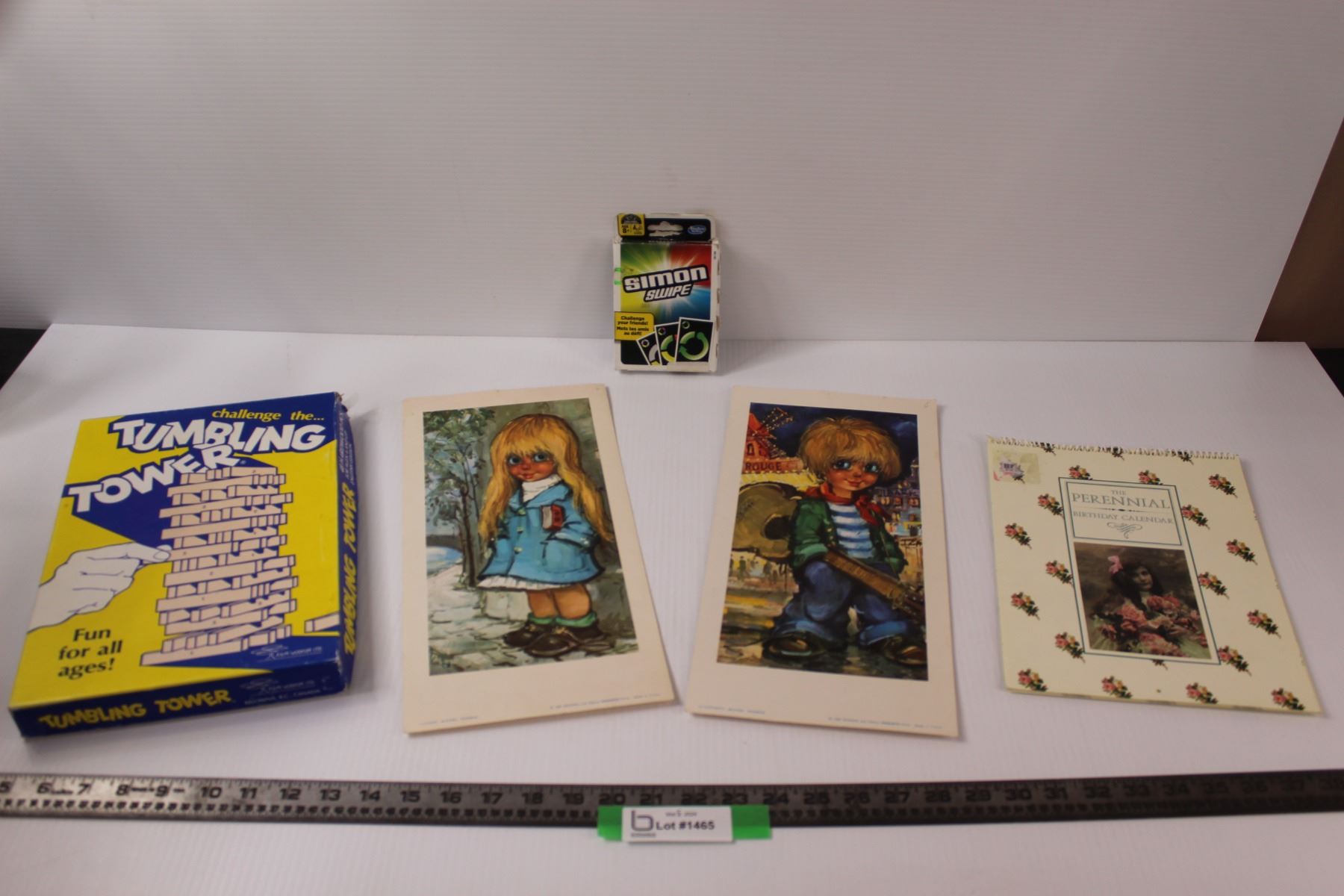 Vintage Boy & Girl Michel Thomas Prints, Tumbling Tower Game, Simon Swipe games & The Perennial Birthday Calendar