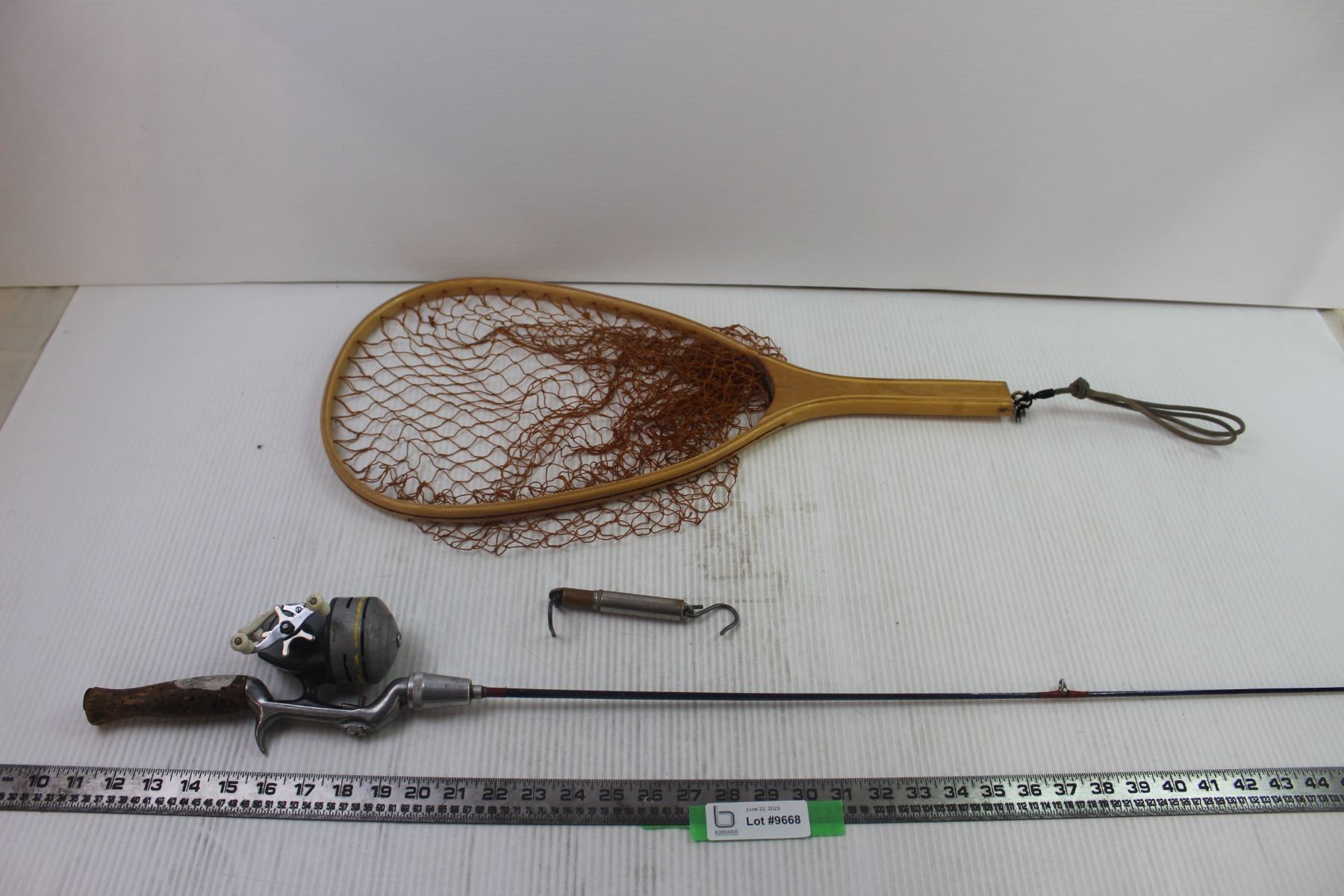 *Vintage Canada Centennial - Shakespeare 1967 Fishing Reel and Metal Rod + Vintage Sportsman's Model Cylindrical Fishing Scale Marked Pat Pend 1912 - Made in the USA + Vintage Wooden Hand Fishing Net. Great Grouping of Vintage Fishing Collectible Fishing Gear