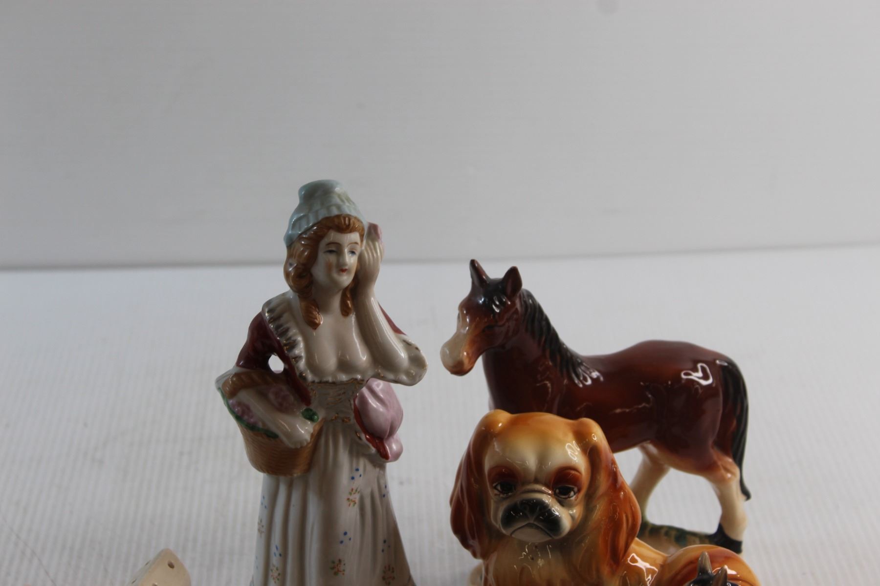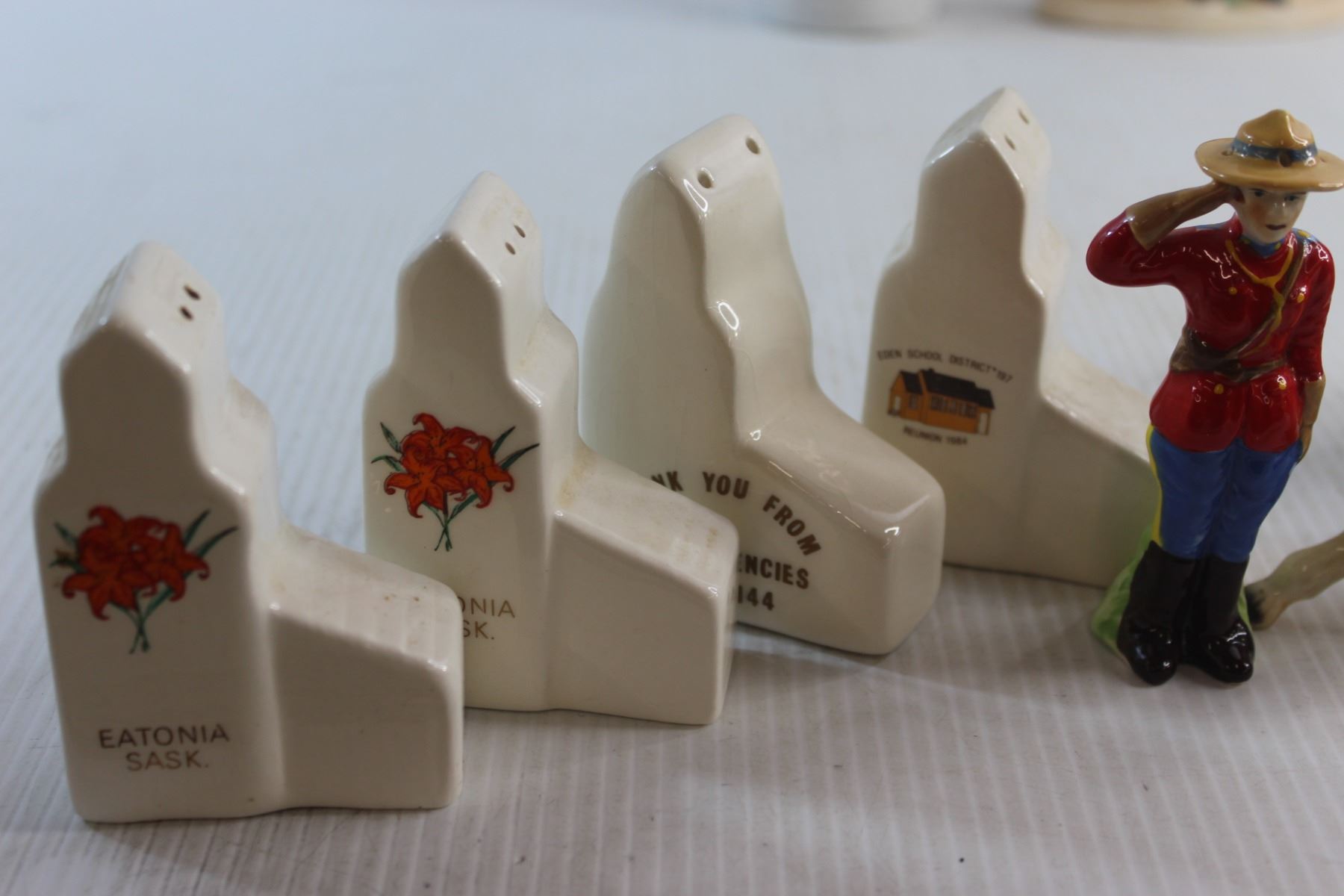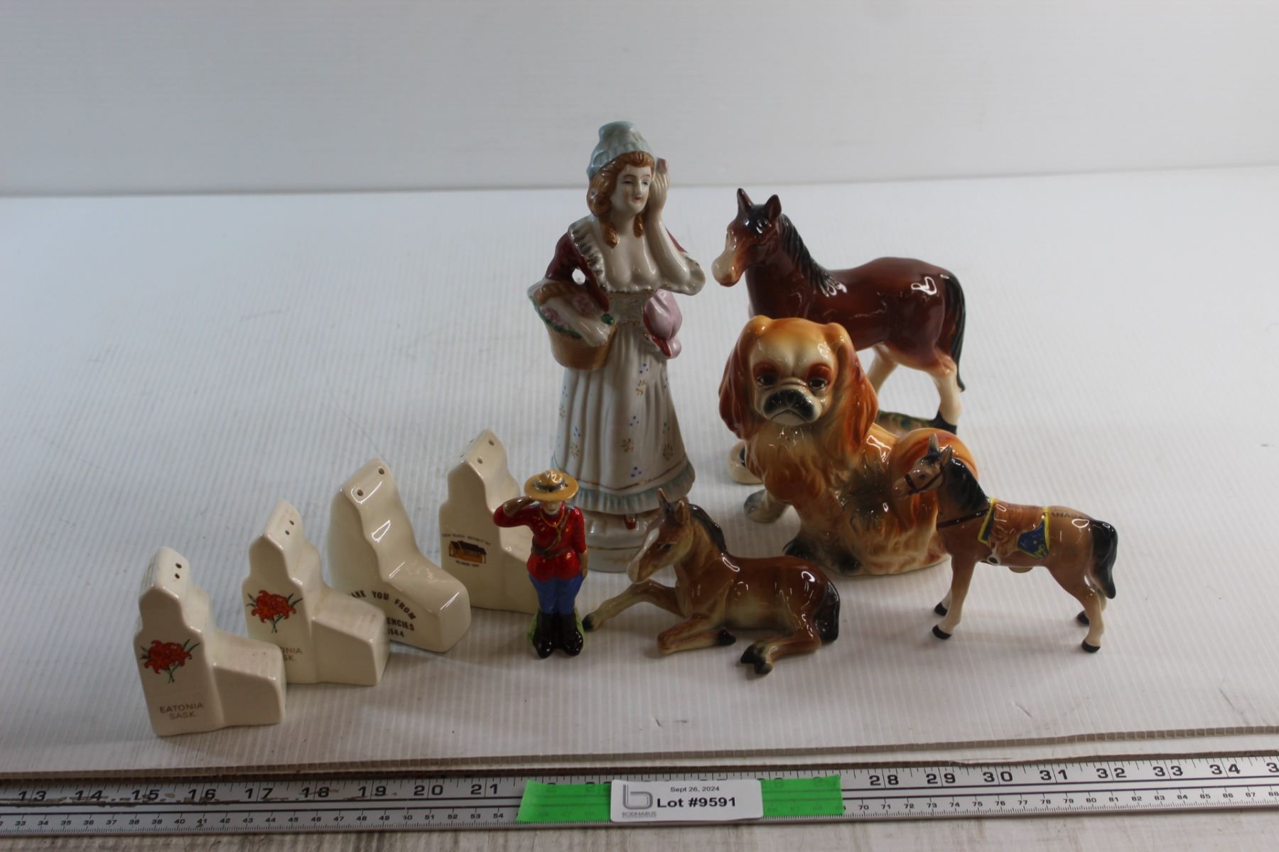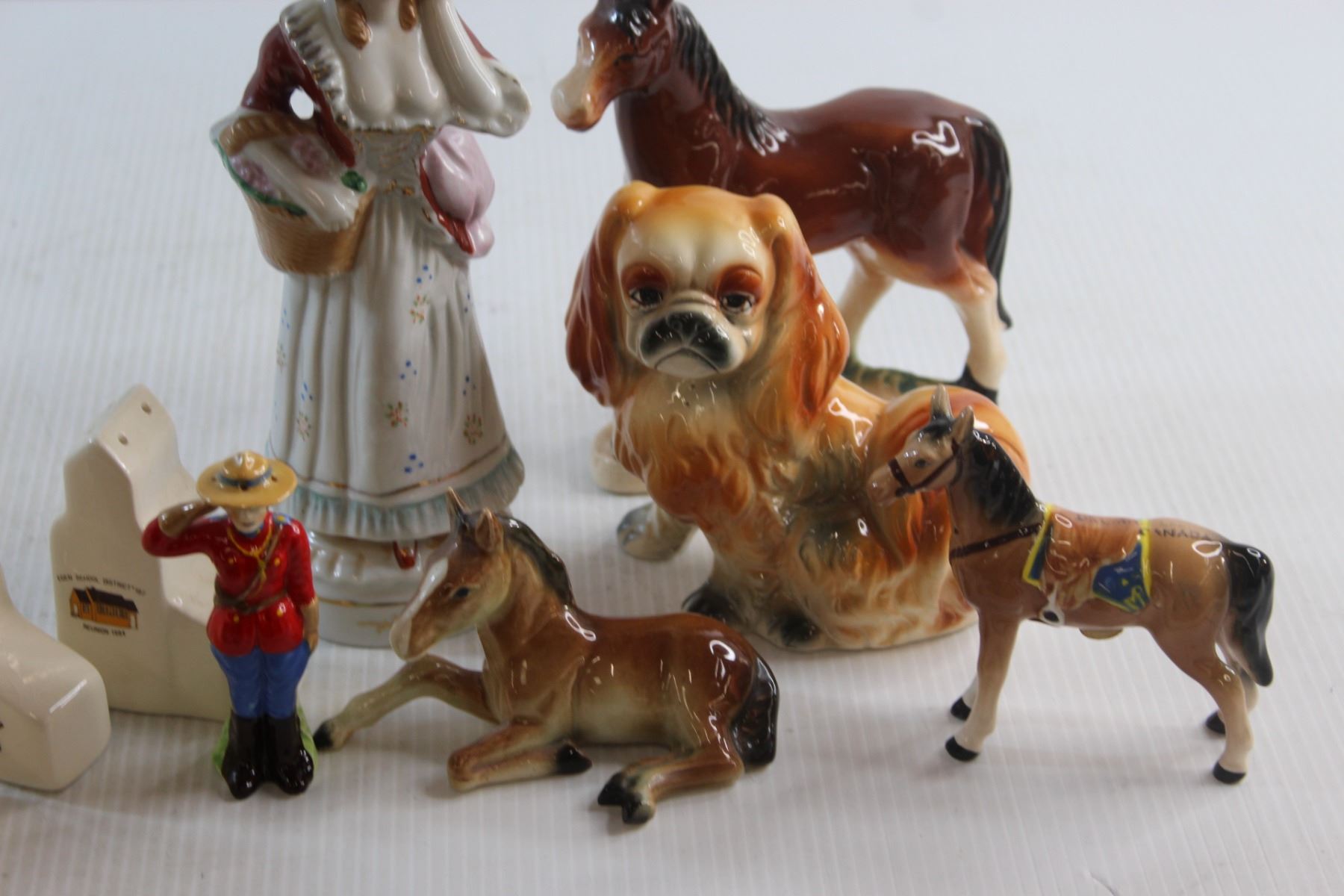 Vintage Ceramic Horses (2) Japan + Salt and Pepper Mountie and Horse + 2 Sets of Saskatchewan Elevator Salt & Peppers + Pekinese Ceramic Dog ( Japan )