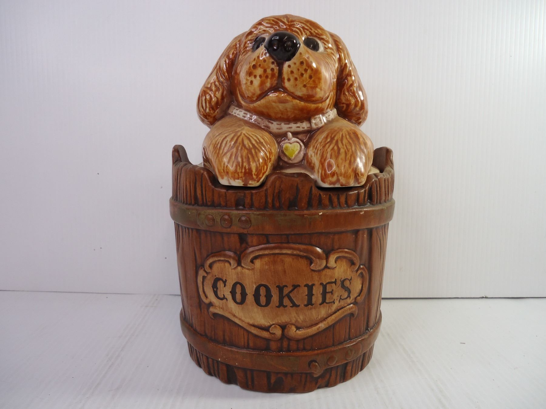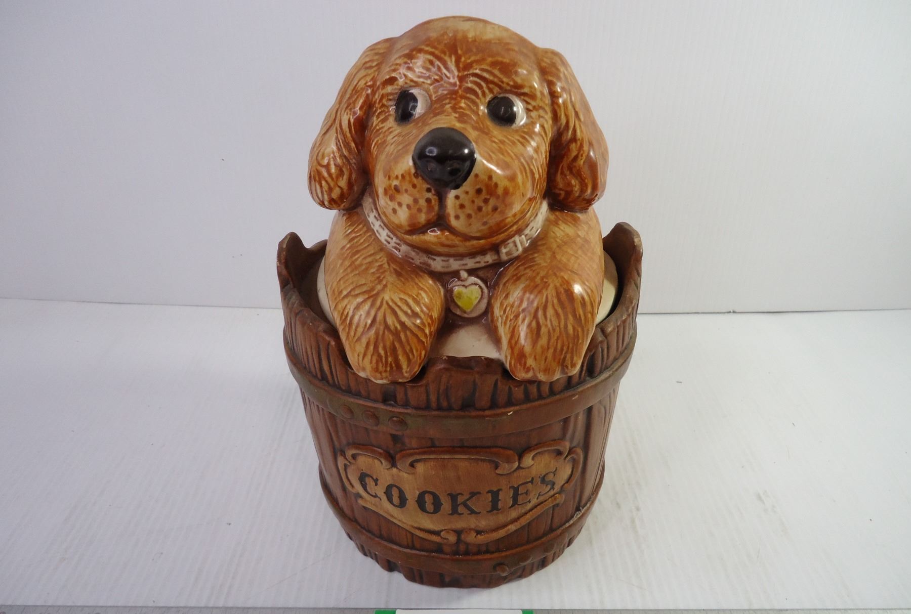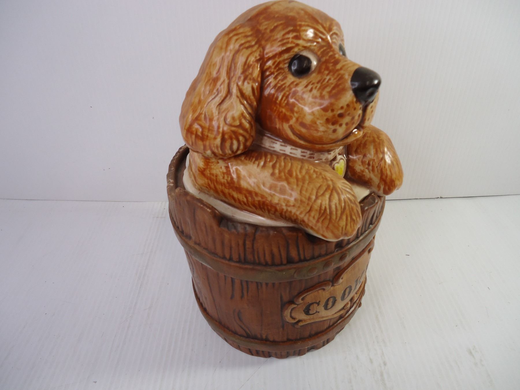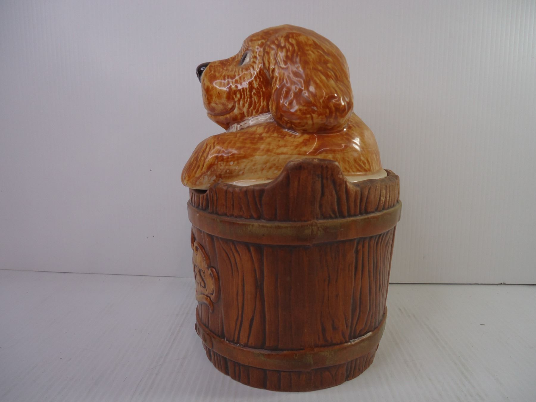 Vintage Ceramic Puppy in Bucket/Barrel Cookie/Treasure Jar-Made in U.S.A.