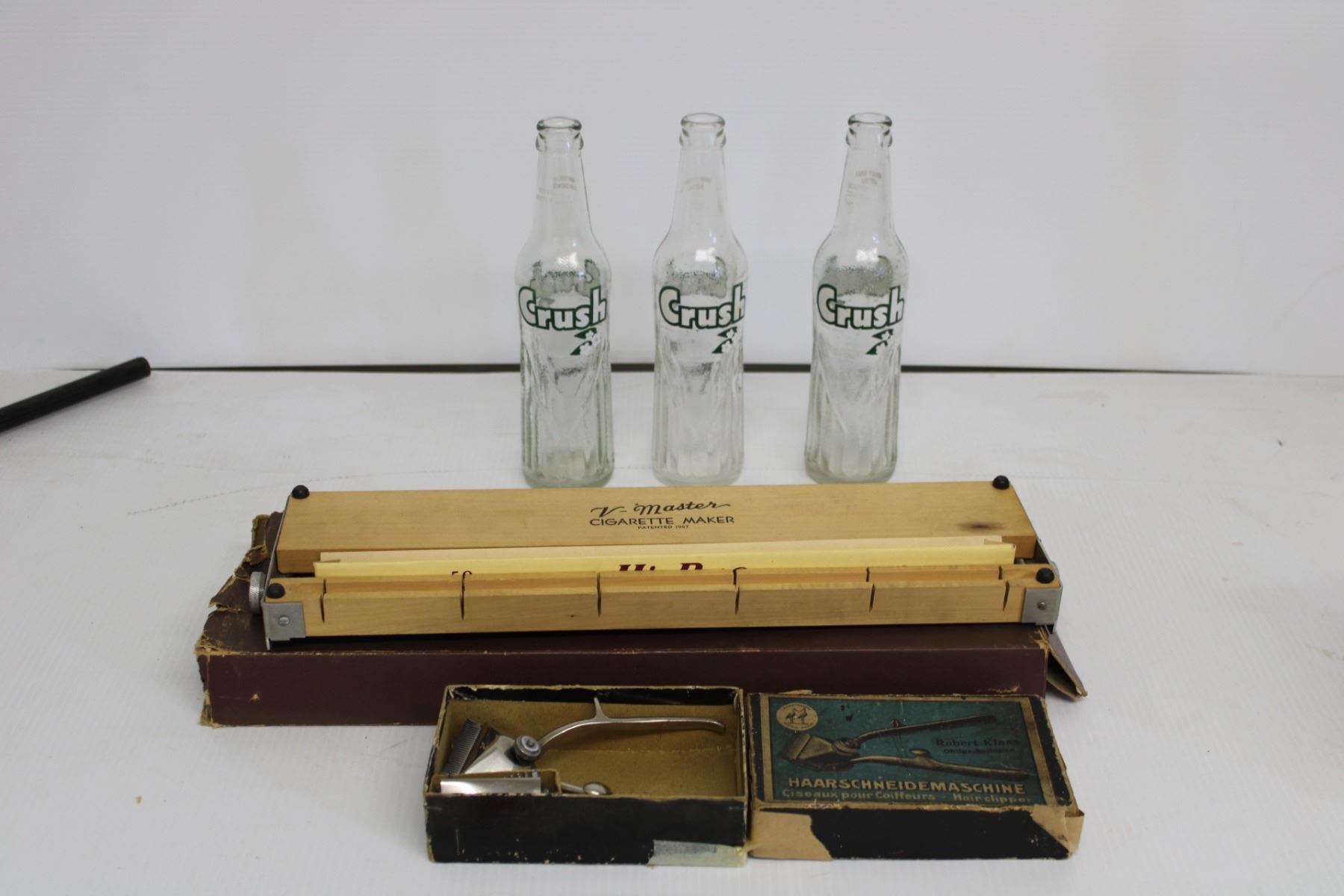 Vintage Cigarette Maker & Vintage Beard Trimmer, (3) Crush Glass Bottles