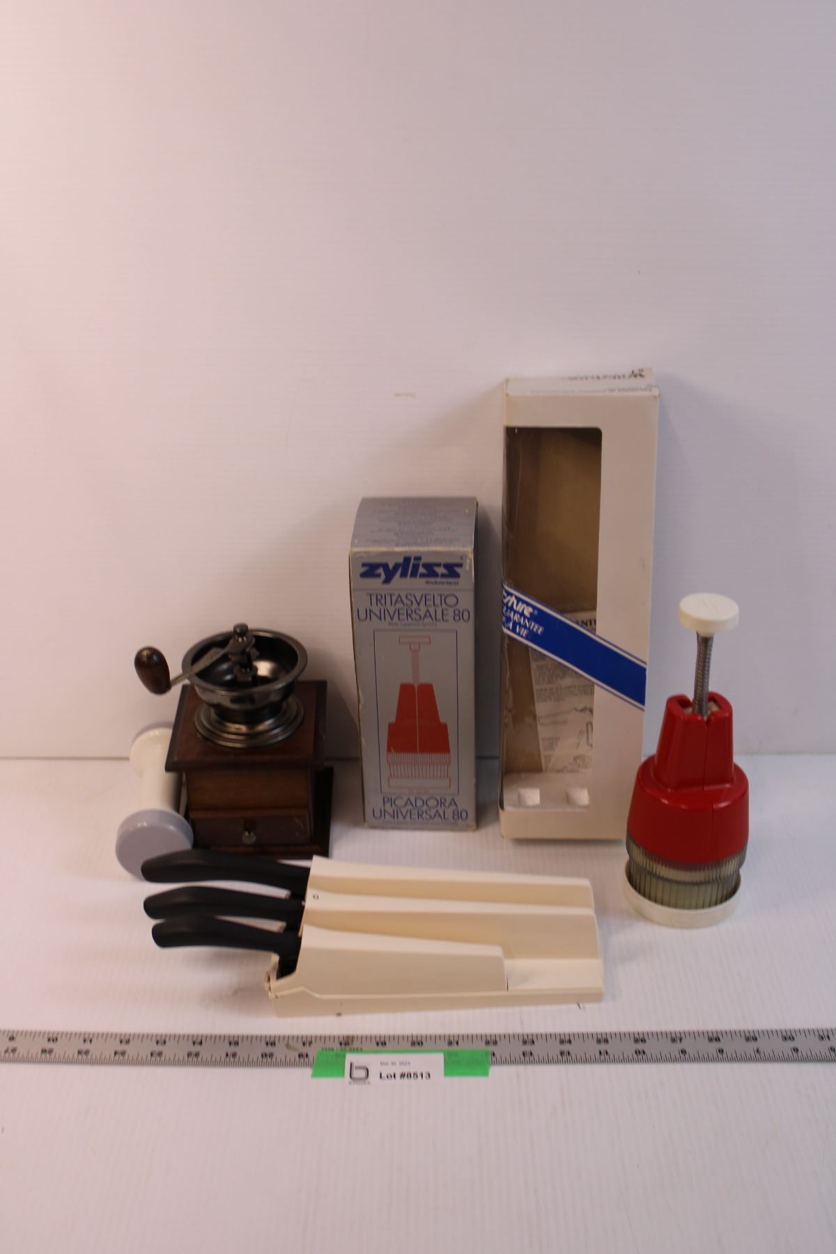 Vintage Coffee Grinder, Food Chopper, Knife Set and Garlic Press