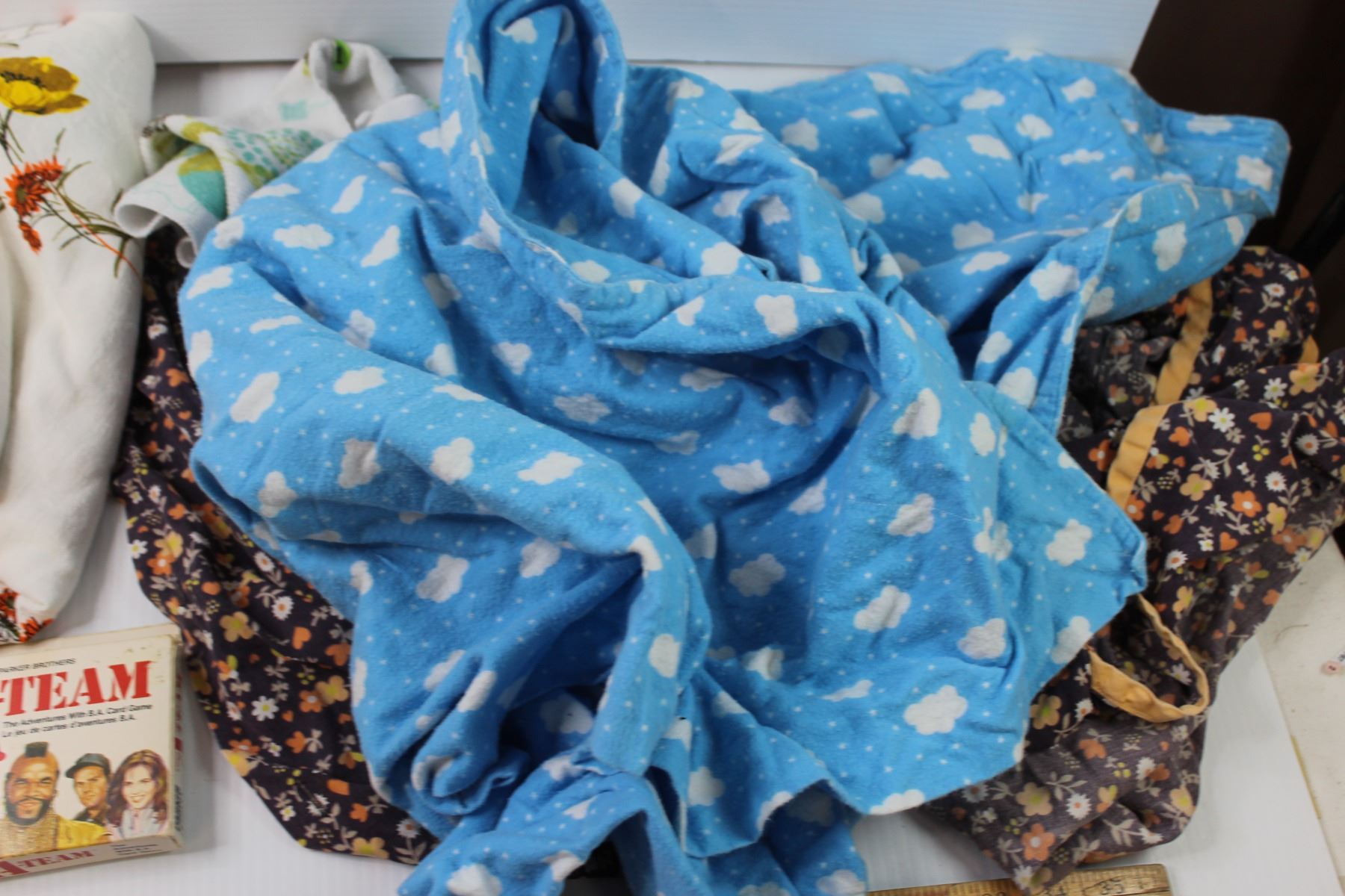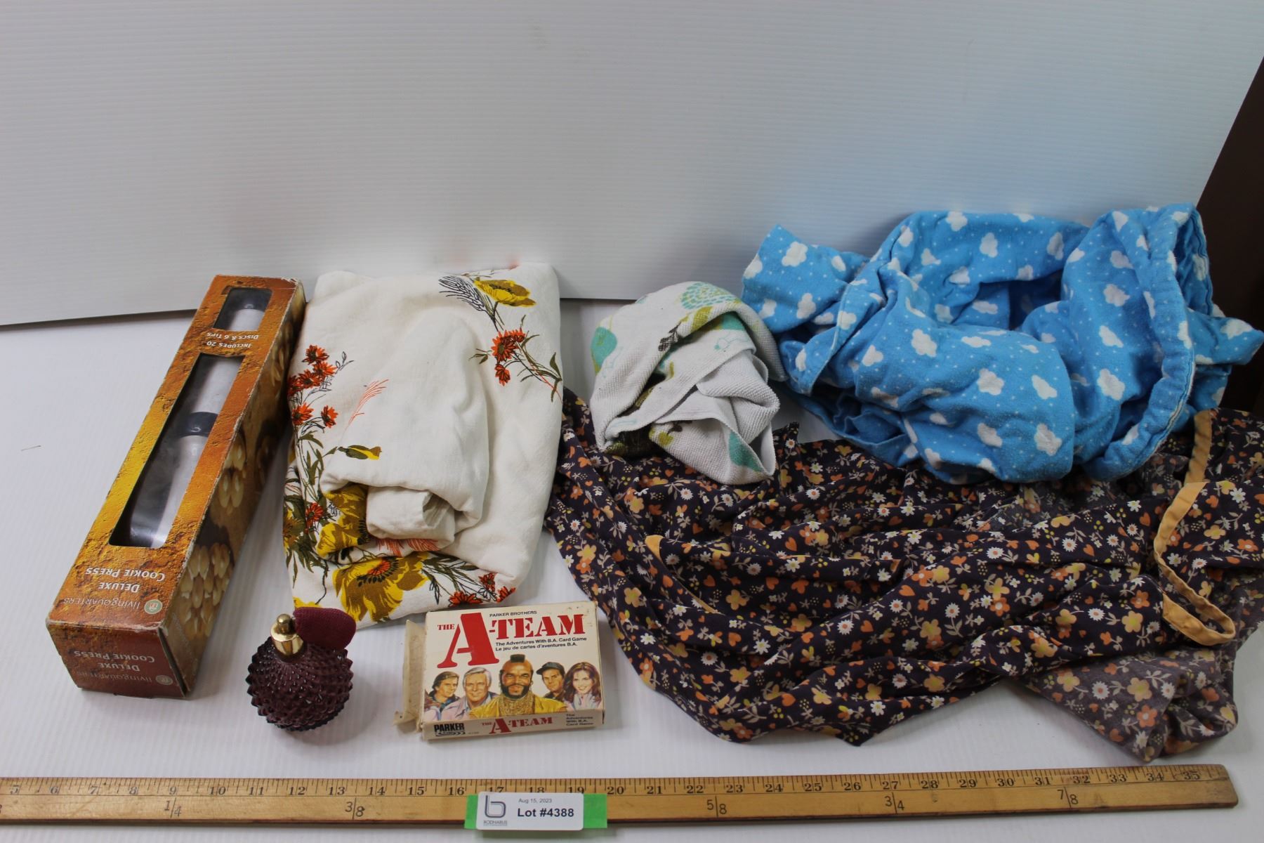 Vintage Cookie Press, Perfume Bottle, A Team Game, Linens