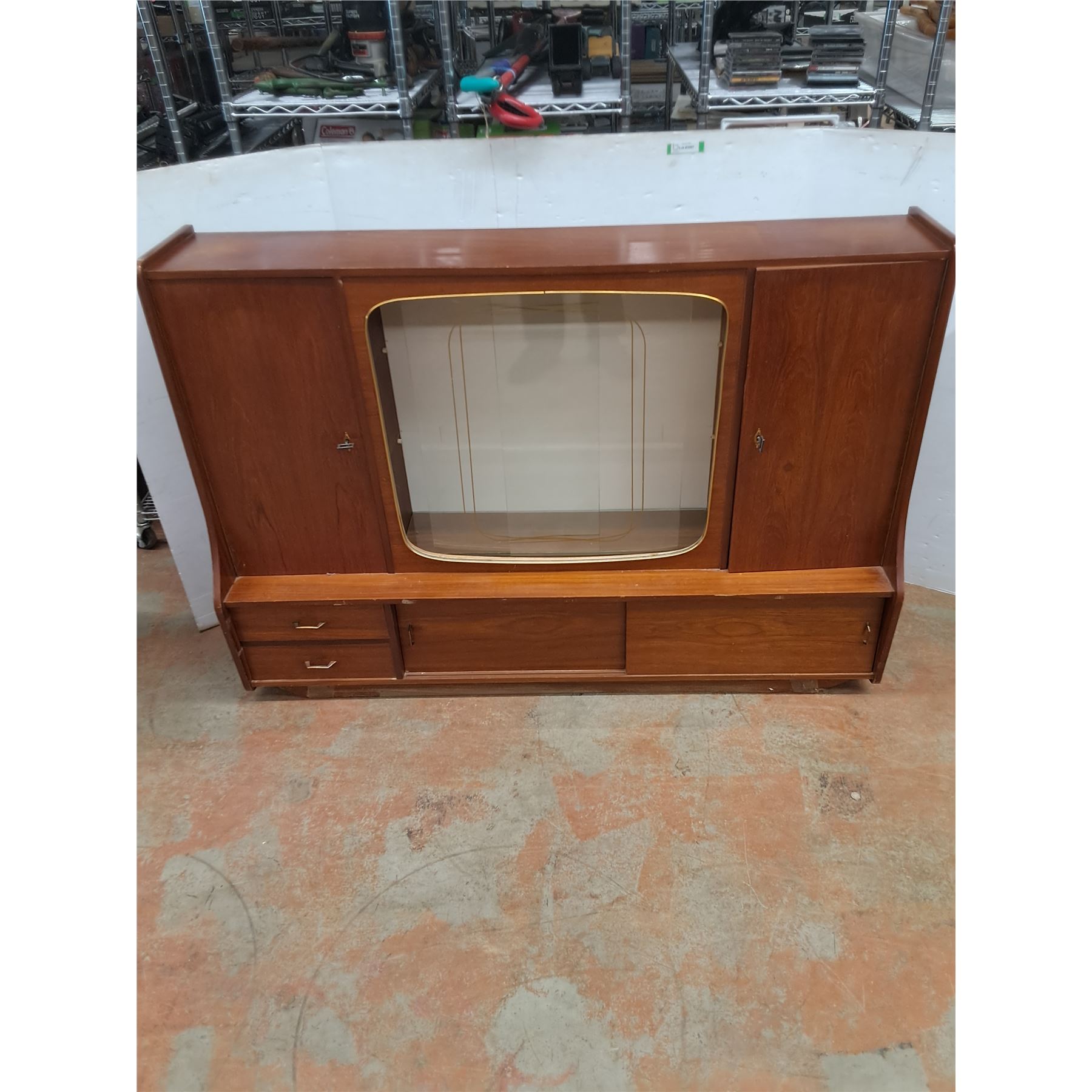 As Pictured.Very slight damage to finish. Glass works well, shelves on the side.63 1/2 x 16 x 44" ** CANNOT SHIP **
