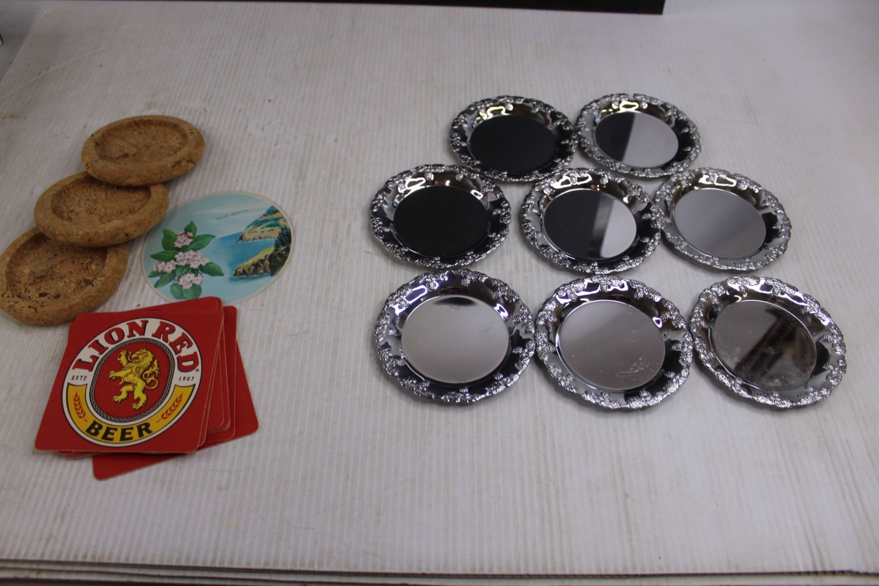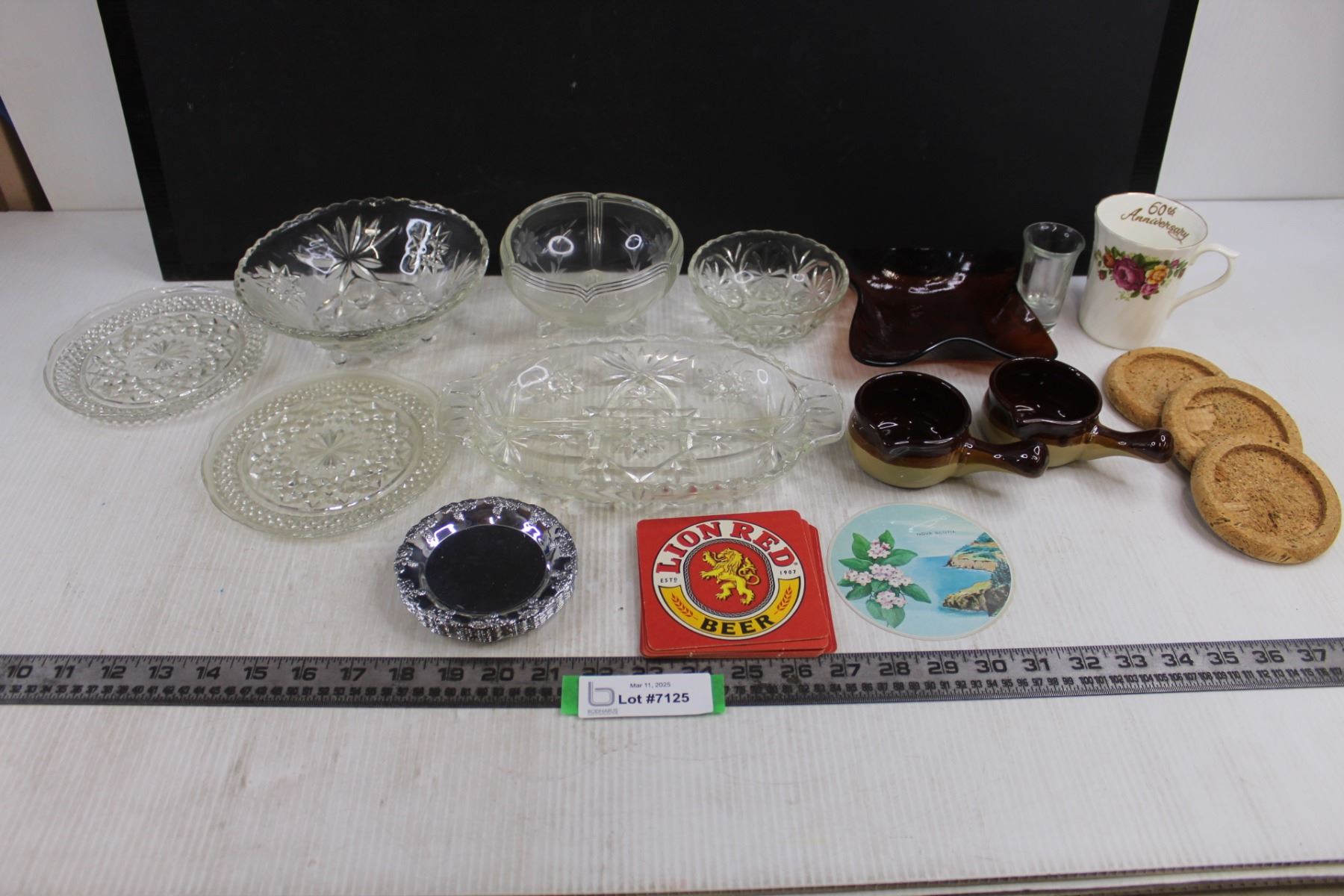 Vintage Dishes Lot (Glass Platters, 3-Footed Bowls, Coasters, Stainless Steel Candle Holders, Misc.)