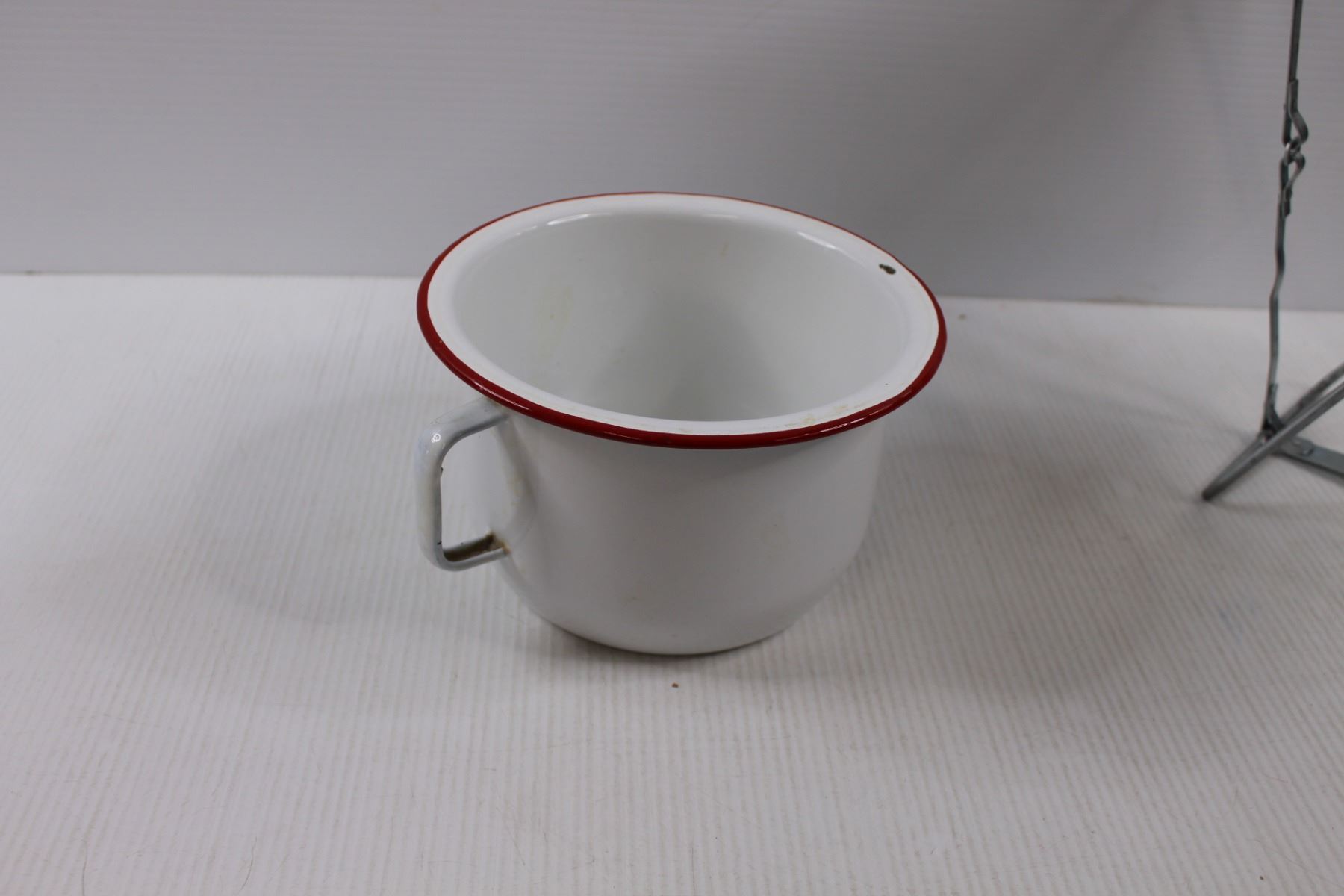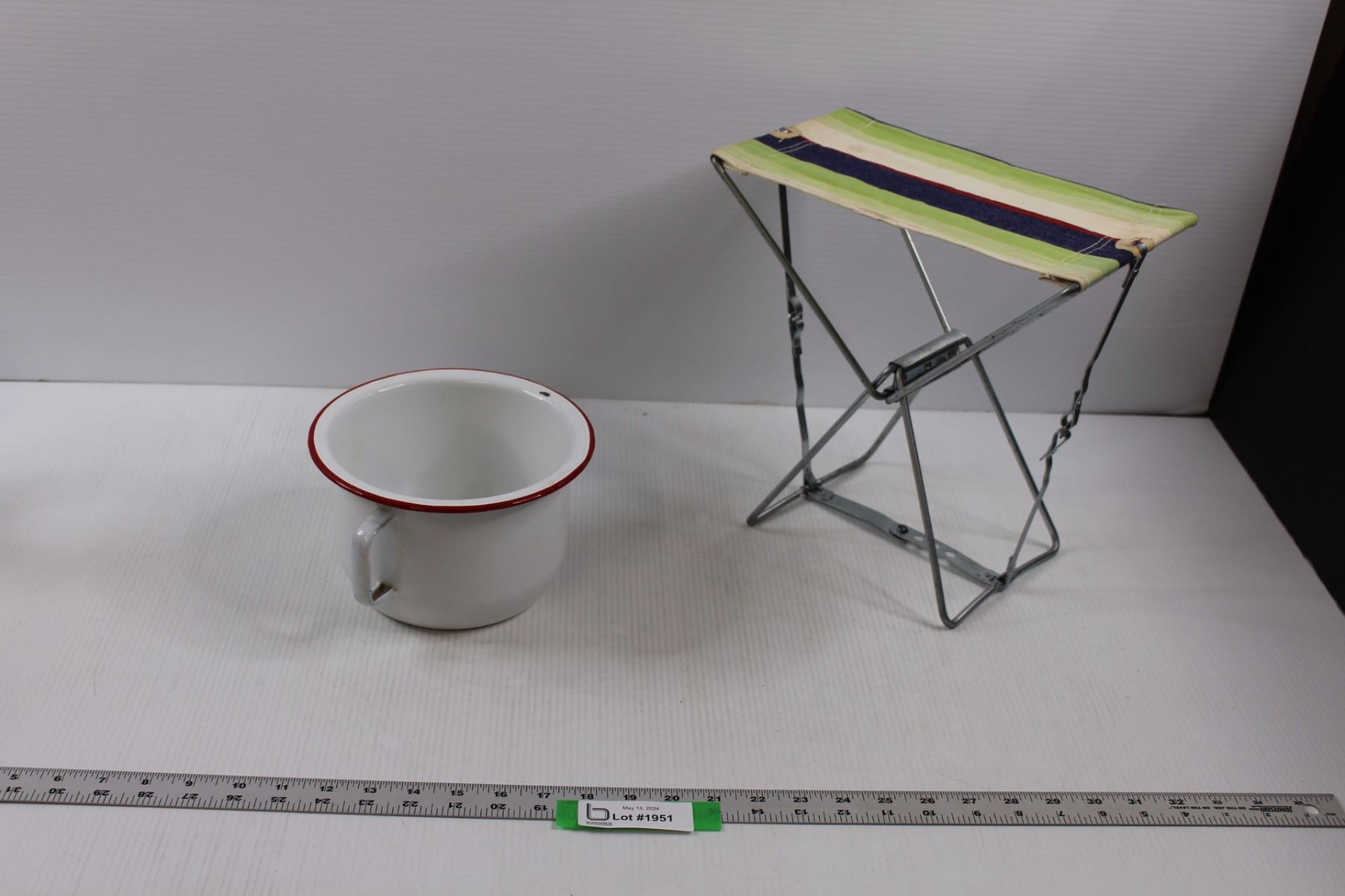 Vintage Enamelware Childrens Chamber Pot (Few chips) & Vintage Folding Camp Stool
