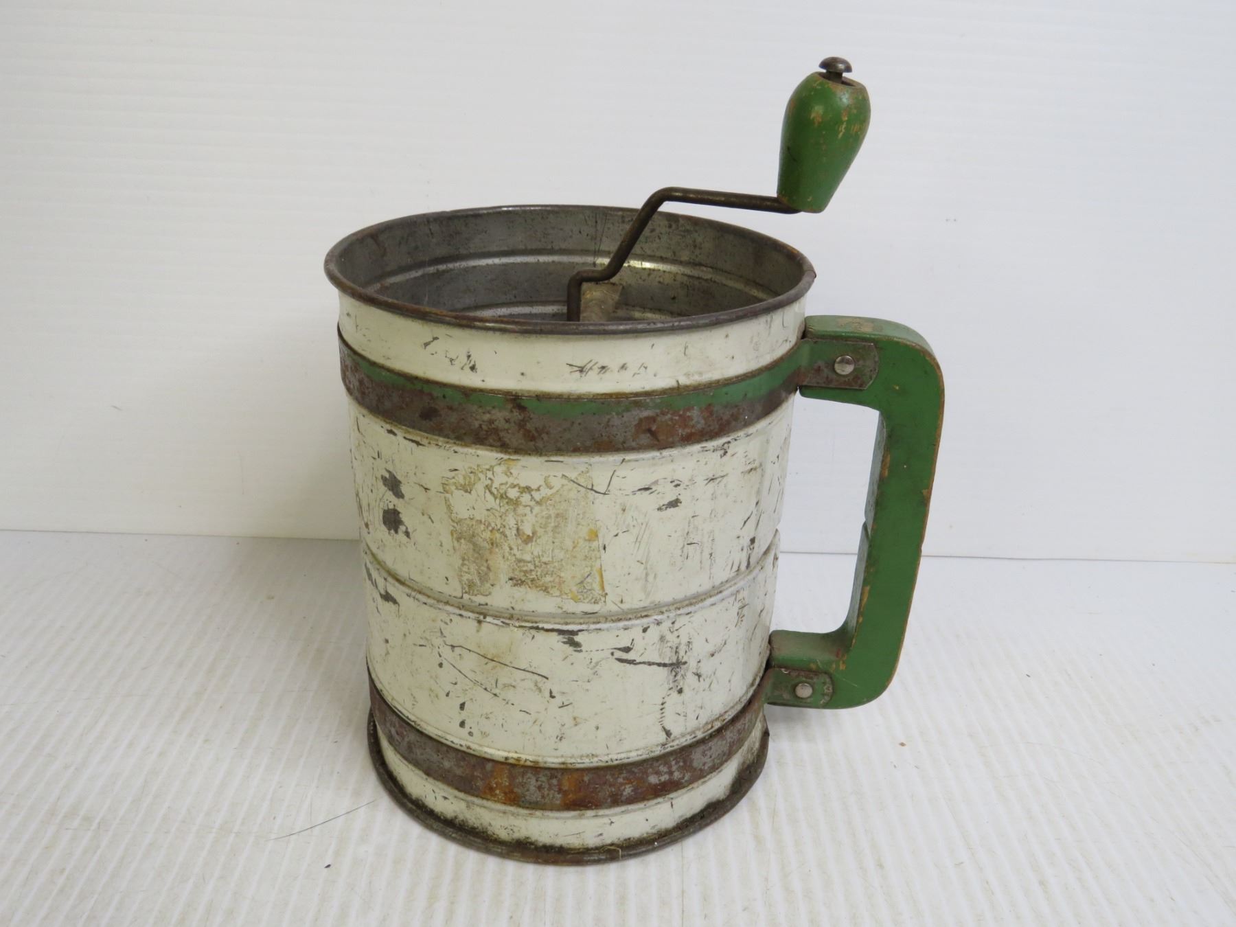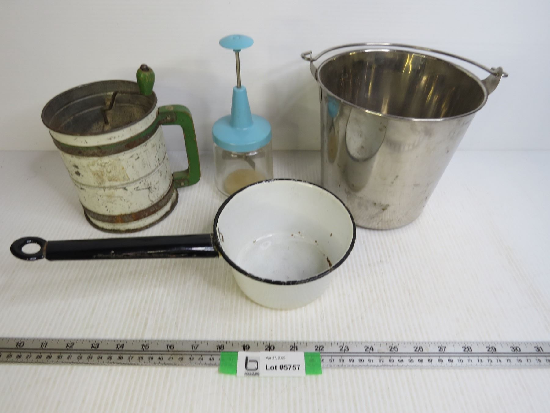 Vintage Flour Sifter - Metal Bucket - Food Chopper - Enamel Ware Pot