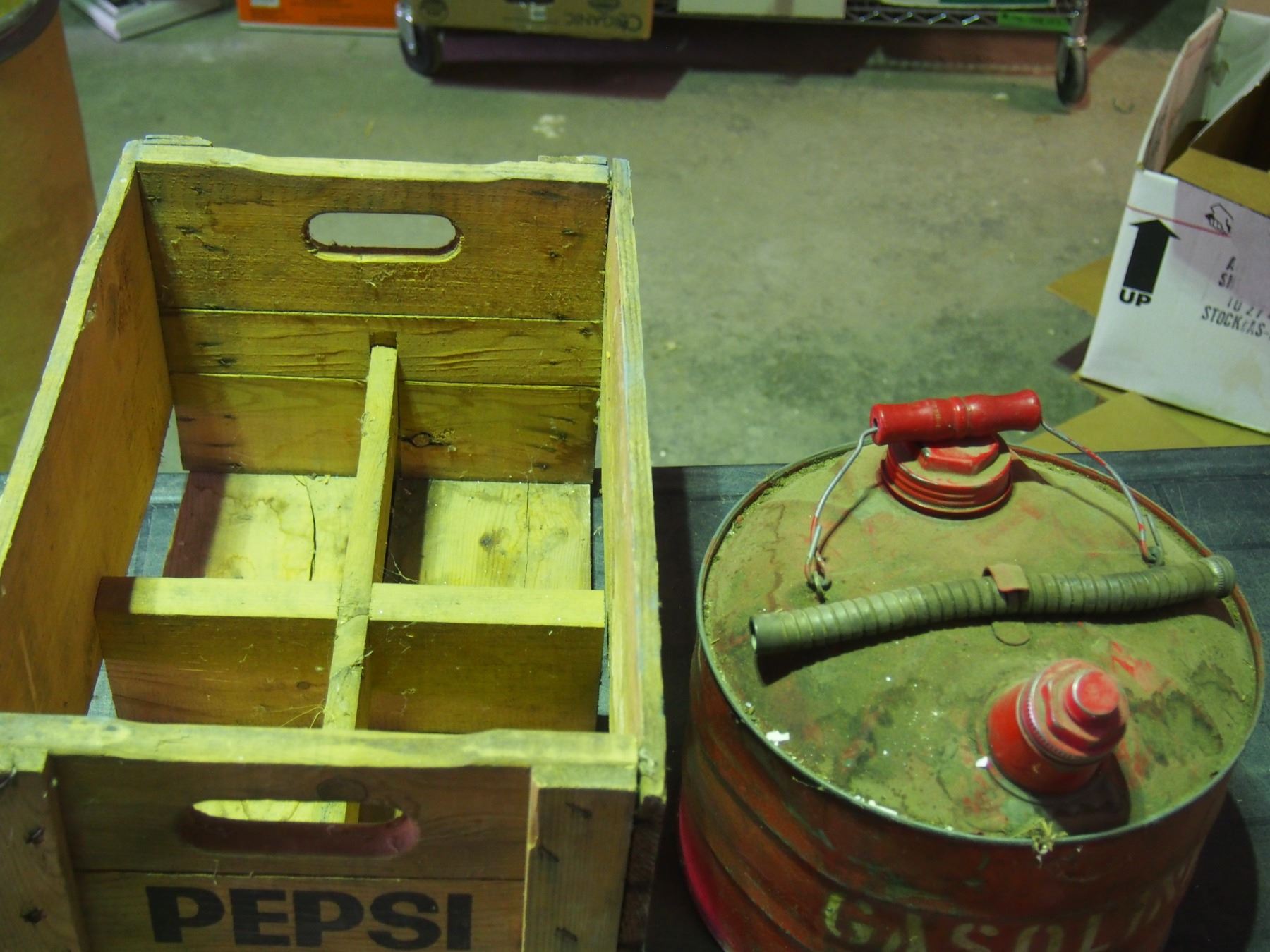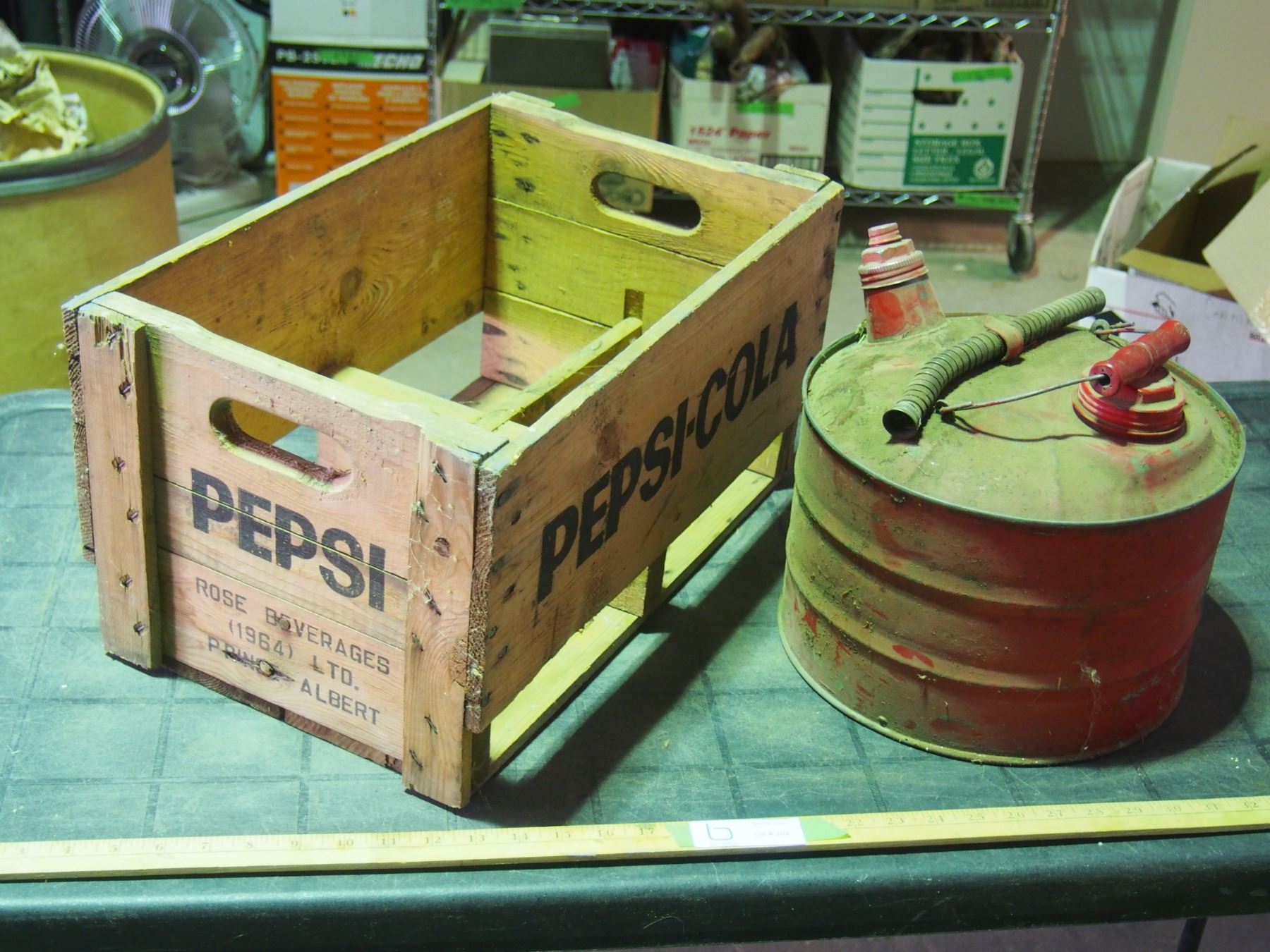 Vintage Gas Can and Vintage Pepsi Wooden Crate