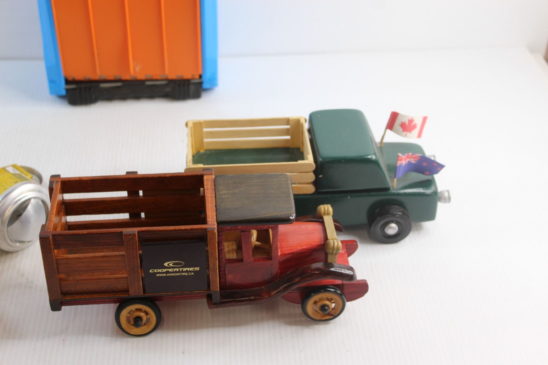 Vintage Hot Wheels Car Carrier with 18 Cars - Including an Original 1970 Red Line Purple Bugeye- Good Paint + Cooper Tires Wooden Truck ( Hand Crafted ) Plus Hand Crafted Wooden New Zealand/Canada Truck + Hand Crafted Beer Can Racing Car (Cuba)