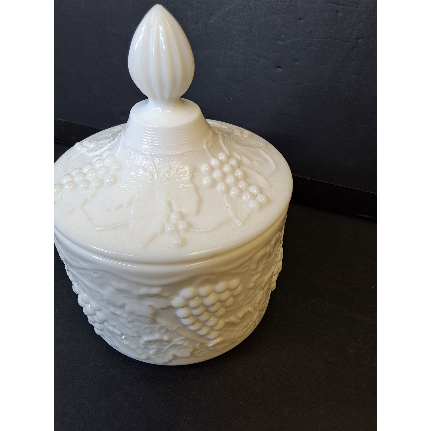 Vintage Imperial Brand Milk Glass Grape Vine Pattern Lidded Candy Dish - 6  x 5