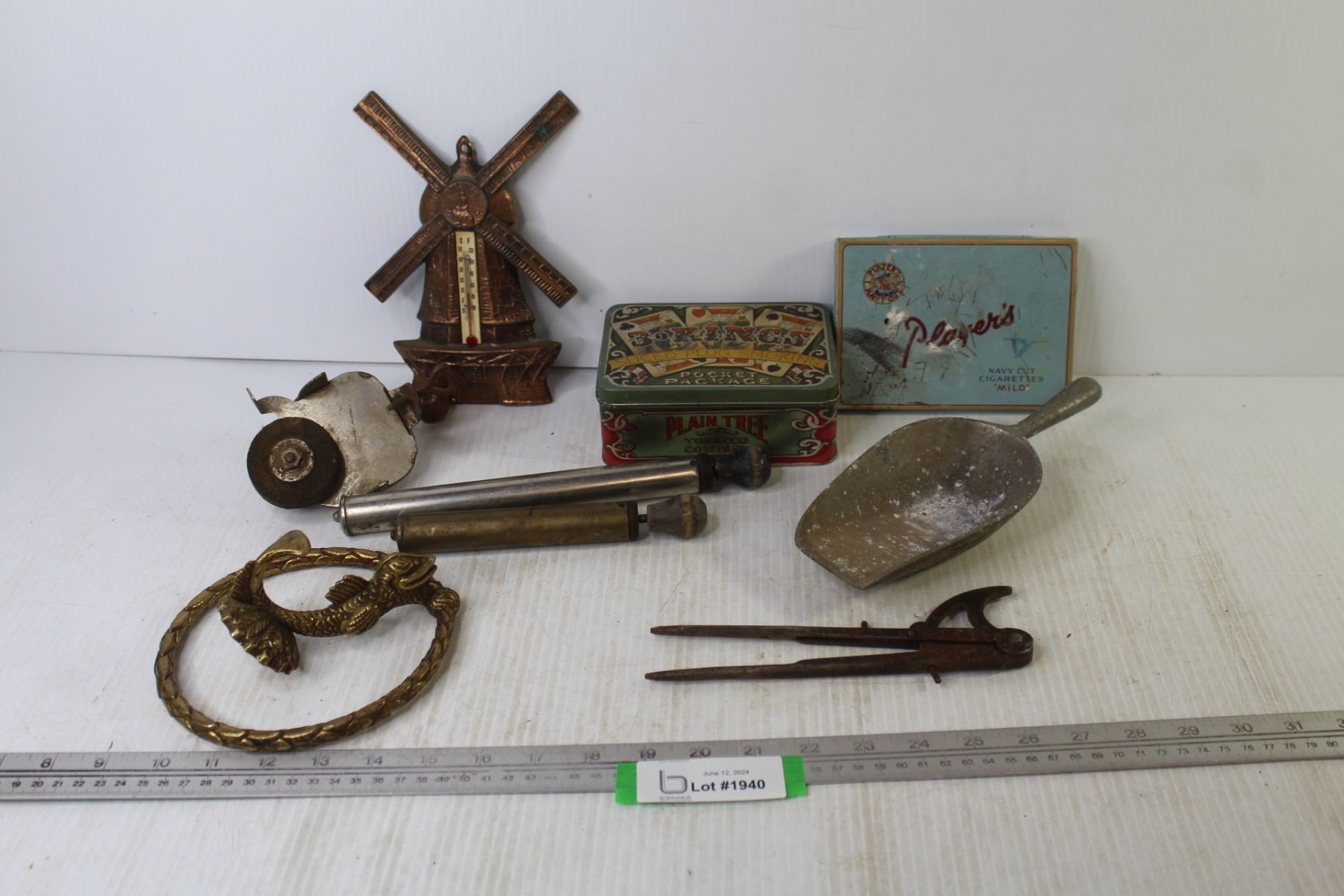 Vintage Items - Towel Holder - Thermometer - Tabacco Tins - Scribe - Hand Air Pumps - Hand Grinder