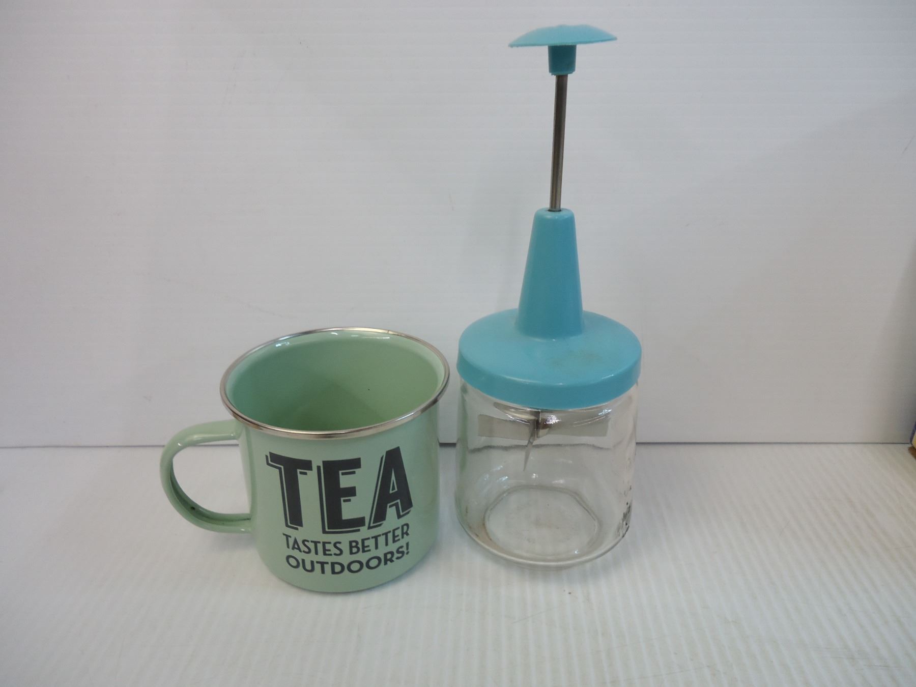 Vintage Kitchen Assortment-Thermos, Tea Mug & Strainers, Pastry Moulds, Chopper/Salt/pepper, Pancake