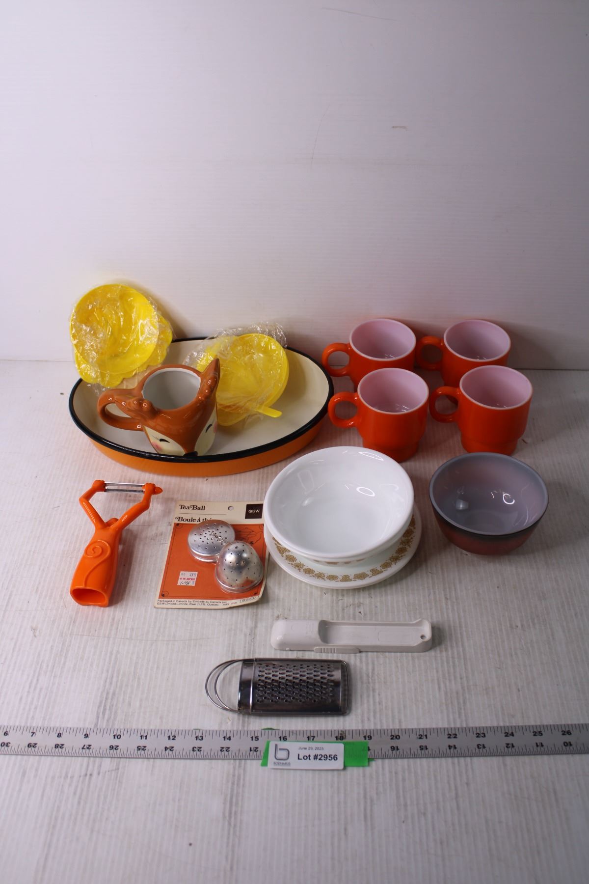 Vintage Kitchen Items - Milk Glass Mugs, Corelle Bowls and Plates, Misc.