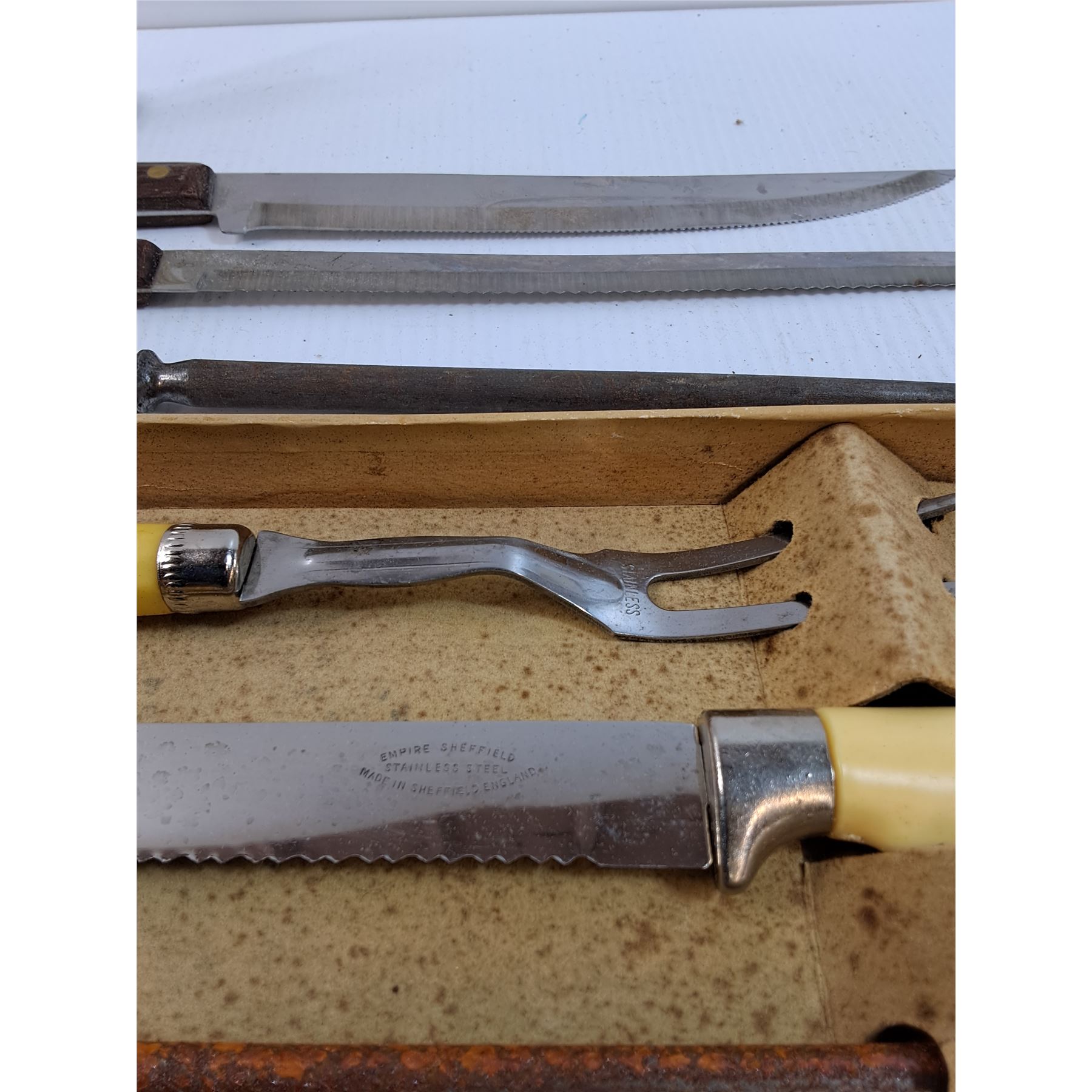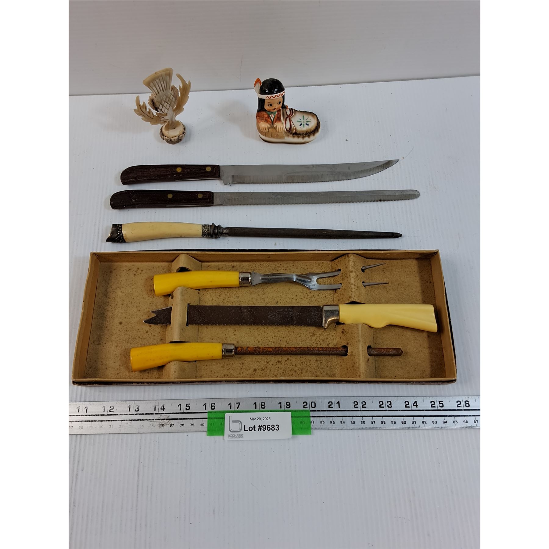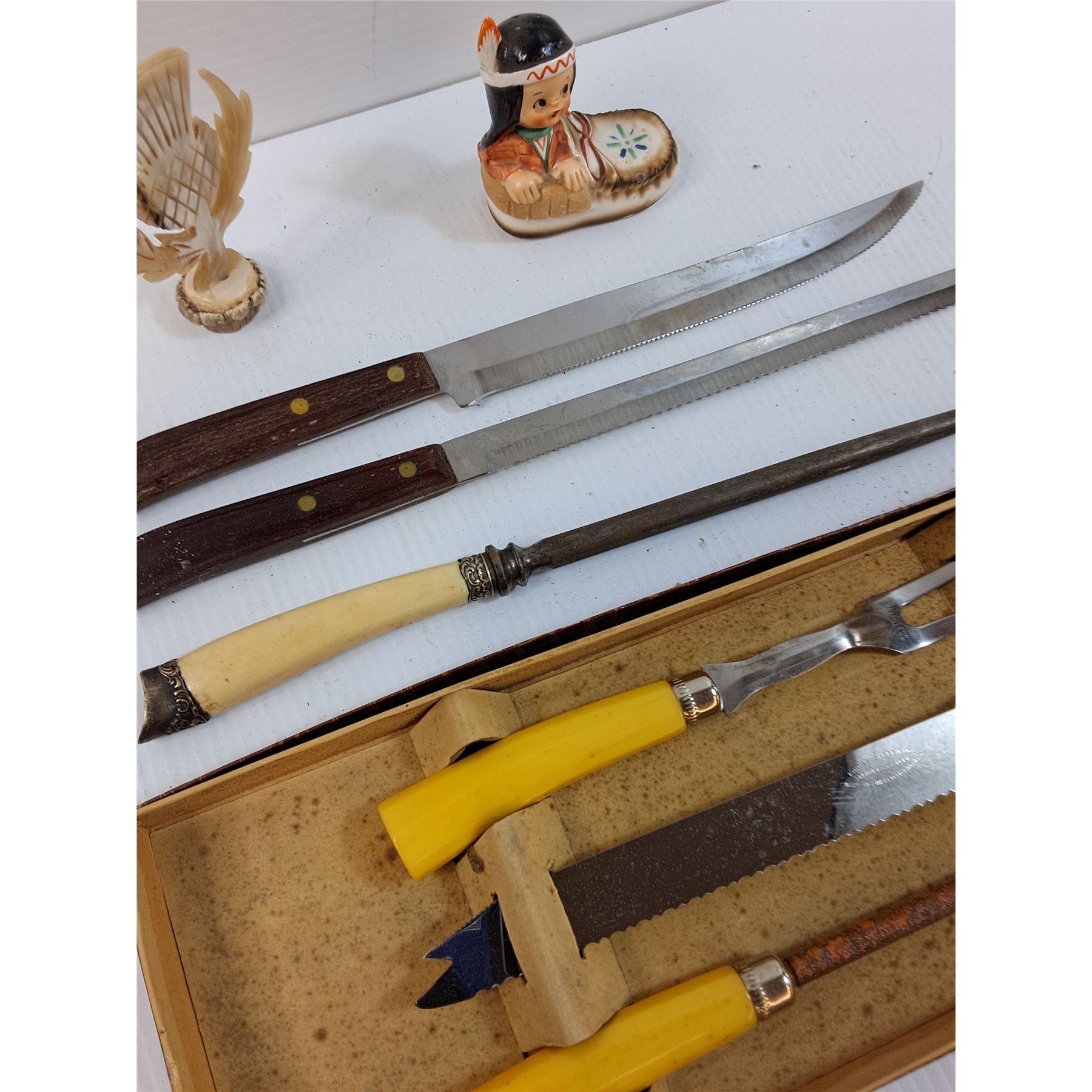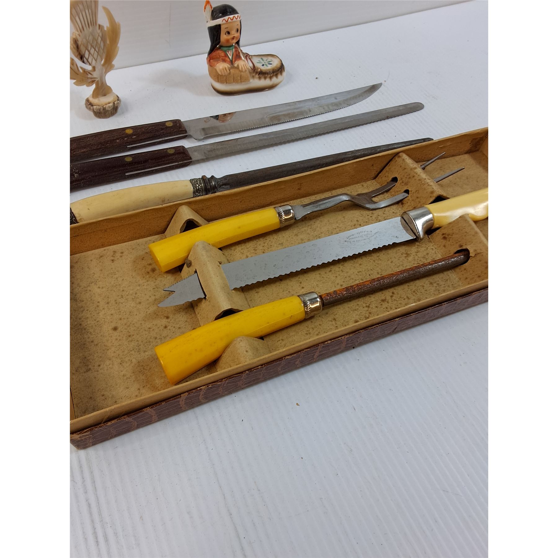 Vintage Knife Carving Set, Knife Sharpener, (2) Knives, Indigenous Pepper Shaker, Misc