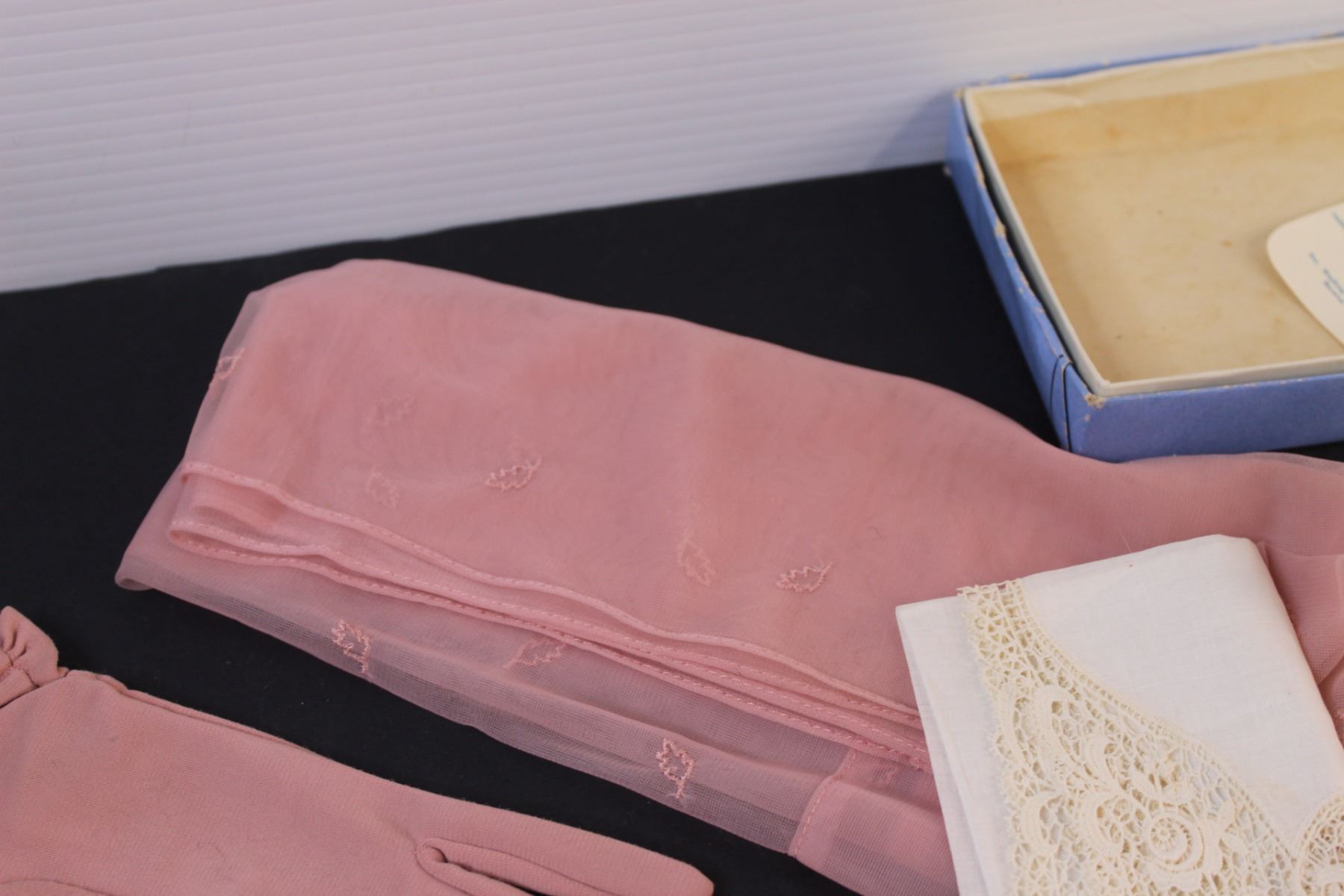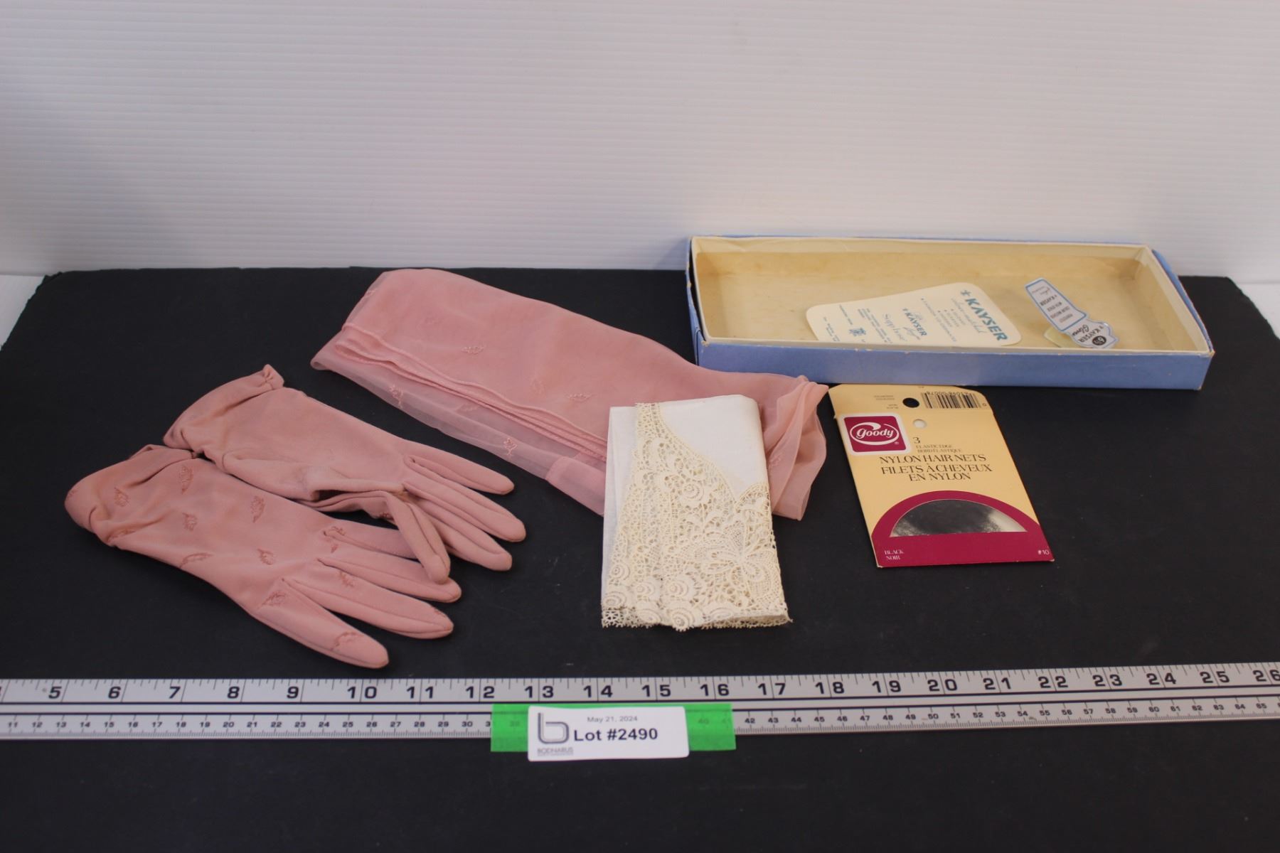 Vintage Ladies Gloves & Matching Scarf, Lace Napkin & Hairnet