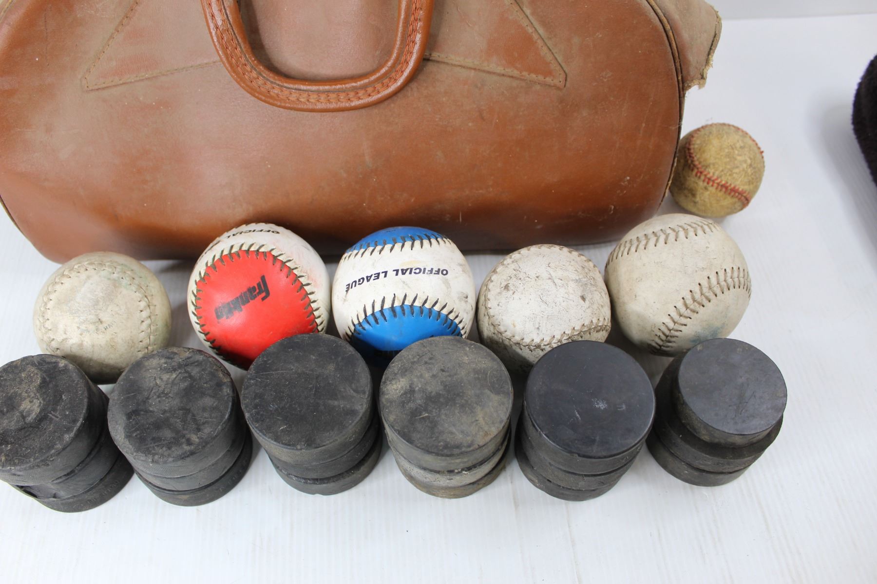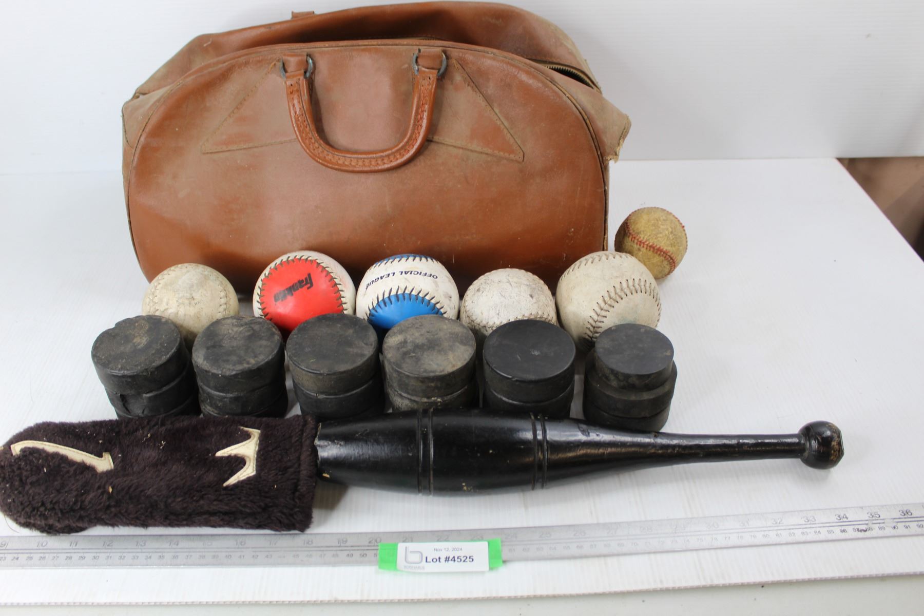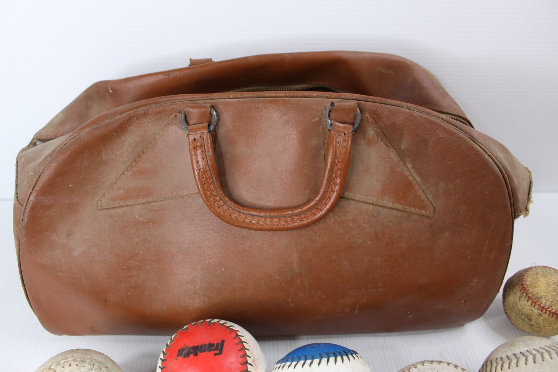 Vintage Leather Duffel Bag, (6) Baseball, Wooden Juggling Club/ Baton, Misc.