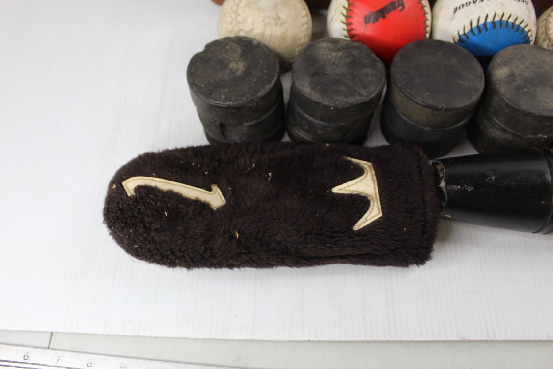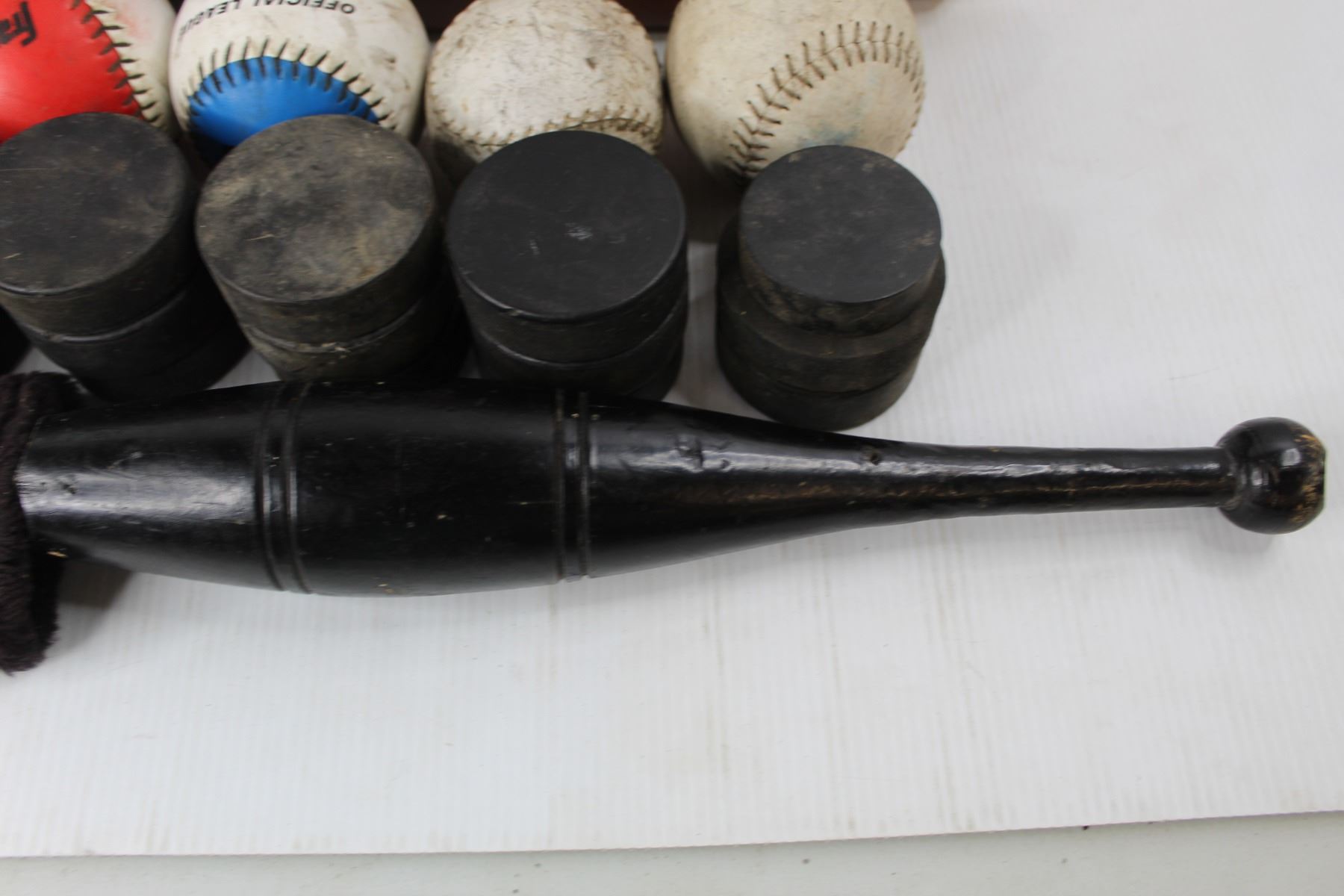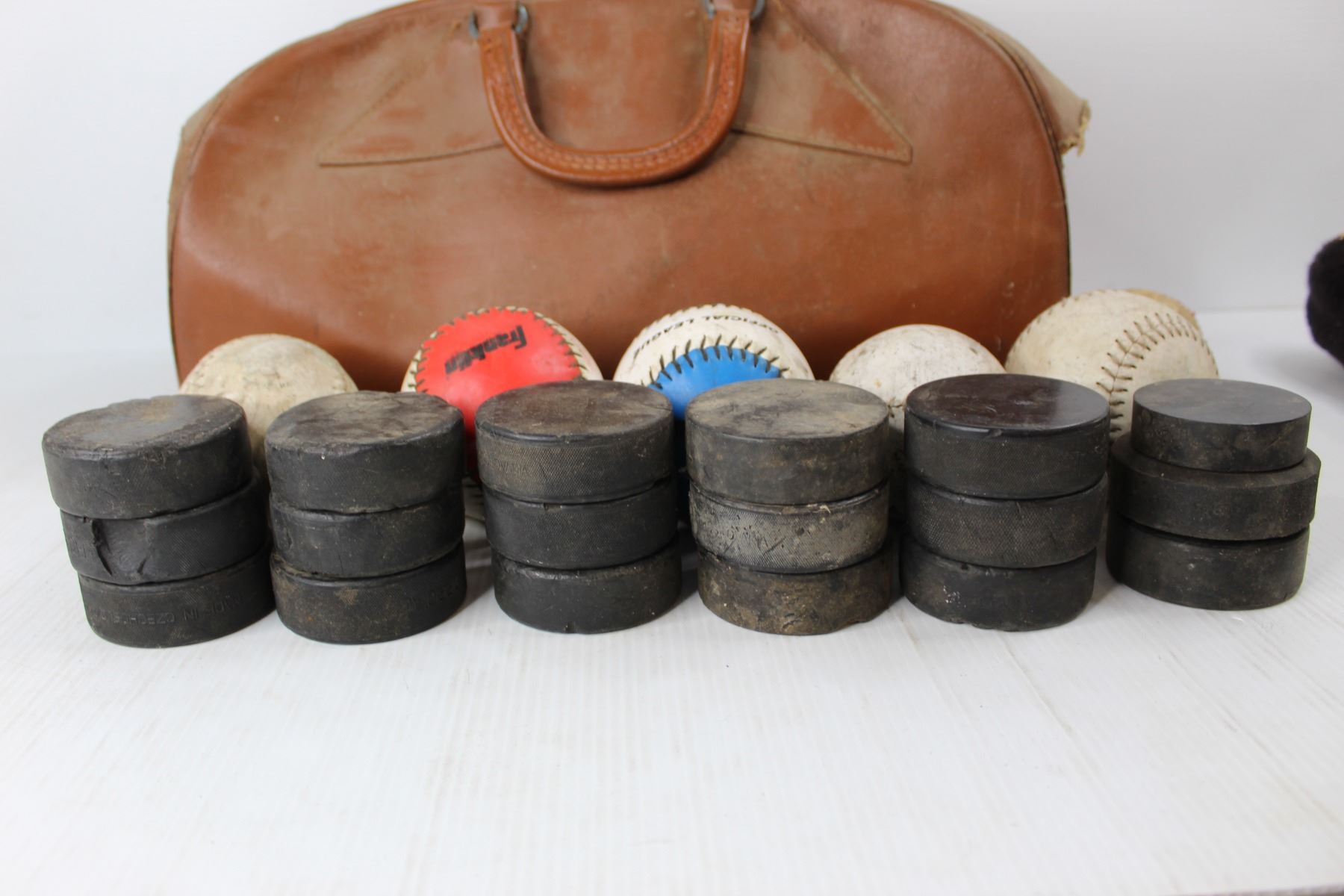 Vintage Leather Duffel Bag, (6) Baseball, Wooden Juggling Club/ Baton, Misc.