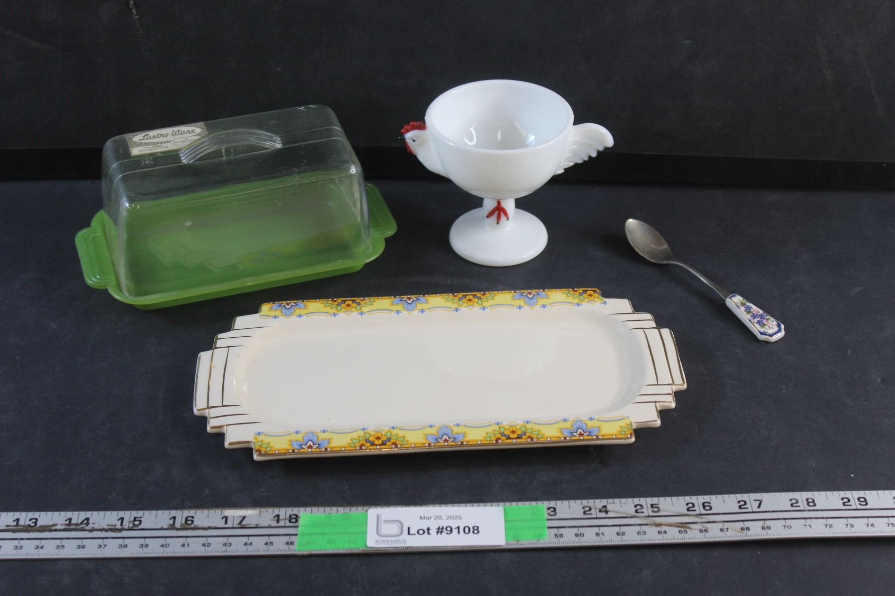 Vintage Lustro Ware Butter Dish, Milk Glass Rooster Cup, Swinnertons Ceramic Serving Tray and Decorative Dessert Spoon