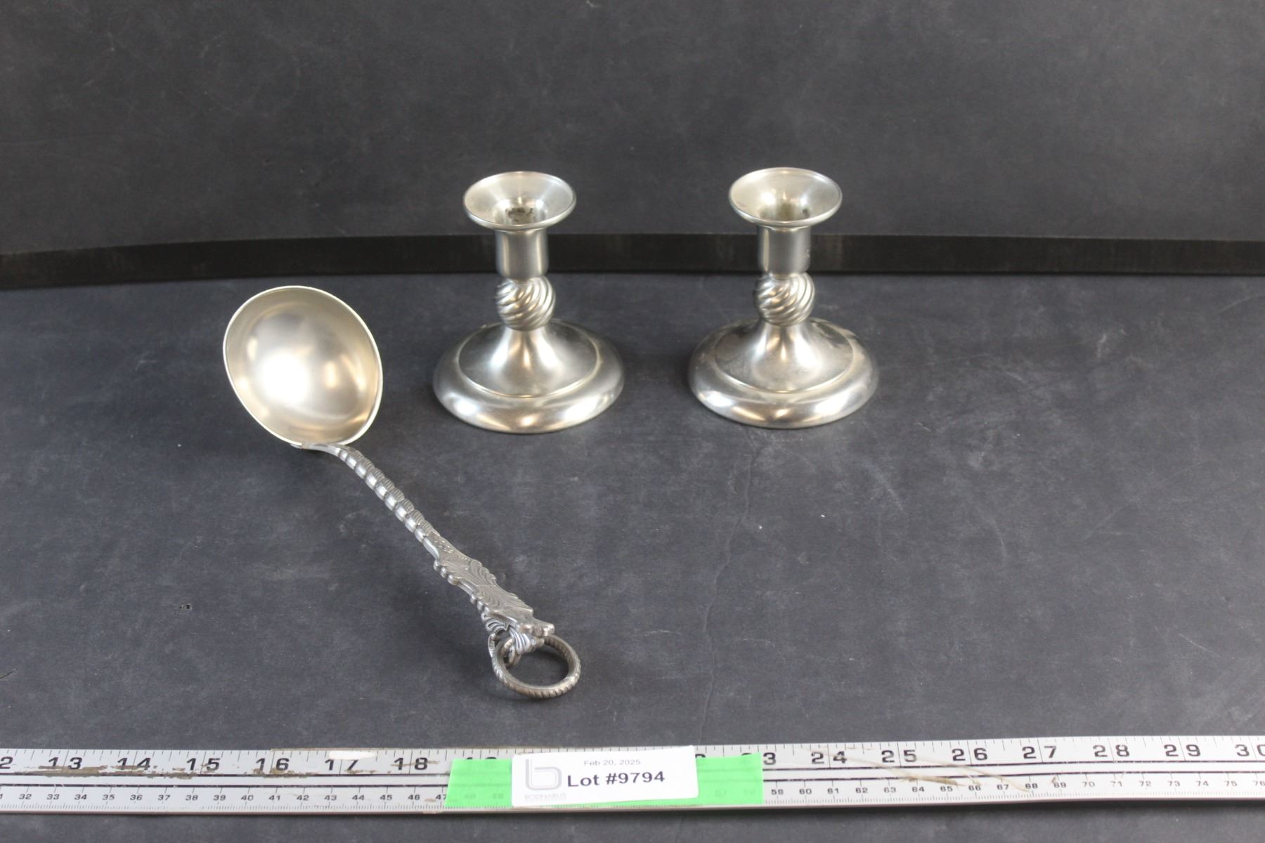 Vintage Pewter Candle Stick Holders and Norwegian Pewter Spoon - Made in Holland