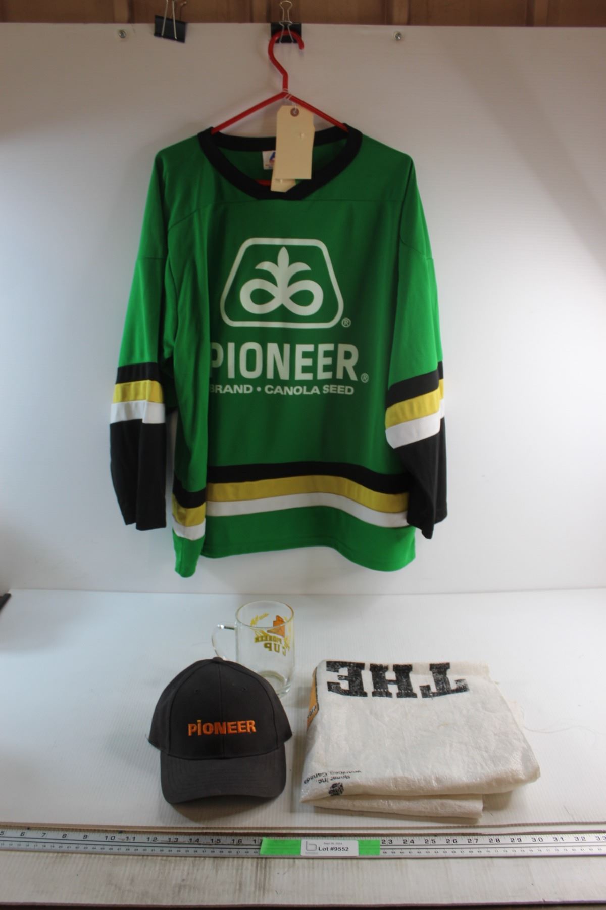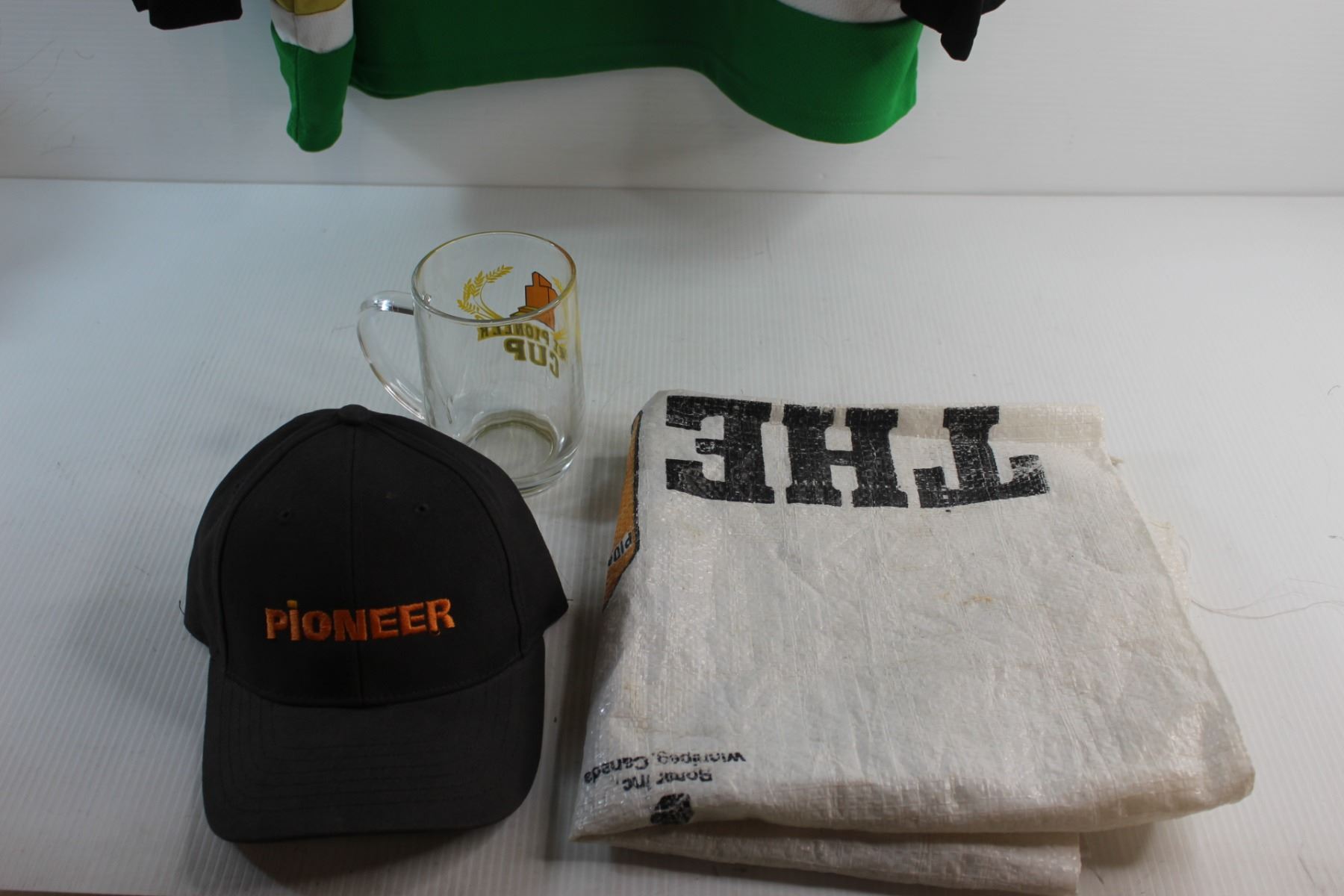 Vintage Pioneer Grain Company Limited 100lb Grain Bag + Vintage Pioneer Ballcap NRMT- + Pioneer 45H28 Canada Hockey Jersey
