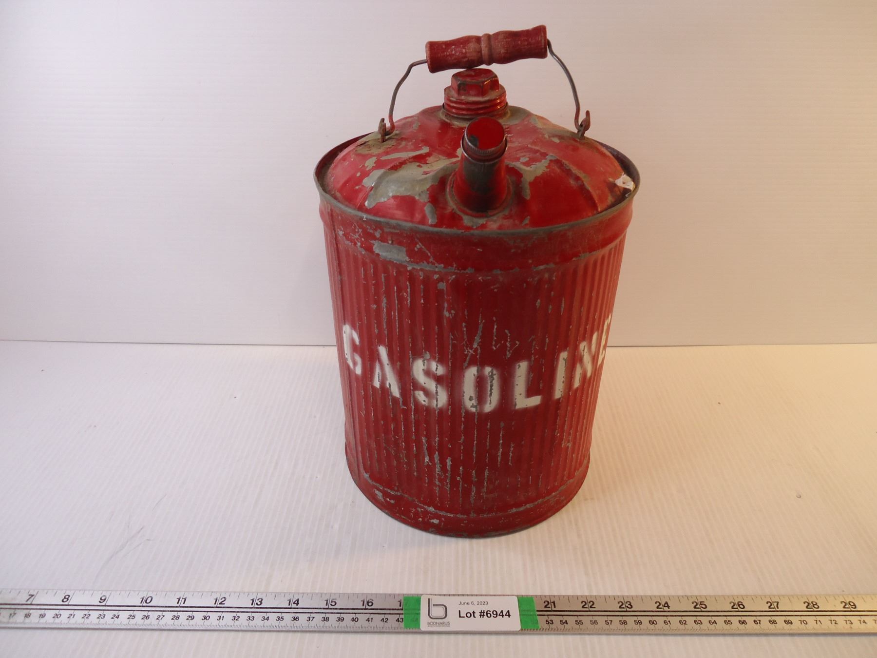 Vintage Red Gasoline Can. Metal Ribbed with Wooden Handle