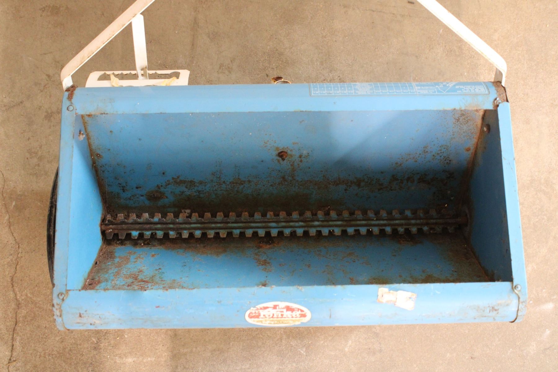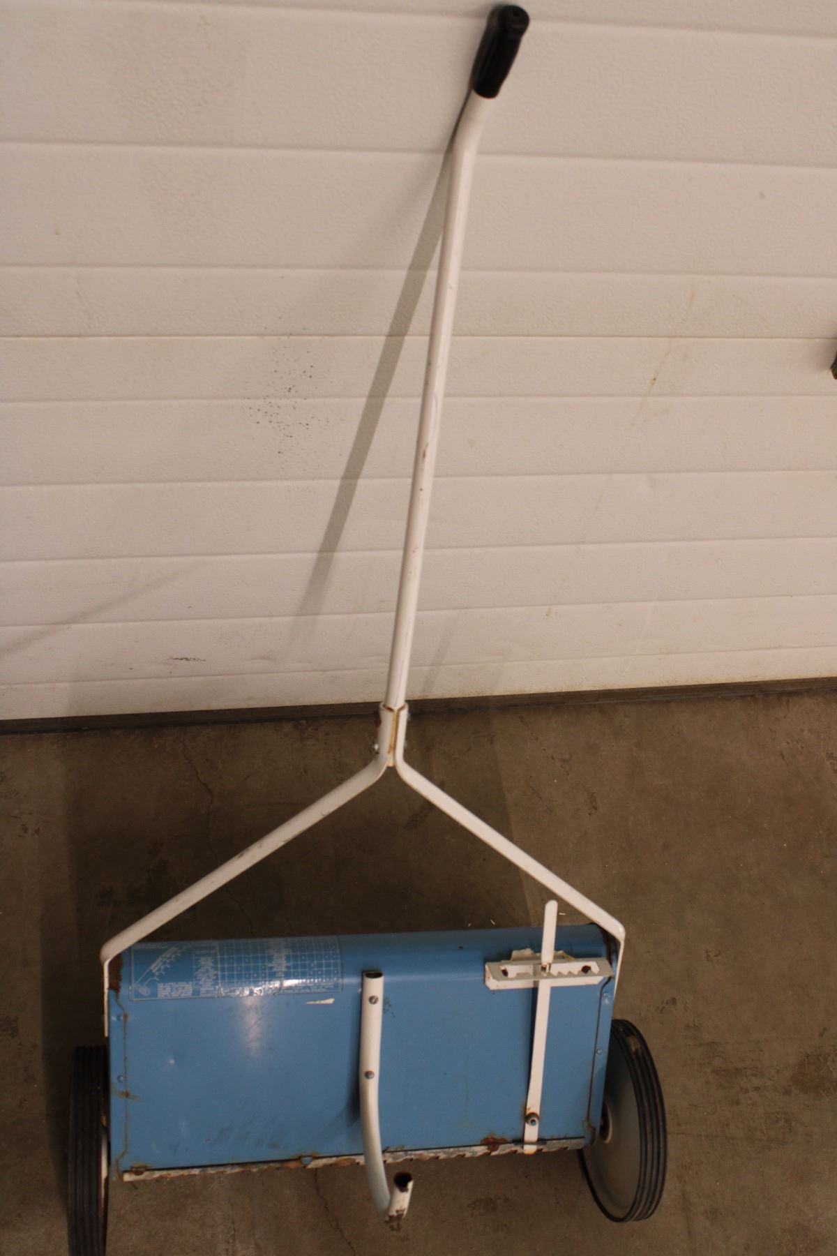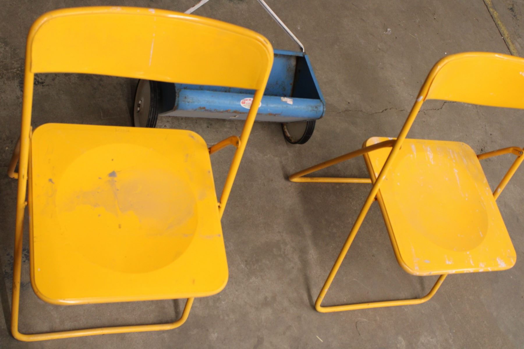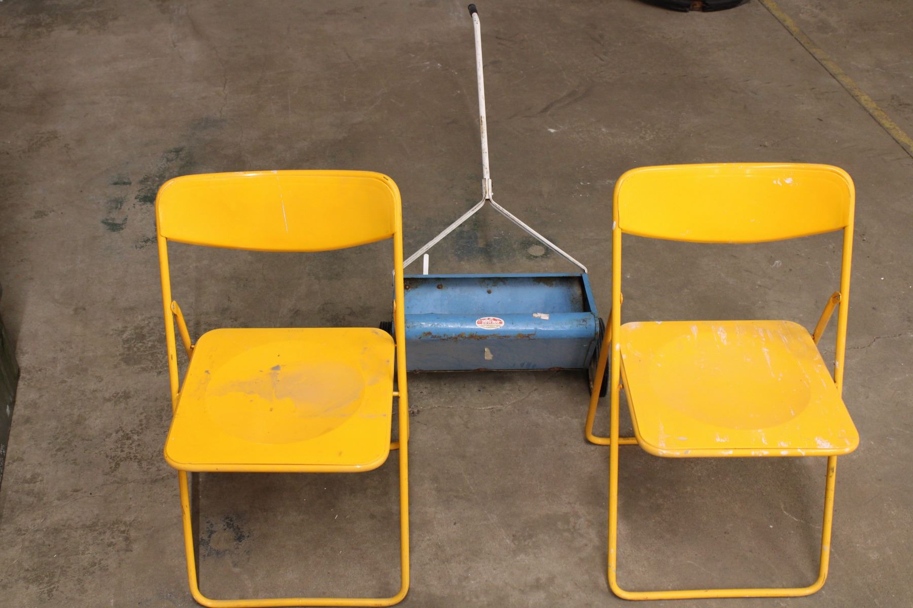 Vintage Seed spreader + 2 yellow folding chairs (plastic seats)